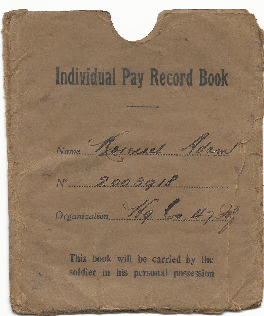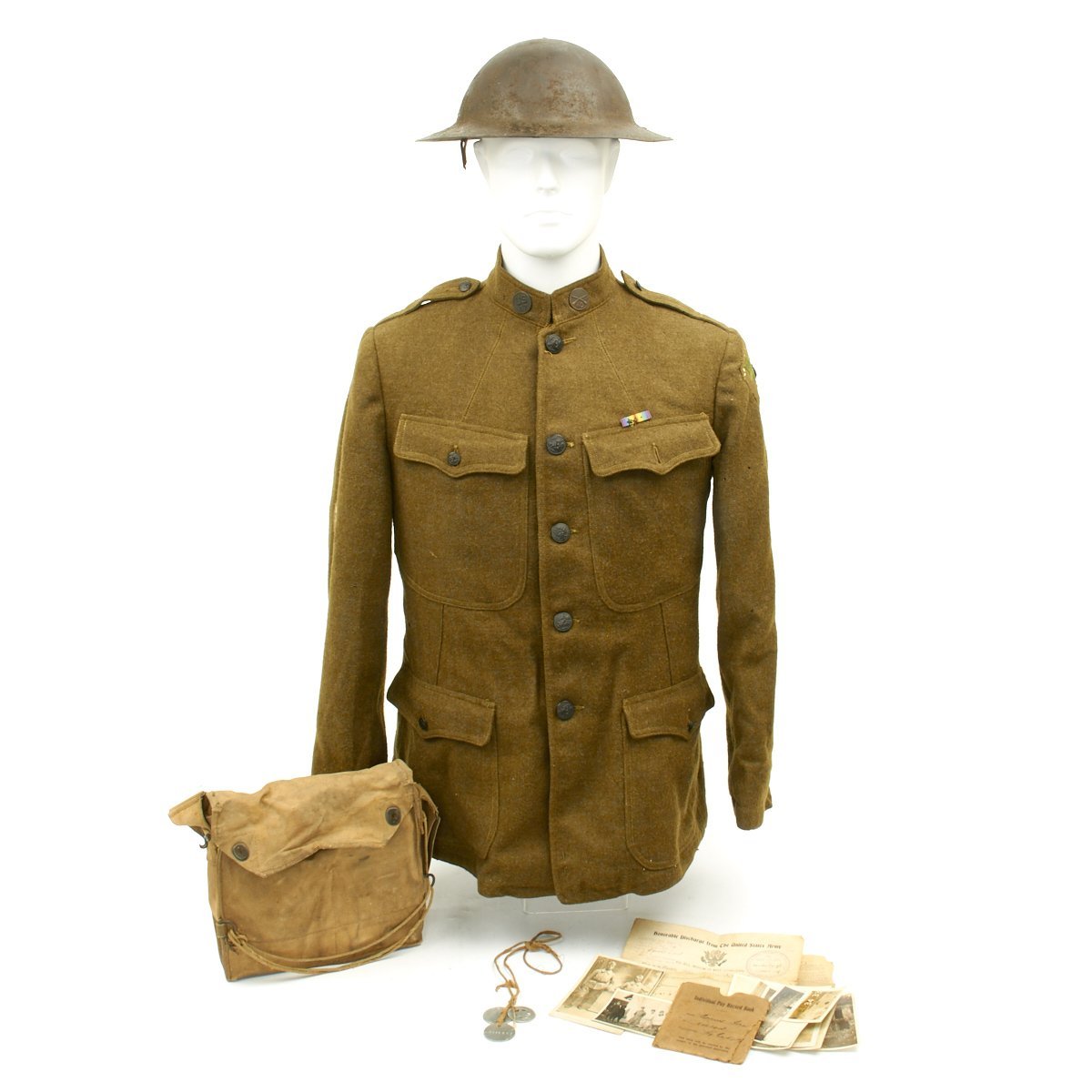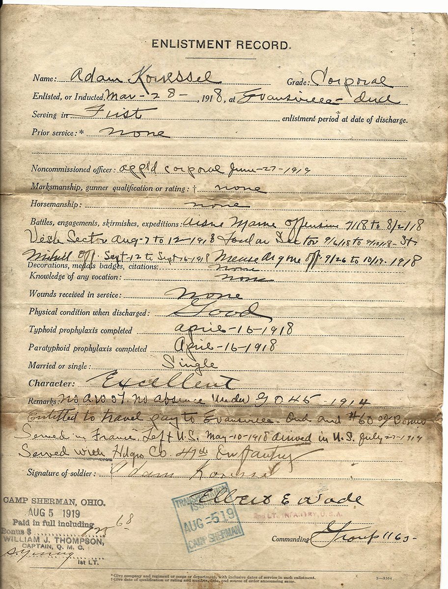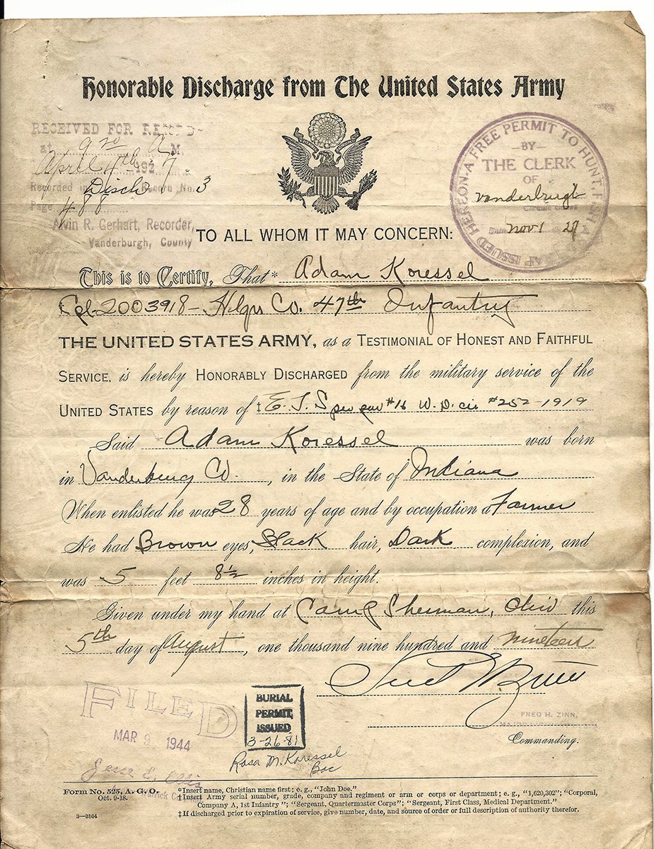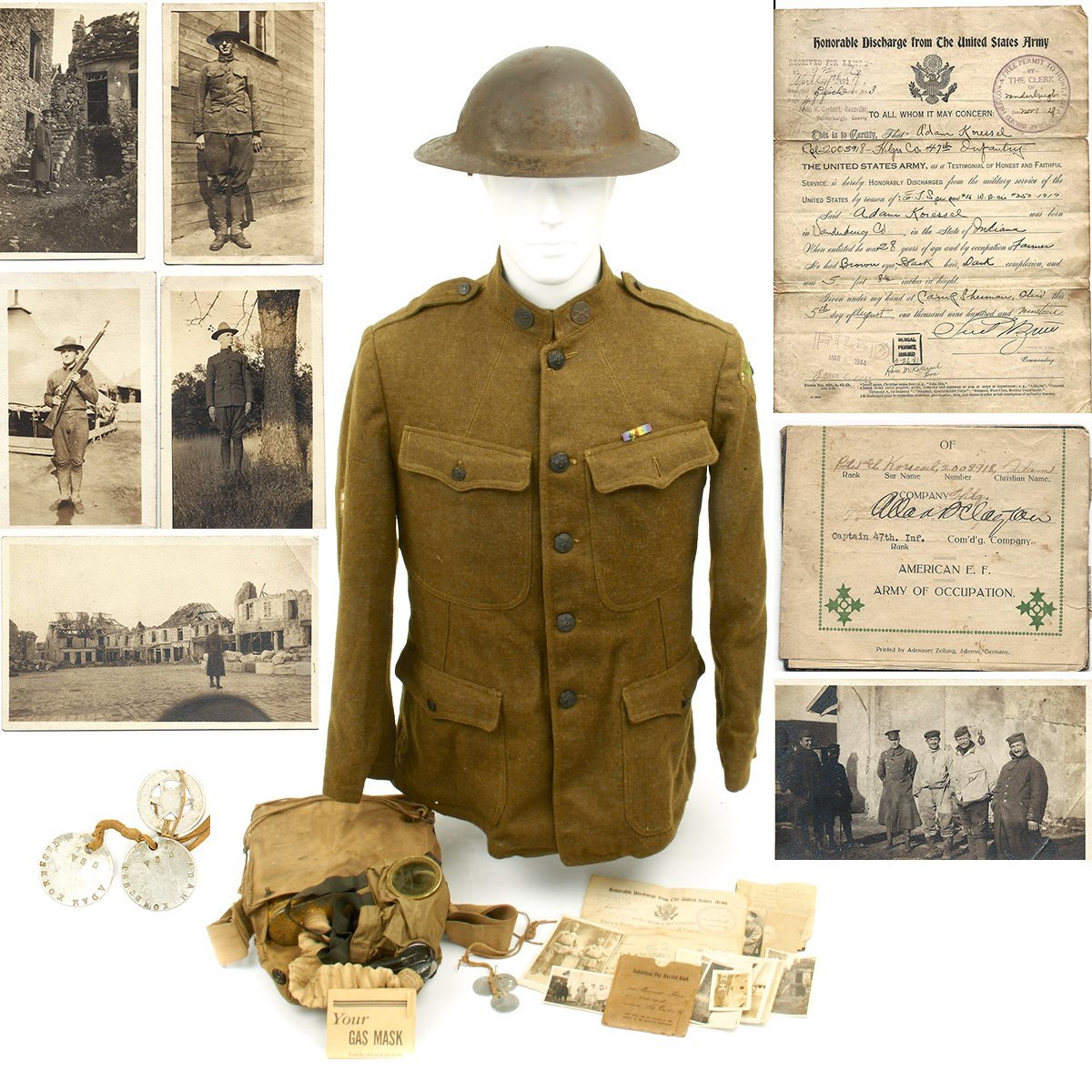 Original Items: One-of-a-kind-set. Corporal Adam Koressel ASN 2003918 of Vanderbyrg, Colrado was born on April 15th, 1889 and enlisted on March 28th, 1918 in Evansville, Indiana. He was a member of the Headquarters Company of the 47th Infantry Regiment. He is documented as fighting in France with the 47th from July to November 1918 at the following battles: Aisne Marne Offensive (7/18 - 8/2/18) , Vesle Sector (8/7 - 8/12/18), Toul (9/6/17 - 9/13/18), St. Mihiel (9/12/18 - 9/16/18), and the immortal Meuse-Argonne (9/26/18 - 10/19/18).