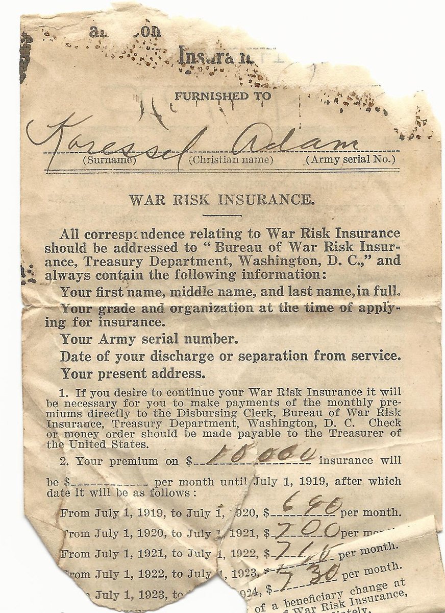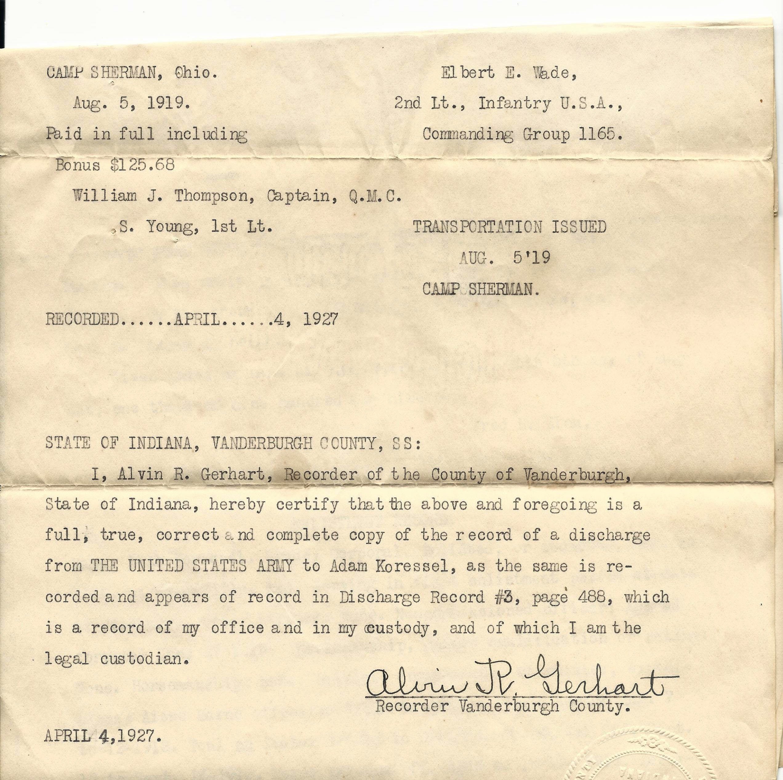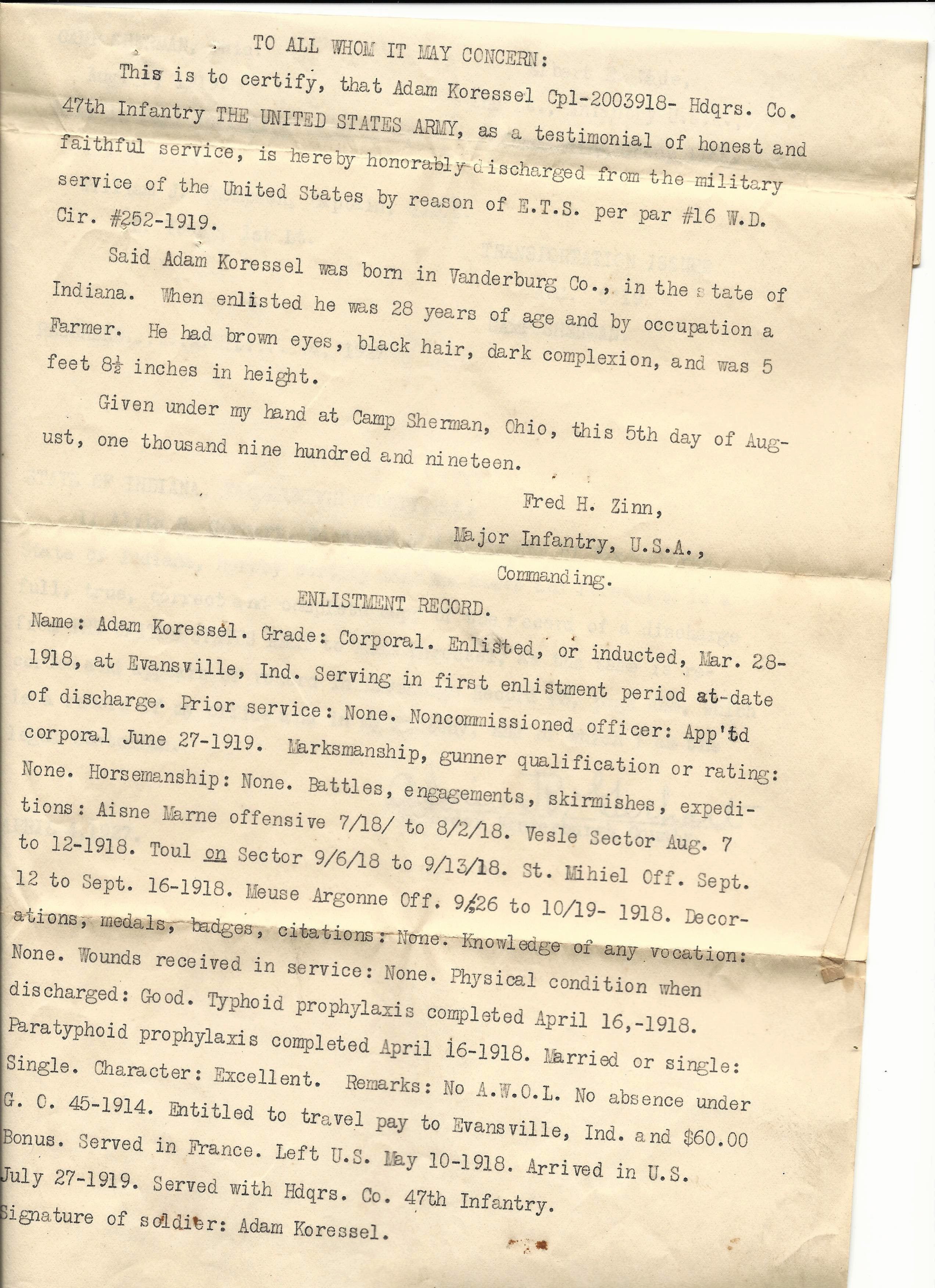 - Original Honorable Discharge dated August 5th, 1919