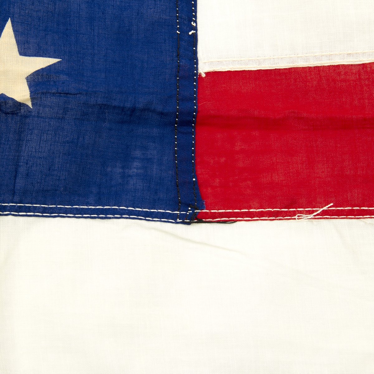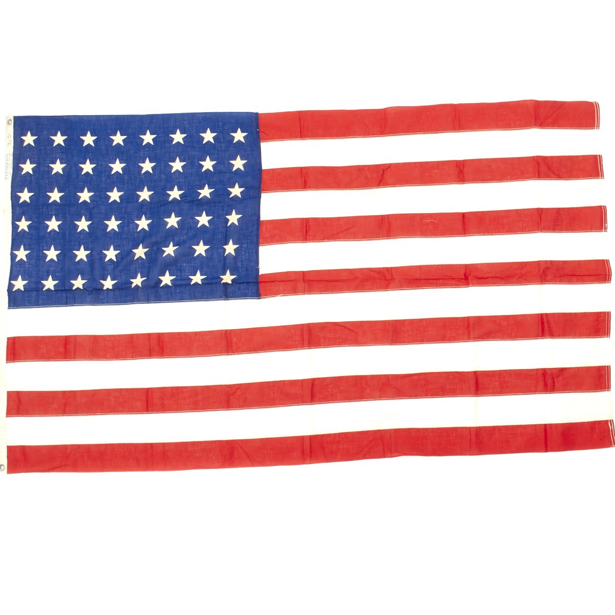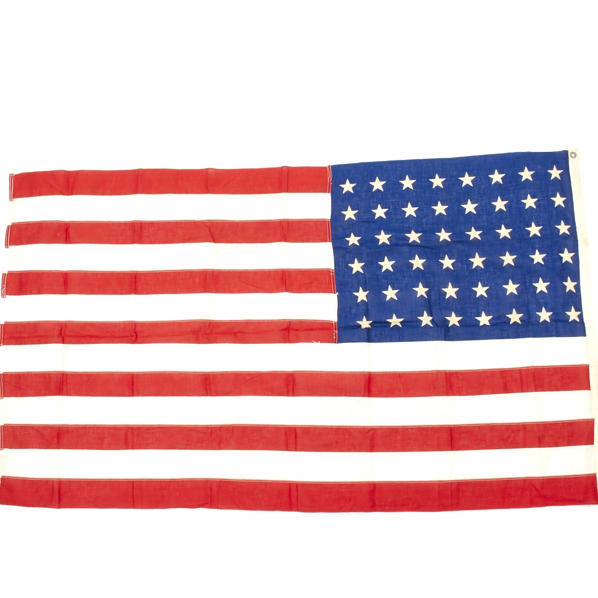Original Item: Only One Available. This is a great 1918-dated example of a U.S. WWI 3 x 5 ft 48 star Linen and Canvas flag. It is virtually unissued, with minimal staining. It is constructed of 14 individual pieces of cloth stitched together, with a heavy canvas header with grommets. It is stamped on the header with PREMIER / REG. U.S. PAT. OFF. / FAST COLORS, as well as the date of 1918 and size 3 x 5 FT.