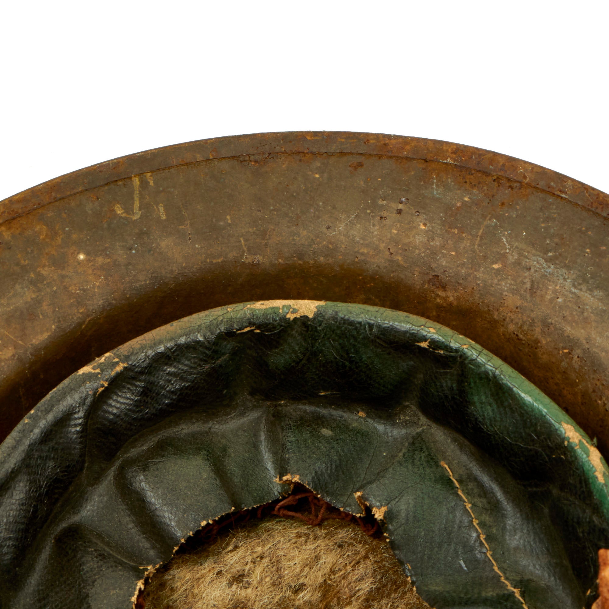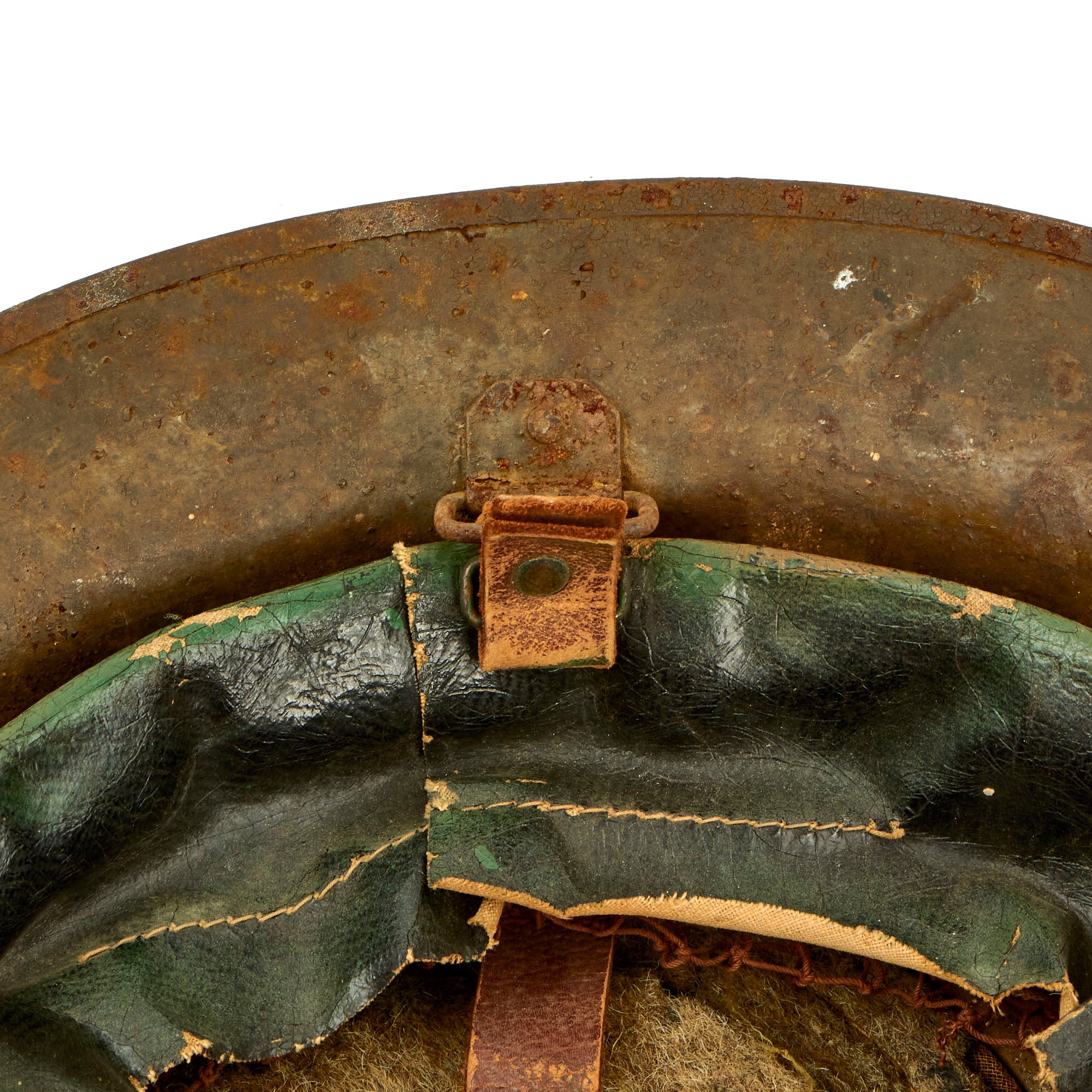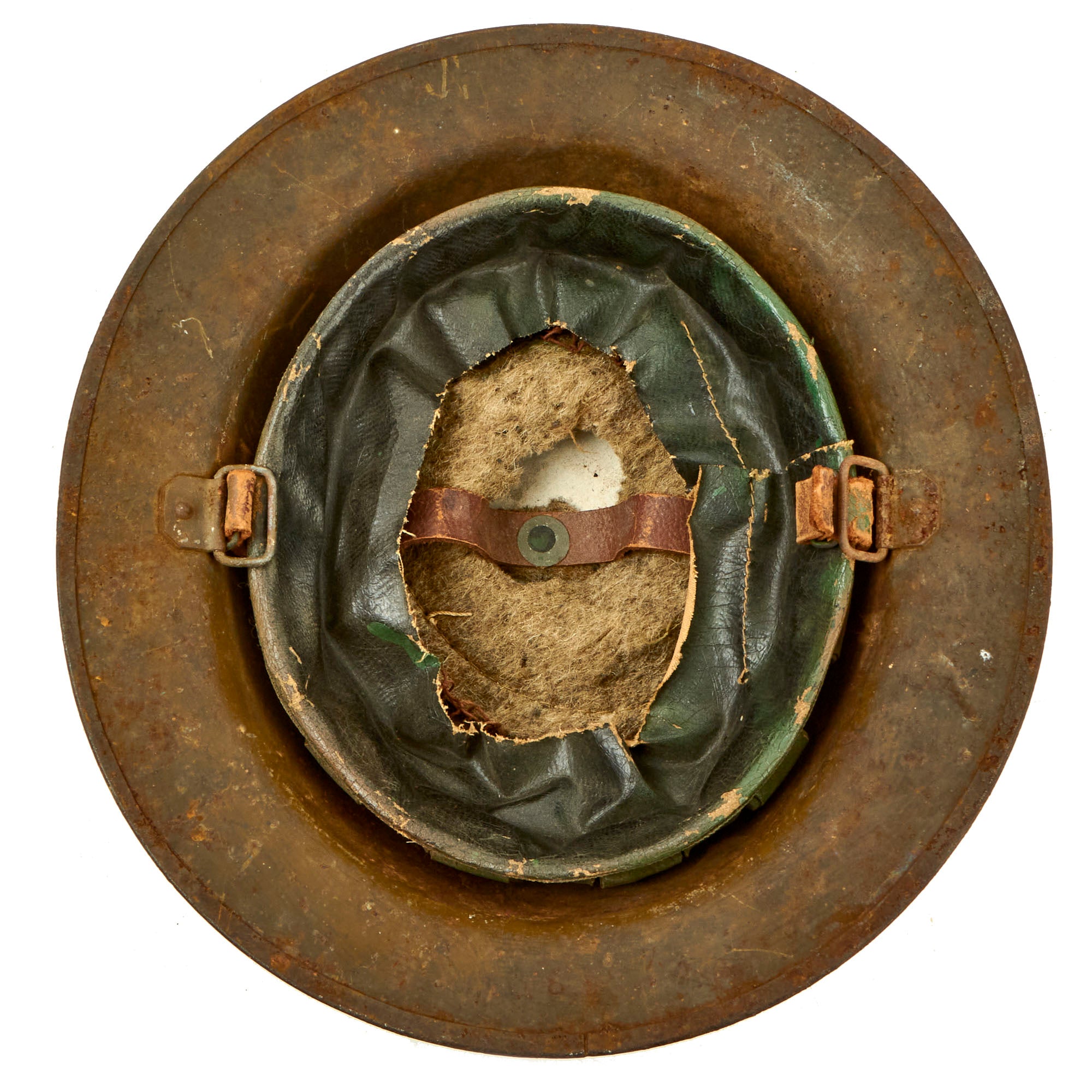 The paint is somewhat worn, and definitely shows use, but it has a great look and the colors are still mostly discernible. The interior of the helmet has most of the original paint present. The liner and upper chinstrap portion is present and in worn condition with wear present and the complete lower half missing. The liner still retains most of the original top felt pad with rubber doughnut, but is missing the paper label.