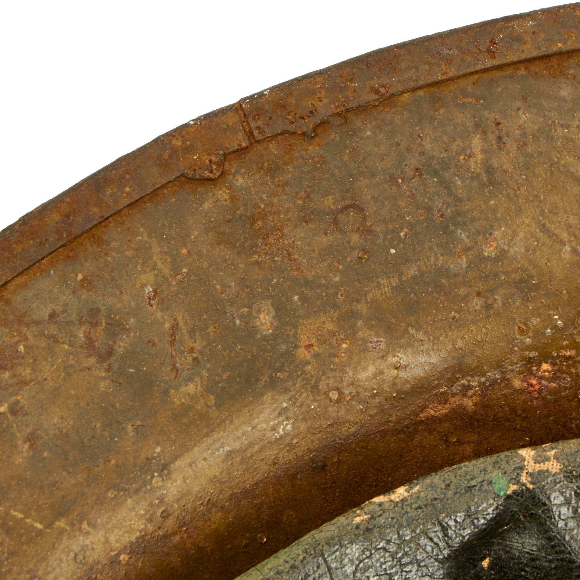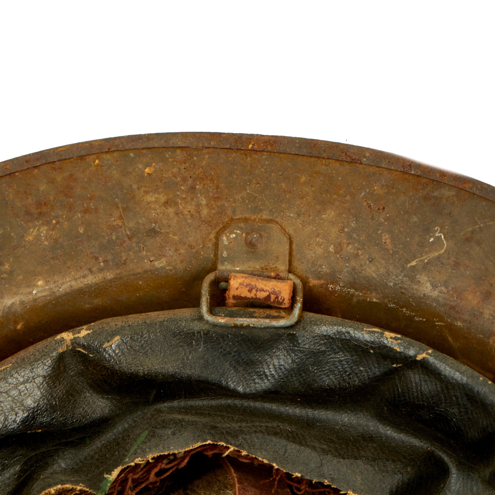 The paint is somewhat worn, and definitely shows use, but it has a great look and the colors are still easily discernible. The underside of the rim is stamped ZC 18 indicating it was produced in the United States, and can be seen on the underside of the skirt towards the front. The solid rivets on the chin strap bales is another method of identifying the helmet as being American made.