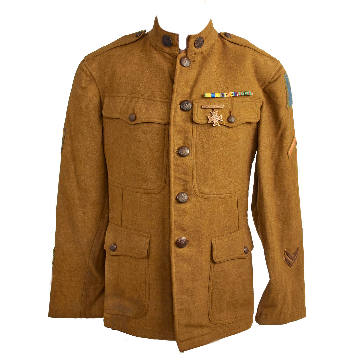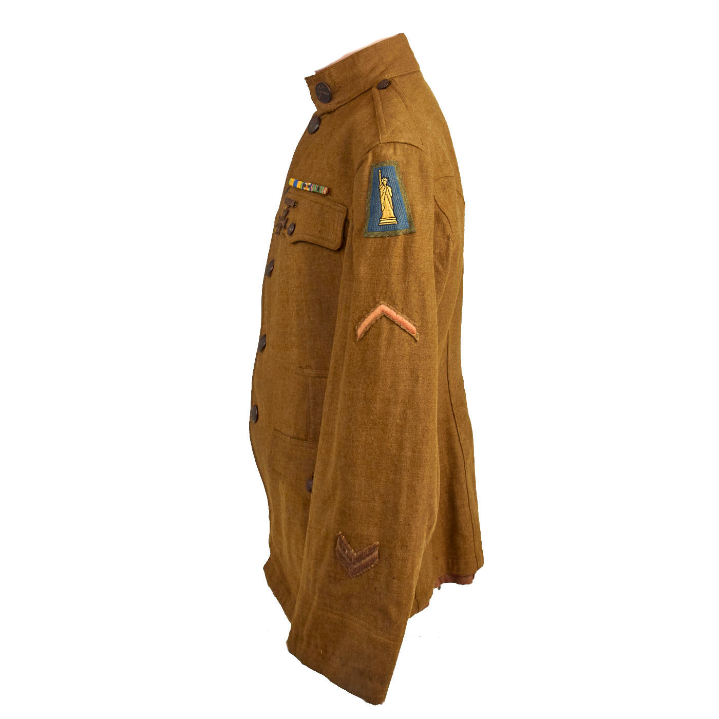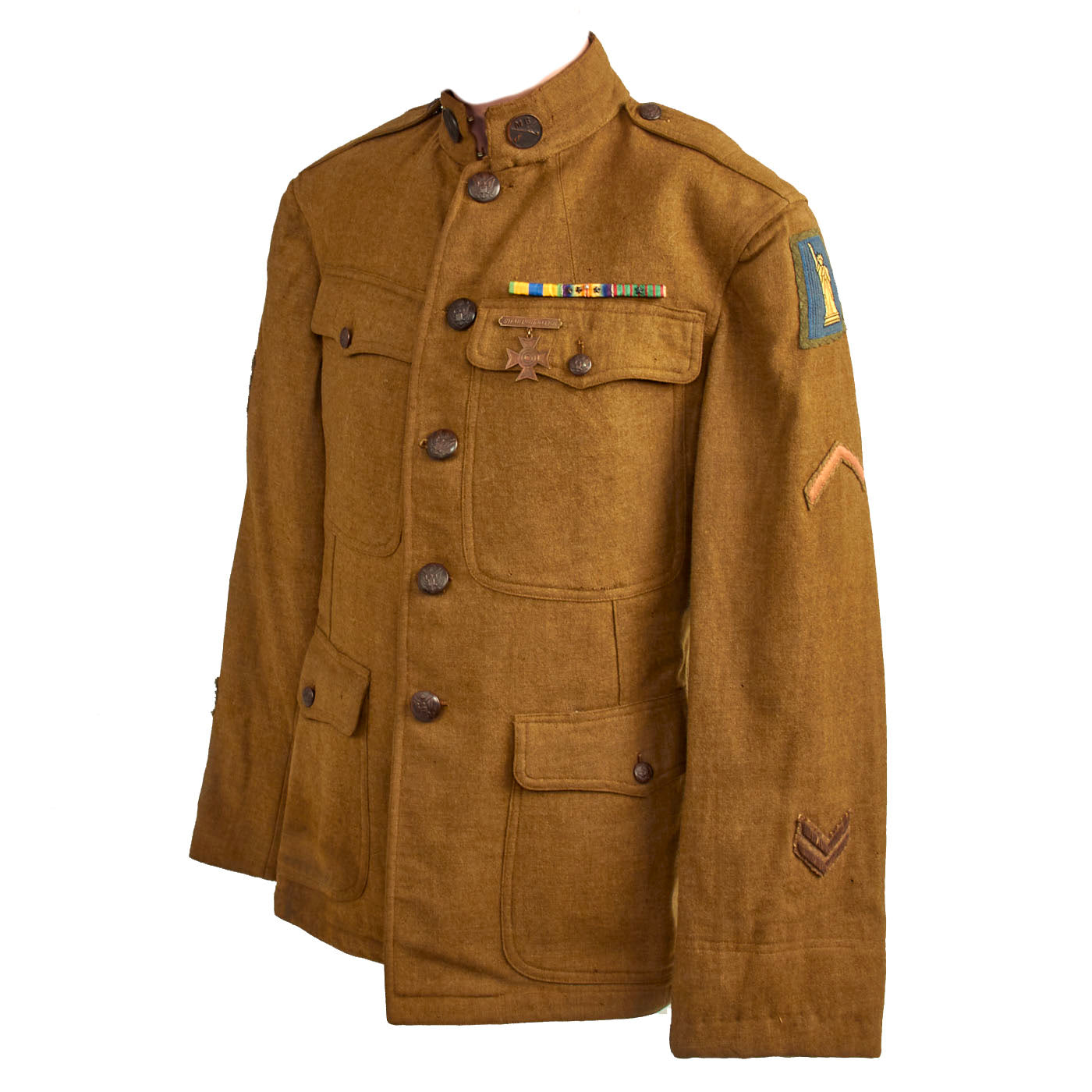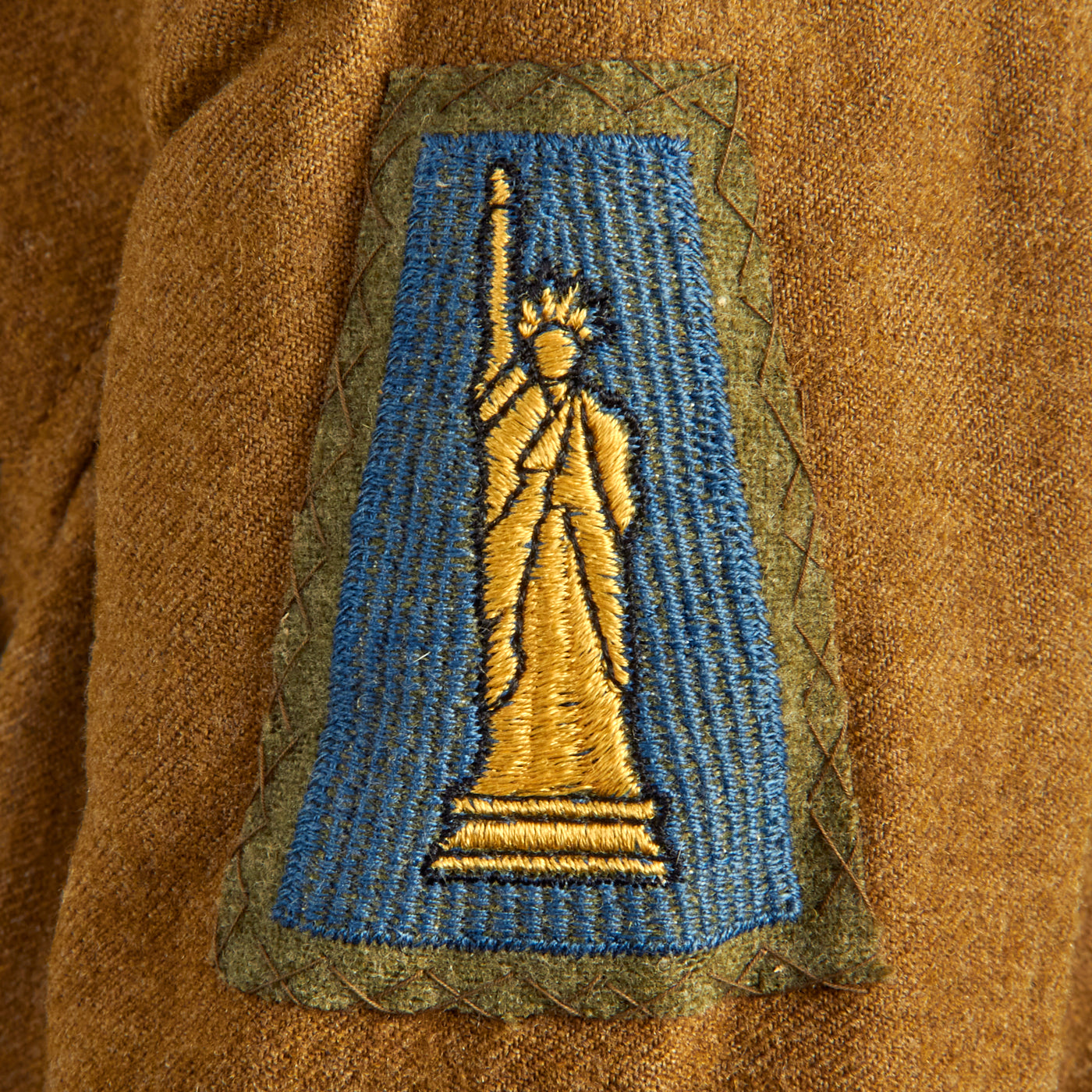 Original Item: Only One Available. This is a wonder set from the Liberty Division tunic and M1917 helmet. We have no proof that this set is part of a member from The Lost Battalion, but that Battalion was part of the 77th and would have worn this same tunic and helmet. The Lost Battalion is the name given to nine companies of the United States 77th Division, roughly 554 men, isolated by German forces during World War I after an American attack in the Argonne Forest in October 1918. Roughly 197 were killed in action and approximately 150 missing or taken prisoner before 194 remaining men were rescued. They were led by Major Charles White Whittlesey. On 2 October, the division quickly advanced into the Argonne, under the belief that French forces were supporting the left flank and two American units including the 92nd Division were supporting the right flank. Unknown to Whittlesey's unit, the French advance had been stalled. Without this knowledge, the Americans had moved beyond the rest of the Allied line and found themselves completely cut off and surrounded by German forces. For the next six days, suffering heavy losses, the men of the division were forced to fight off several attacks by the Germans, who saw the small American units as a threat to their whole line.