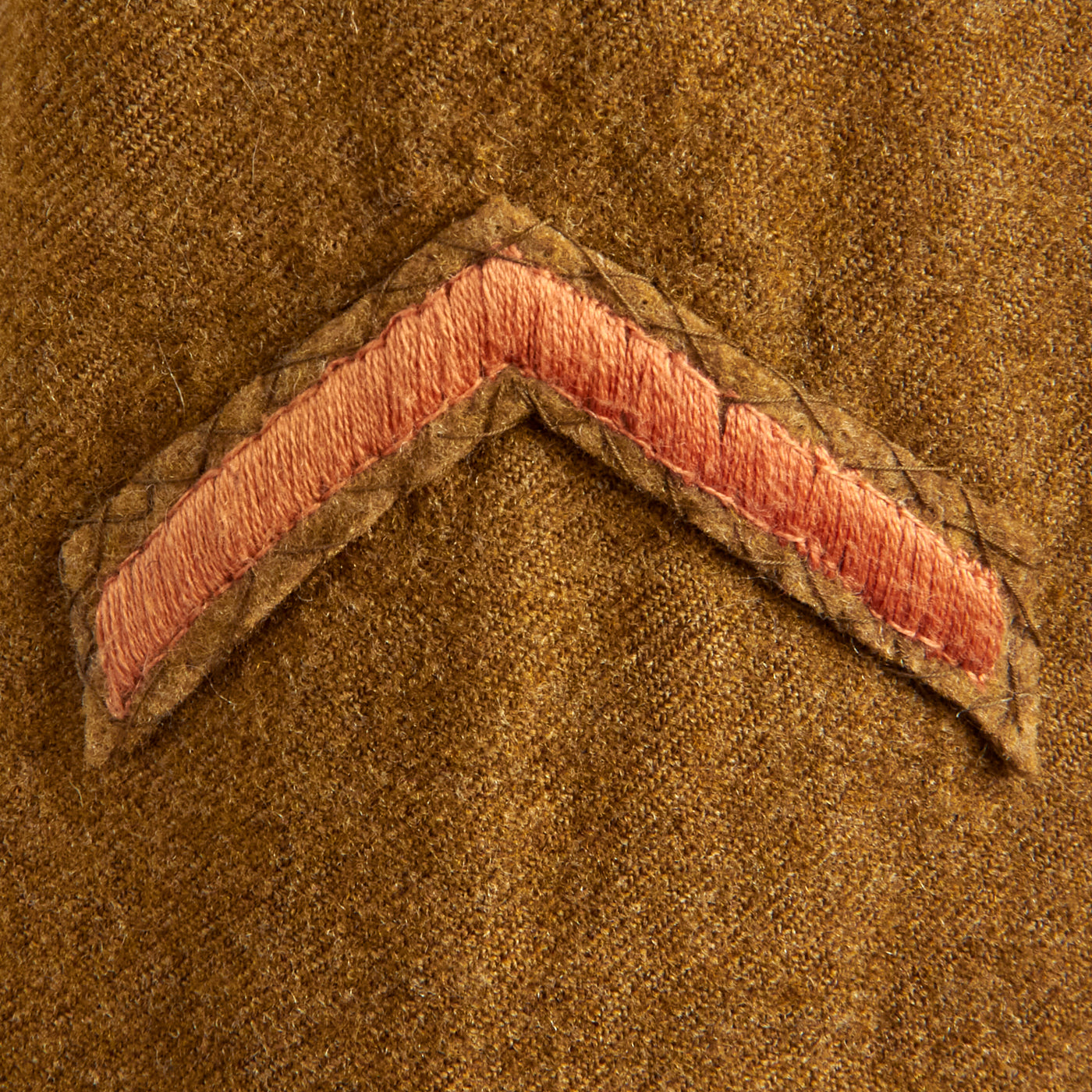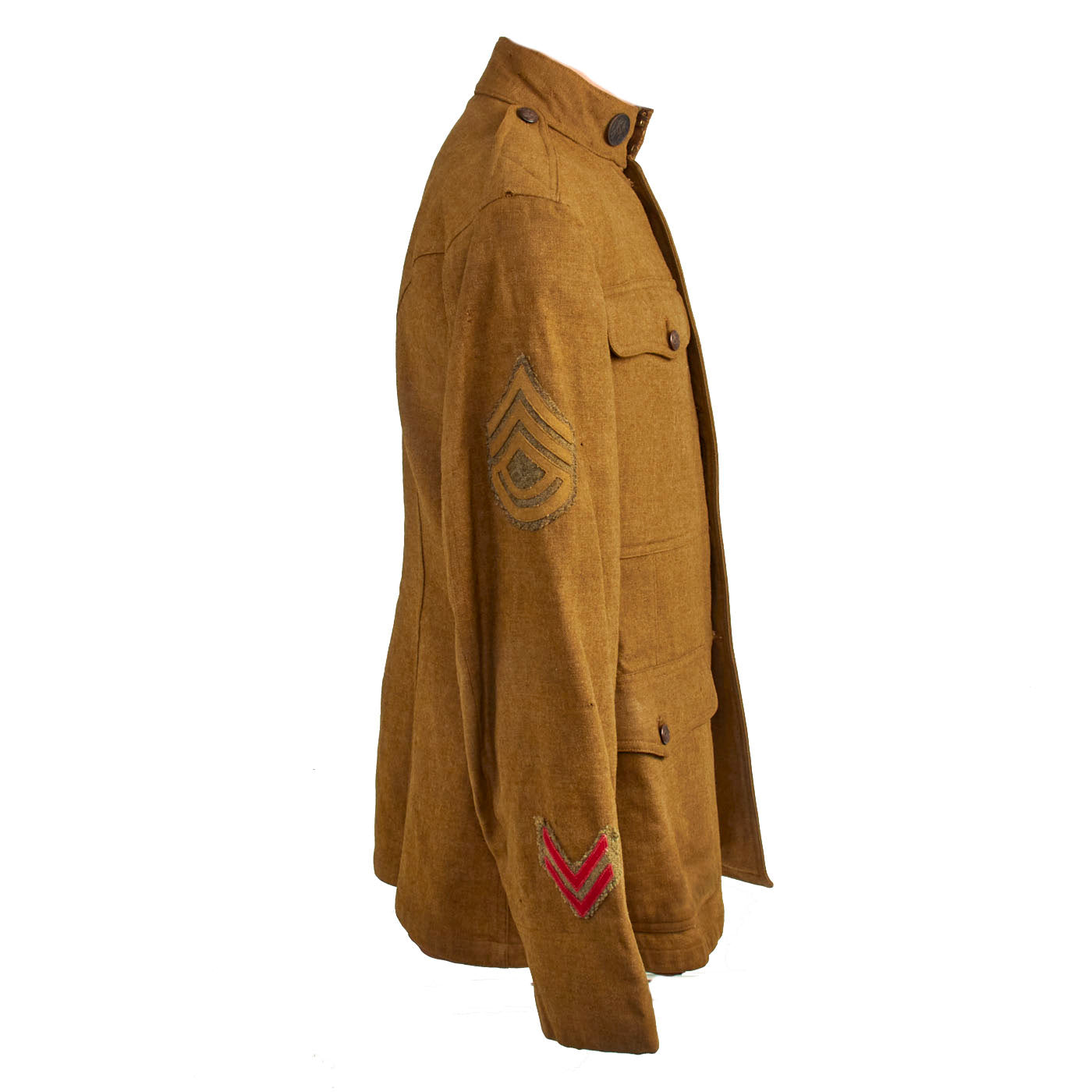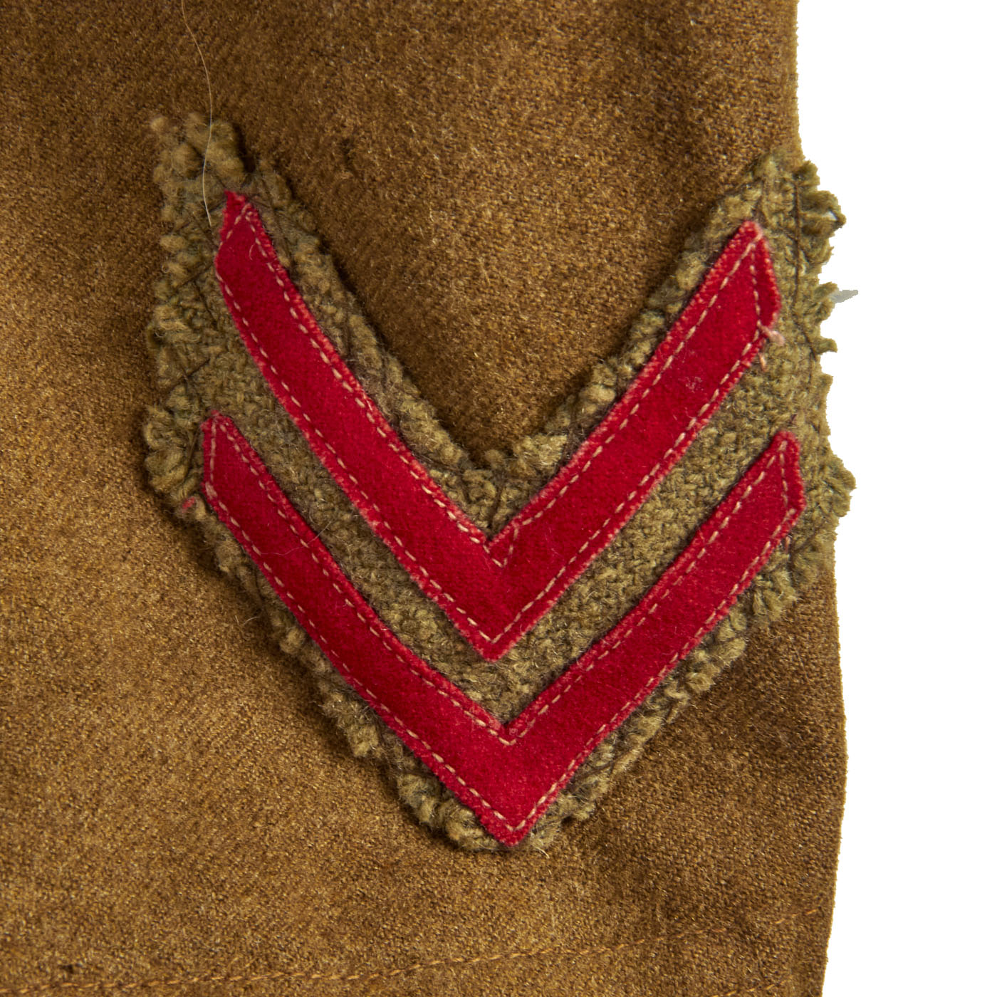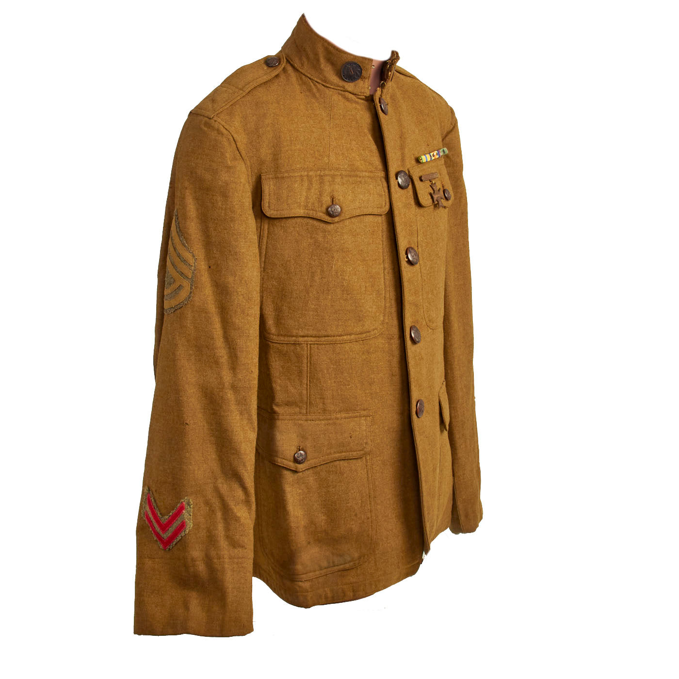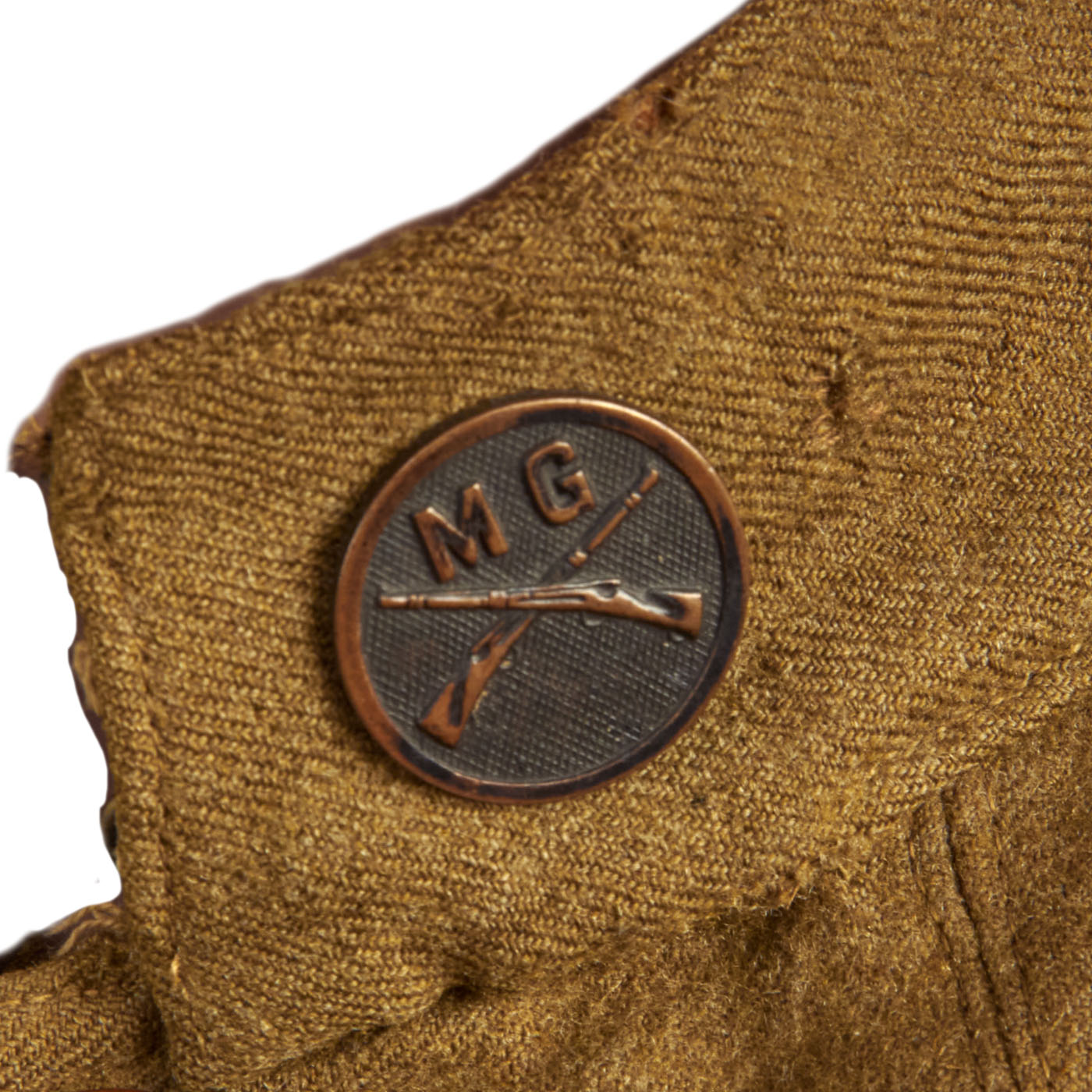 The tunic is a fine example and features a heavy wool construction with cotton lining, 77th division lady liberty patch on left shoulder, battalion sergeant major chevron on right shoulder, 2 inverted red service chevrons, honorable discharge chevron on the left shoulder with 2 overseas stripes on the lower left sleeve. The collar discs are the US National Army monogram and an “MG” crossed rifles disc. There are 3 ribbons on the left breast for Mexican Service, WWI Victory Medal (3 Bronze and 1 Silver Star) and a Croix de Guerre with bronze star device. Beneath the ribbons on the pocket flap is a sharpshooter badge.