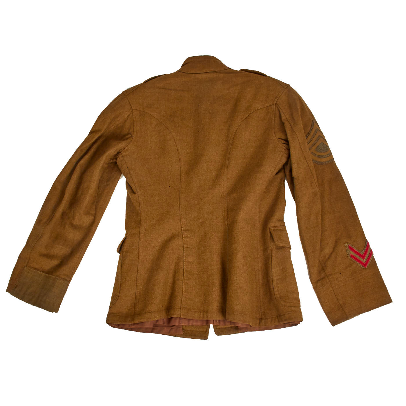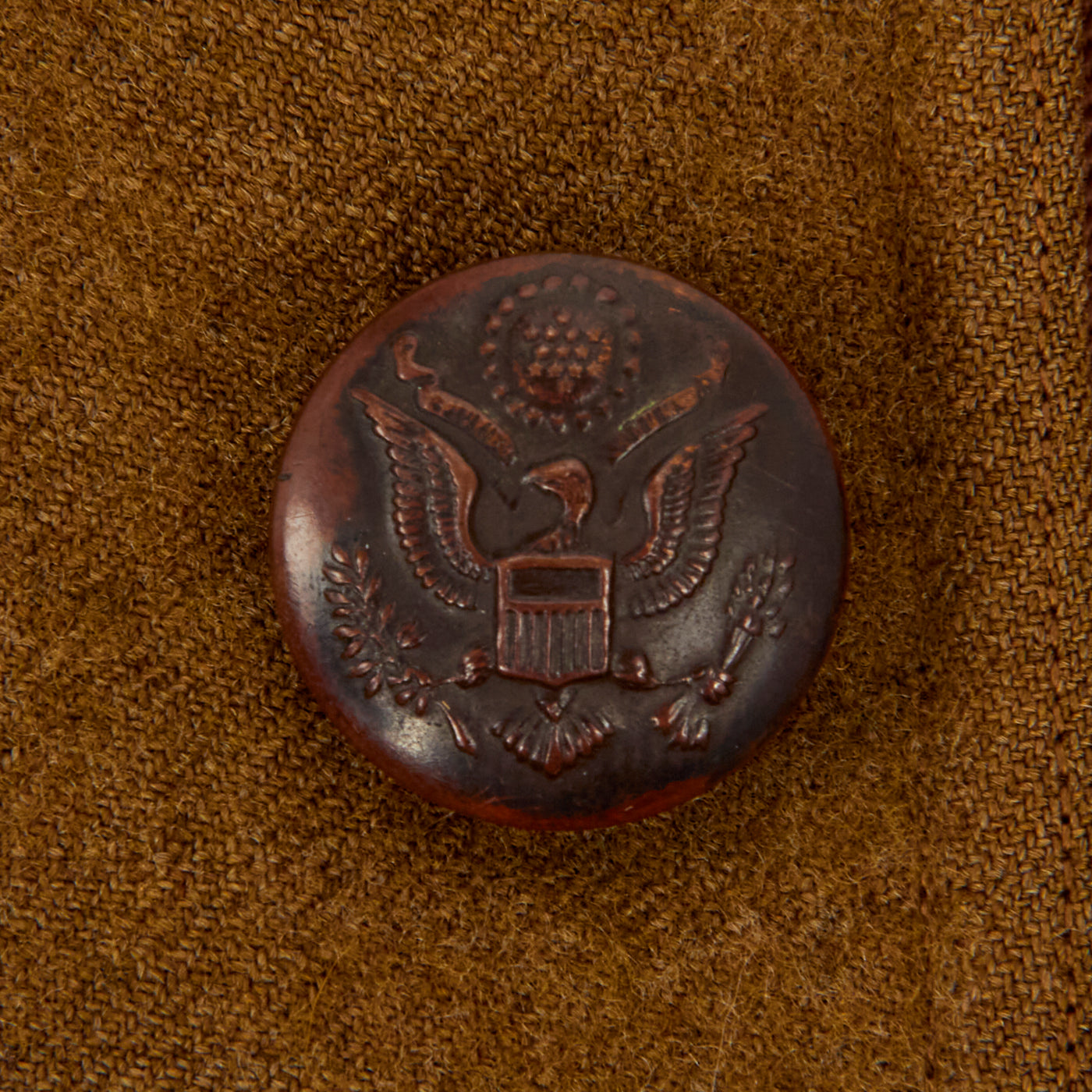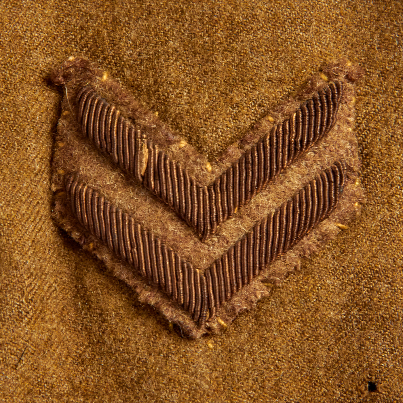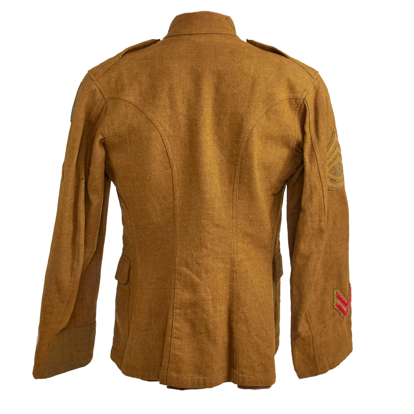 The tunic is a fine example and features a heavy wool construction with cotton lining, 77th division lady liberty patch on left shoulder, battalion sergeant major chevron on right shoulder, 2 inverted red service chevrons, honorable discharge chevron on the left shoulder with 2 overseas stripes on the lower left sleeve. The collar discs are the US National Army monogram and an “MG” crossed rifles disc. There are 3 ribbons on the left breast for Mexican Service, WWI Victory Medal (3 Bronze and 1 Silver Star) and a Croix de Guerre with bronze star device. Beneath the ribbons on the pocket flap is a sharpshooter badge.