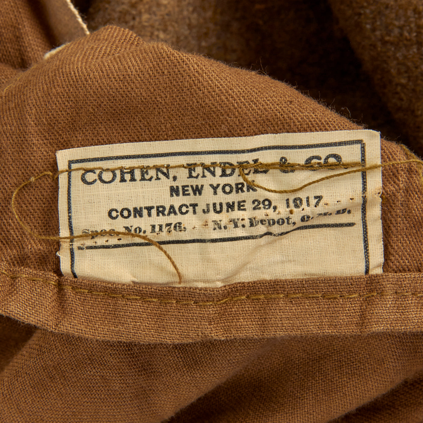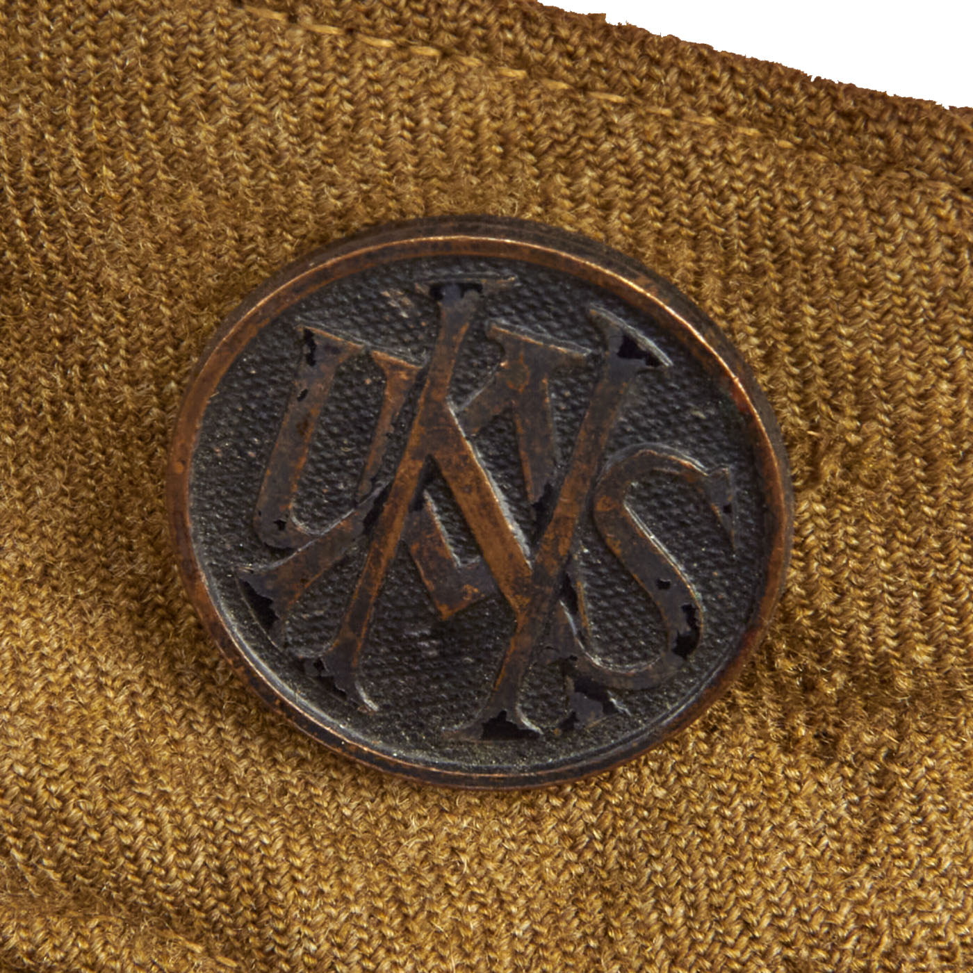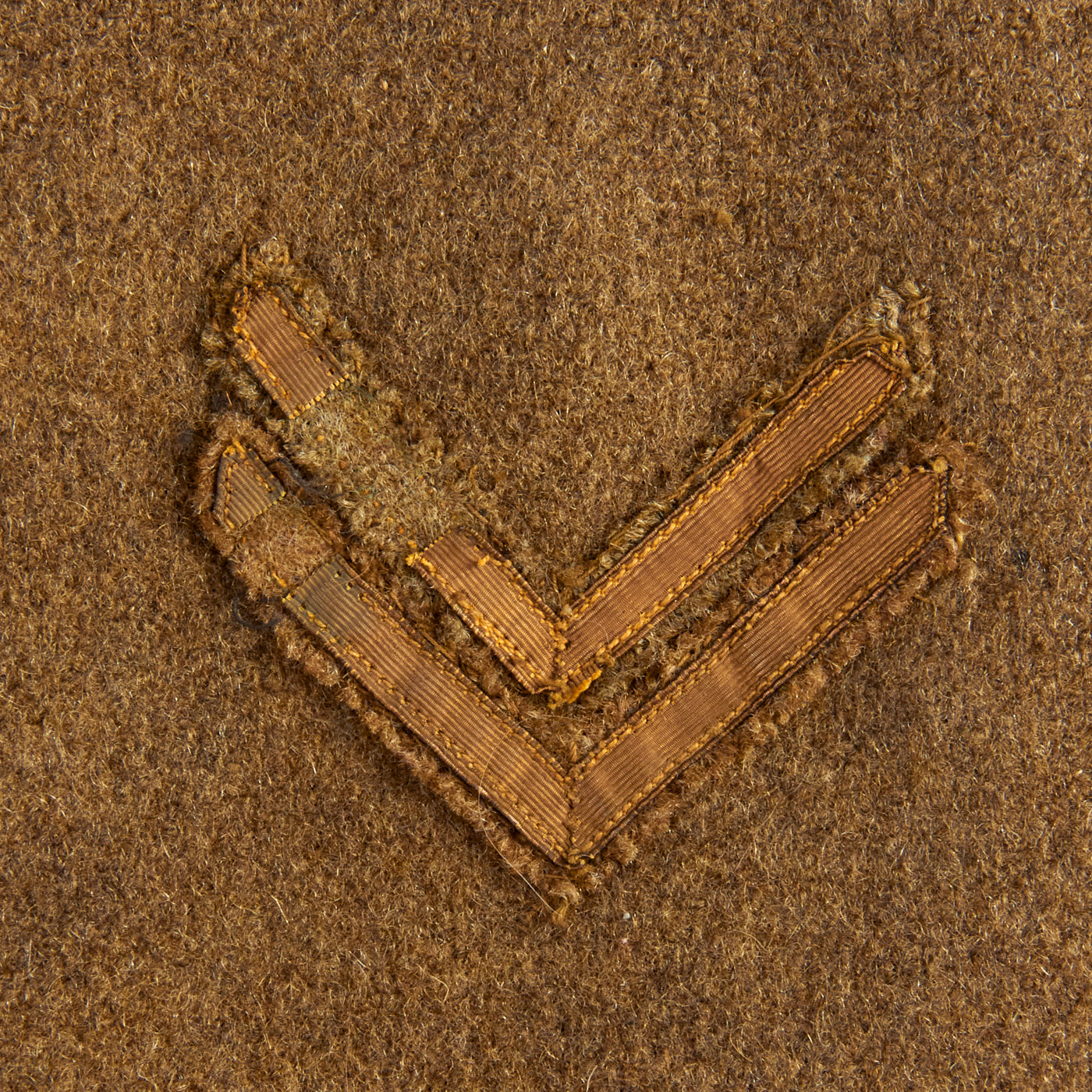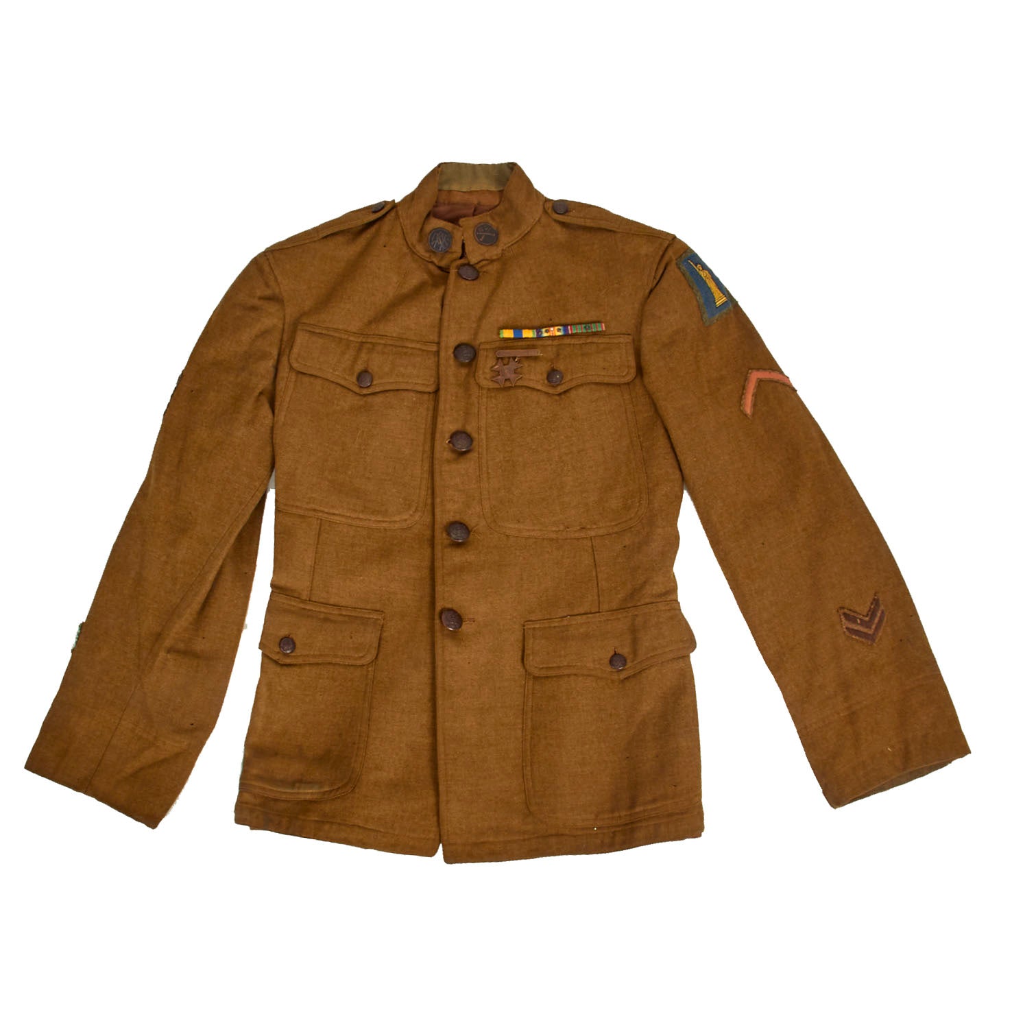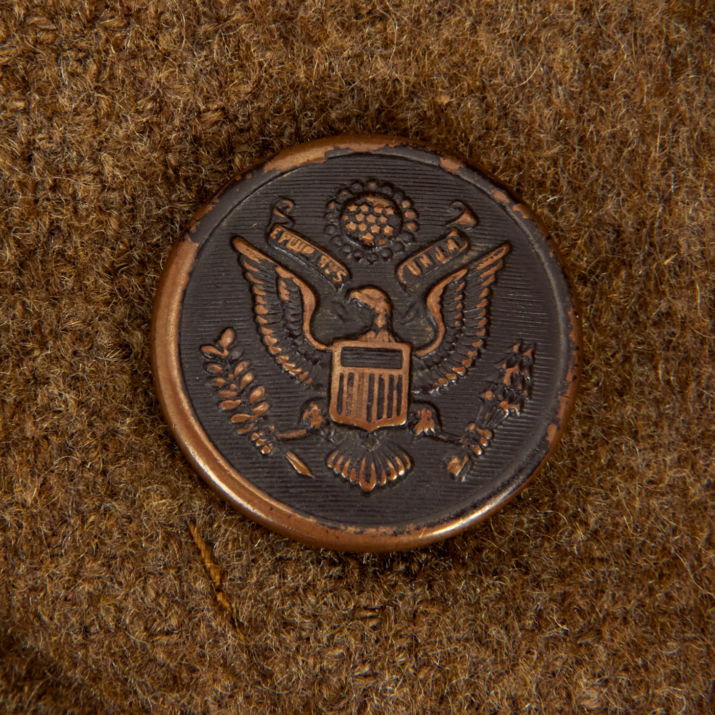 The tunic is a fine example and features a heavy wool construction with cotton lining, 77th division lady liberty patch on left shoulder, battalion sergeant major chevron on right shoulder, 2 inverted red service chevrons, honorable discharge chevron on the left shoulder with 2 overseas stripes on the lower left sleeve. The collar discs are the US National Army monogram and an “MG” crossed rifles disc. There are 3 ribbons on the left breast for Mexican Service, WWI Victory Medal (3 Bronze and 1 Silver Star) and a Croix de Guerre with bronze star device. Beneath the ribbons on the pocket flap is a sharpshooter badge.