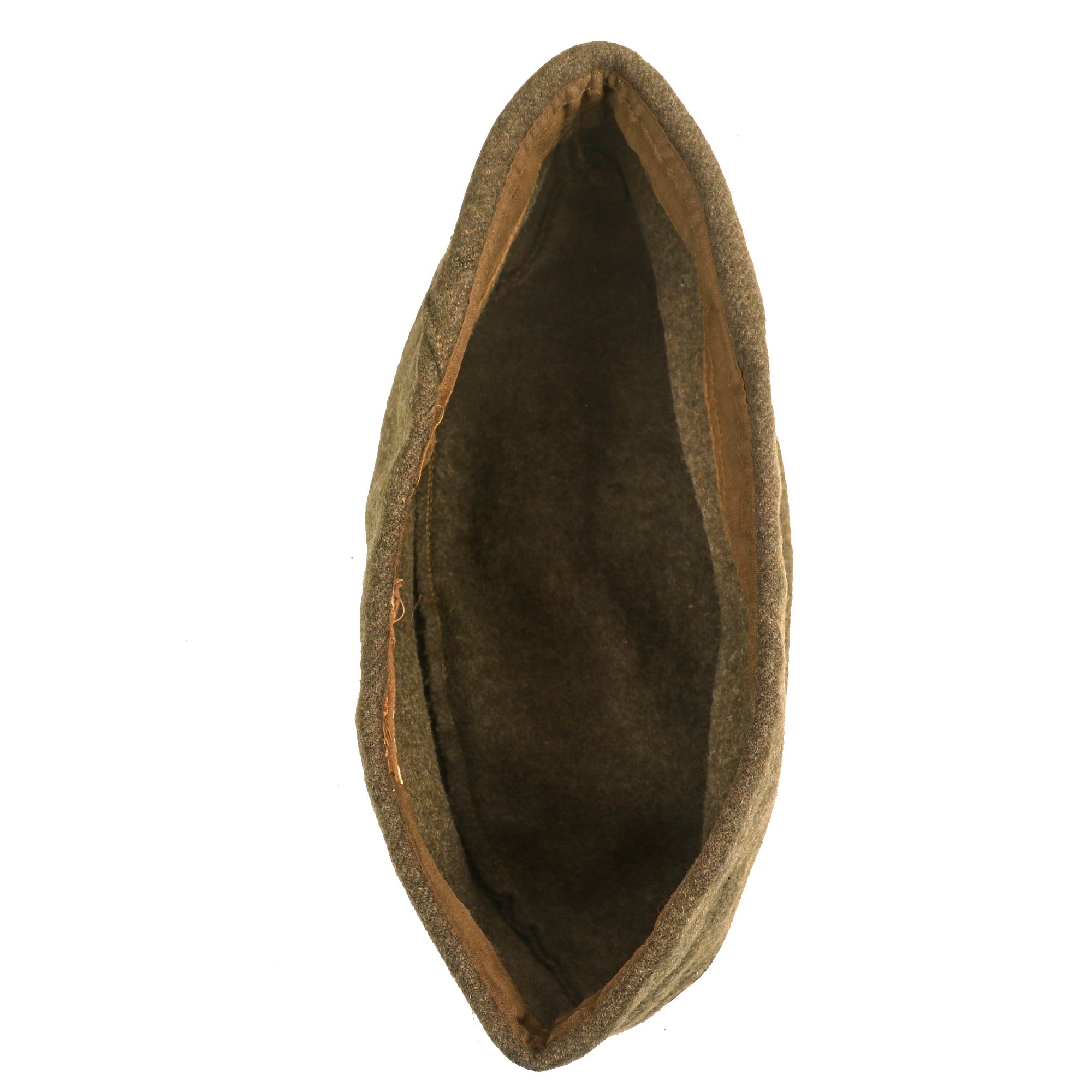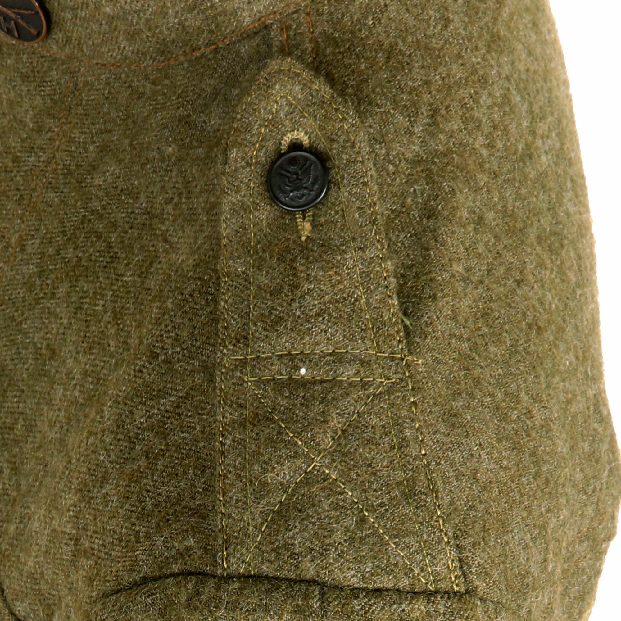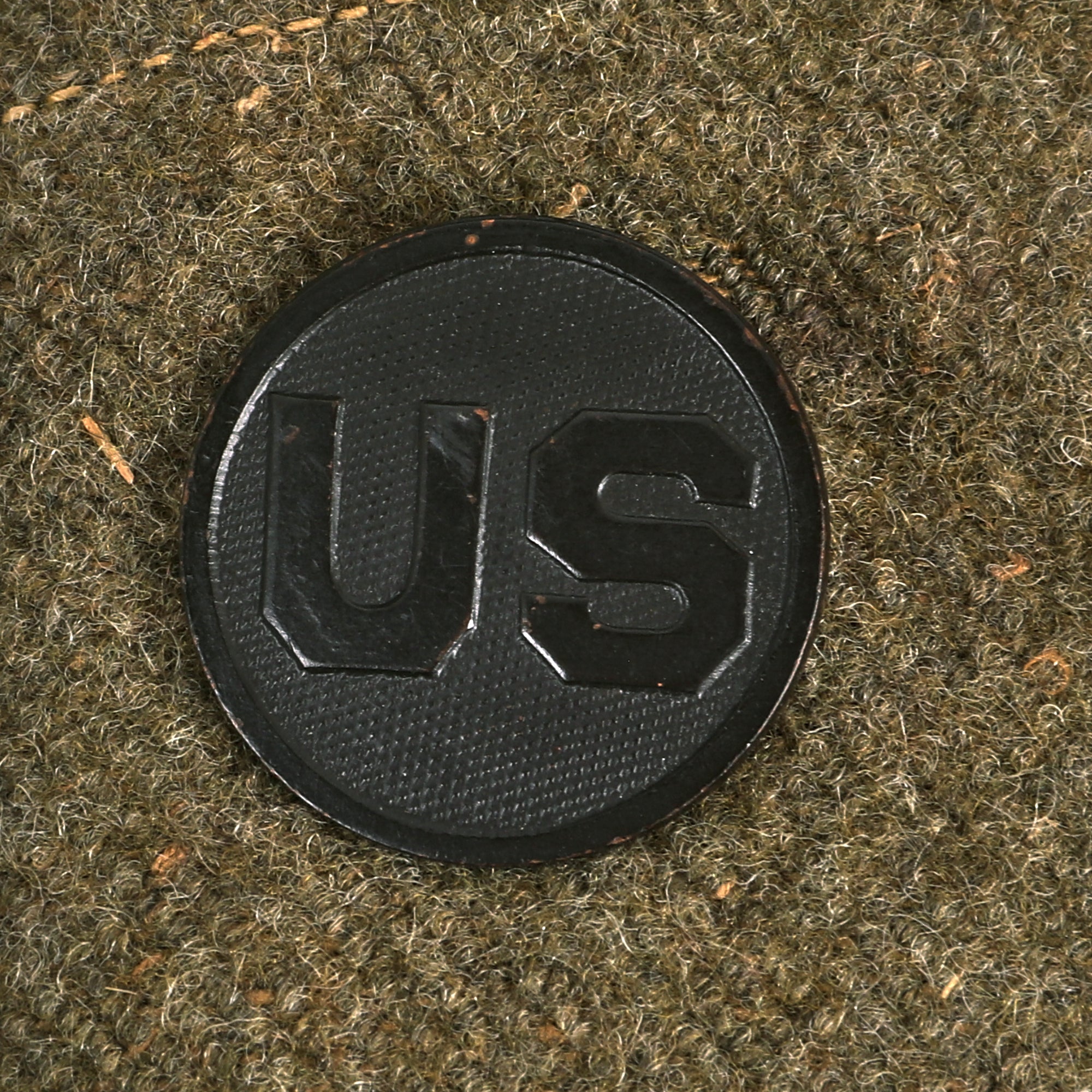 This jacket bears a patch for the 80th Division on the left shoulder, with hand-stitched waves, as well as a red honorable discharge chevron and two overseas chevrons. There is a wound chevron on the right sleeve, and the collar has US & Infantry Company H collar discs. That makes this soldier a private in Company H of the 317th, 318th, 319th, or 320th Infantry Regiment. The overseas cap has a US collar disc.