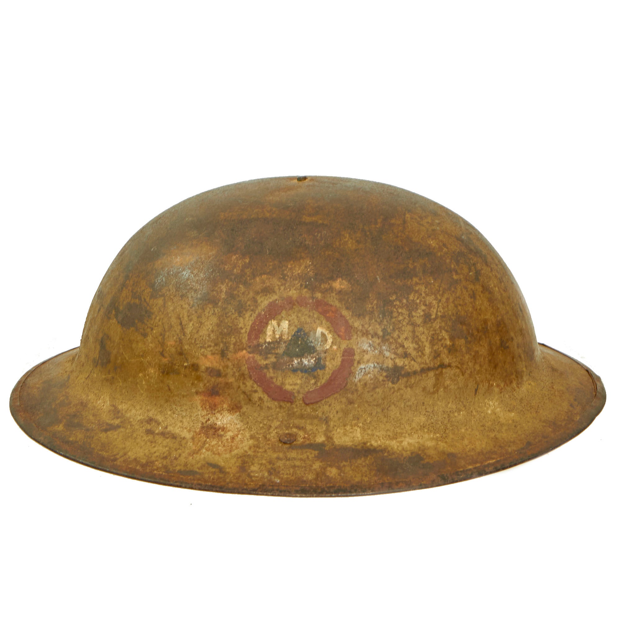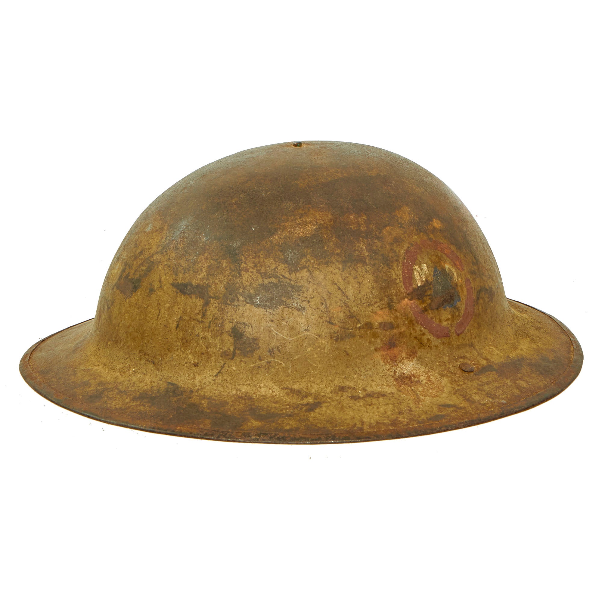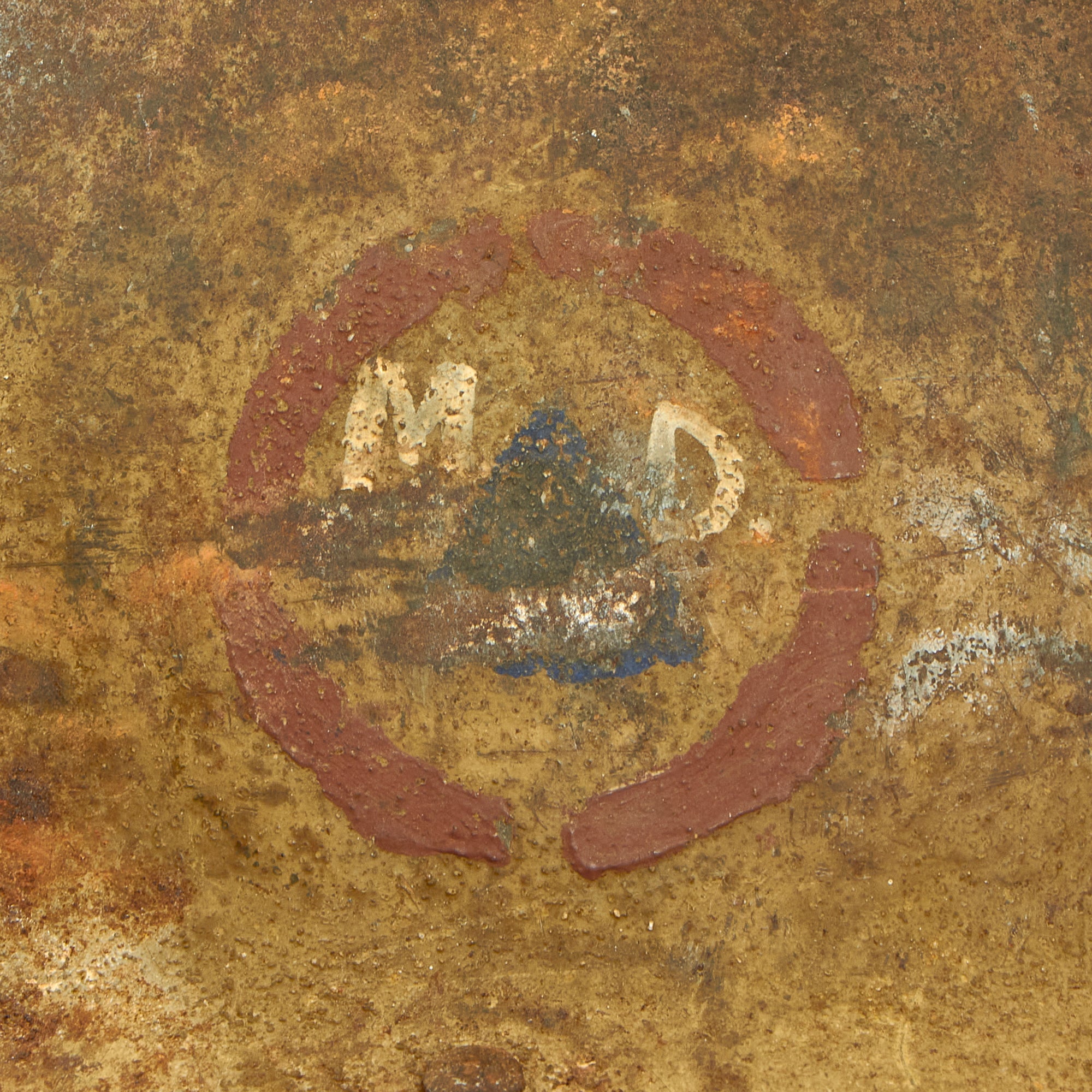 The heat stamp on the underside of the rim is HS 423, a nice and low lot number for a helmet manufactured by Hadfield Ltd of Sheffield. The heat stamp and the split rivets on the chinstrap bales are a solid indication and a good reference point for identifying British made helmets for American use during the Great War. The best feature on this helmet is the hand painted 80th Infantry Division Field Artillery insignia on the left hand side. The insignia consists of a red circle with 4 “breaks” in the red ring, a blue triangle in the center with “M” and “D” on each side. We have not been able to determine which exact element this was, making for a wonderful research opportunity. The insignia is faded slightly and retained at approximately 80 percent.