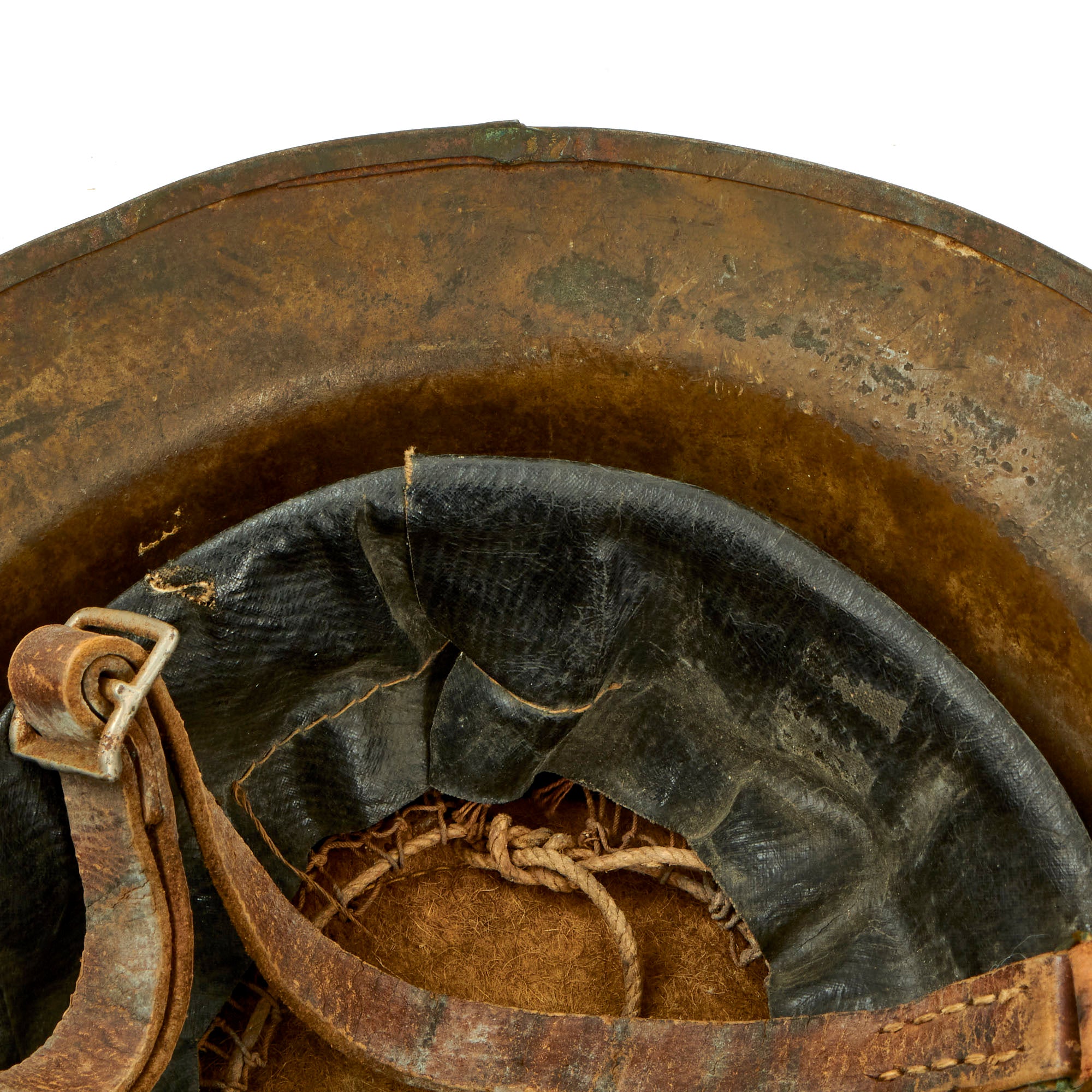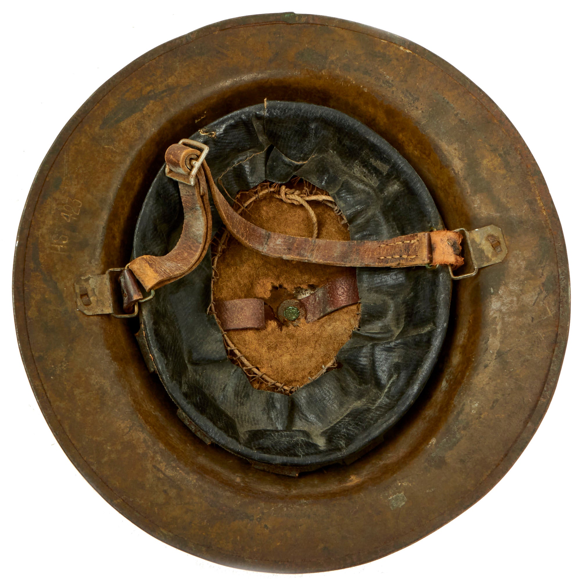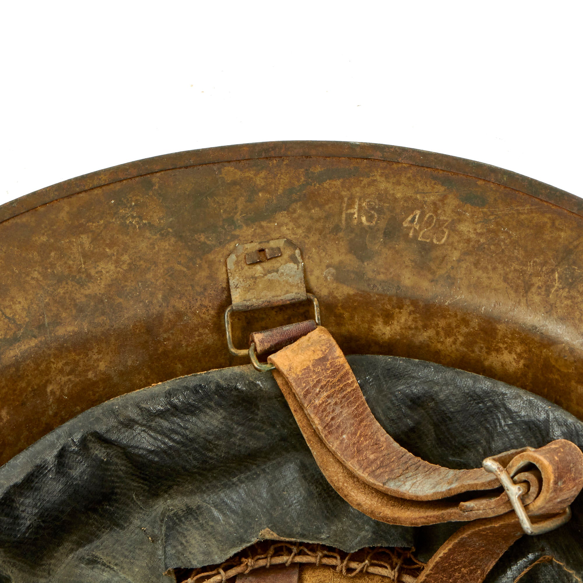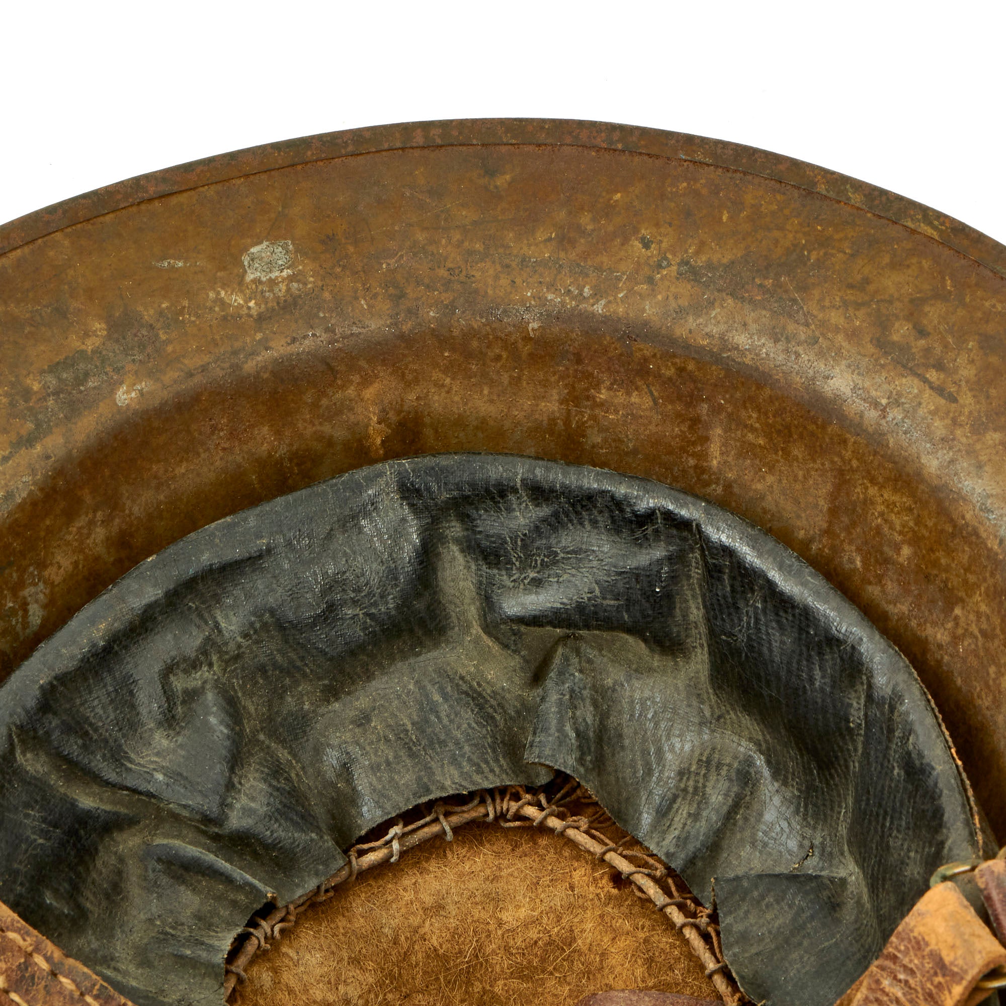 The heat stamp on the underside of the rim is HS 423, a nice and low lot number for a helmet manufactured by Hadfield Ltd of Sheffield. The heat stamp and the split rivets on the chinstrap bales are a solid indication and a good reference point for identifying British made helmets for American use during the Great War. The best feature on this helmet is the hand painted 80th Infantry Division Field Artillery insignia on the left hand side. The insignia consists of a red circle with 4 “breaks” in the red ring, a blue triangle in the center with “M” and “D” on each side. We have not been able to determine which exact element this was, making for a wonderful research opportunity. The insignia is faded slightly and retained at approximately 80 percent.