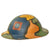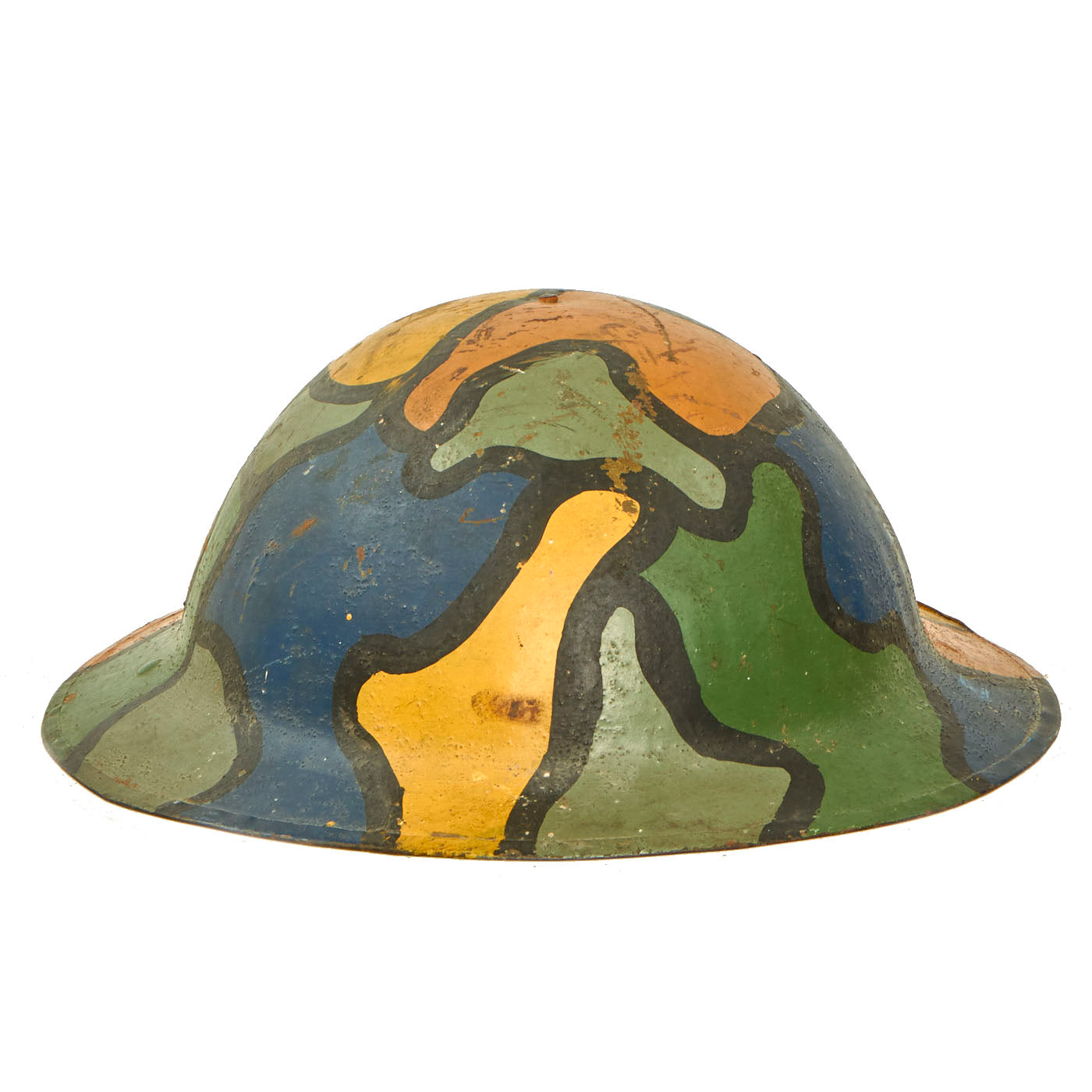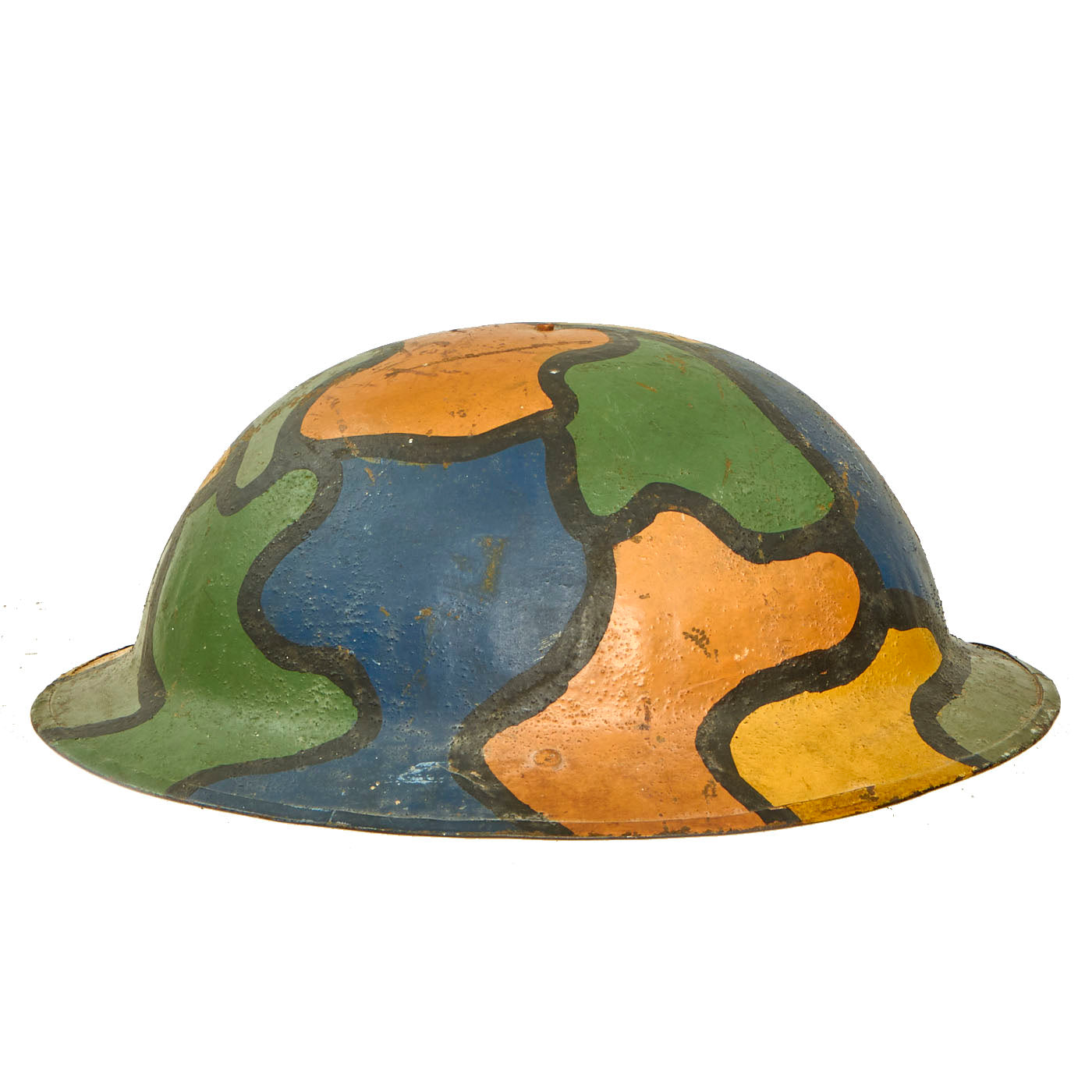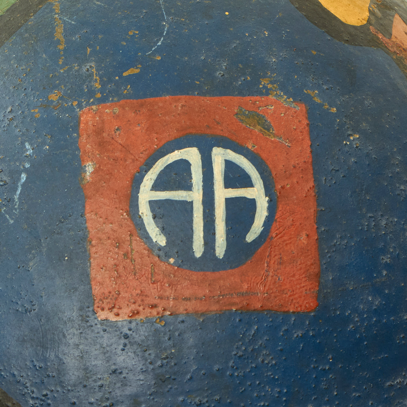 The best feature on this helmet is the vibrant panel camouflage consisting of blues, orange, yellow and various shades of green. This type of camouflage was seen on all fronts and used by nearly all military forces fighting. The front of the helmet has a fantastic burnt orange square with a blue circle and “AA” painted in the center.