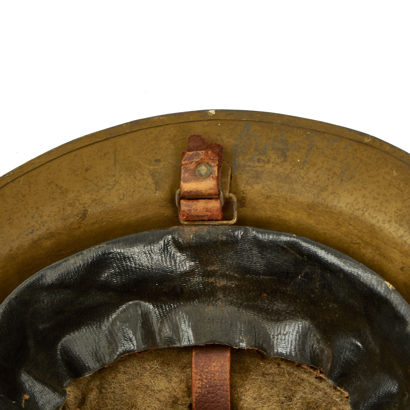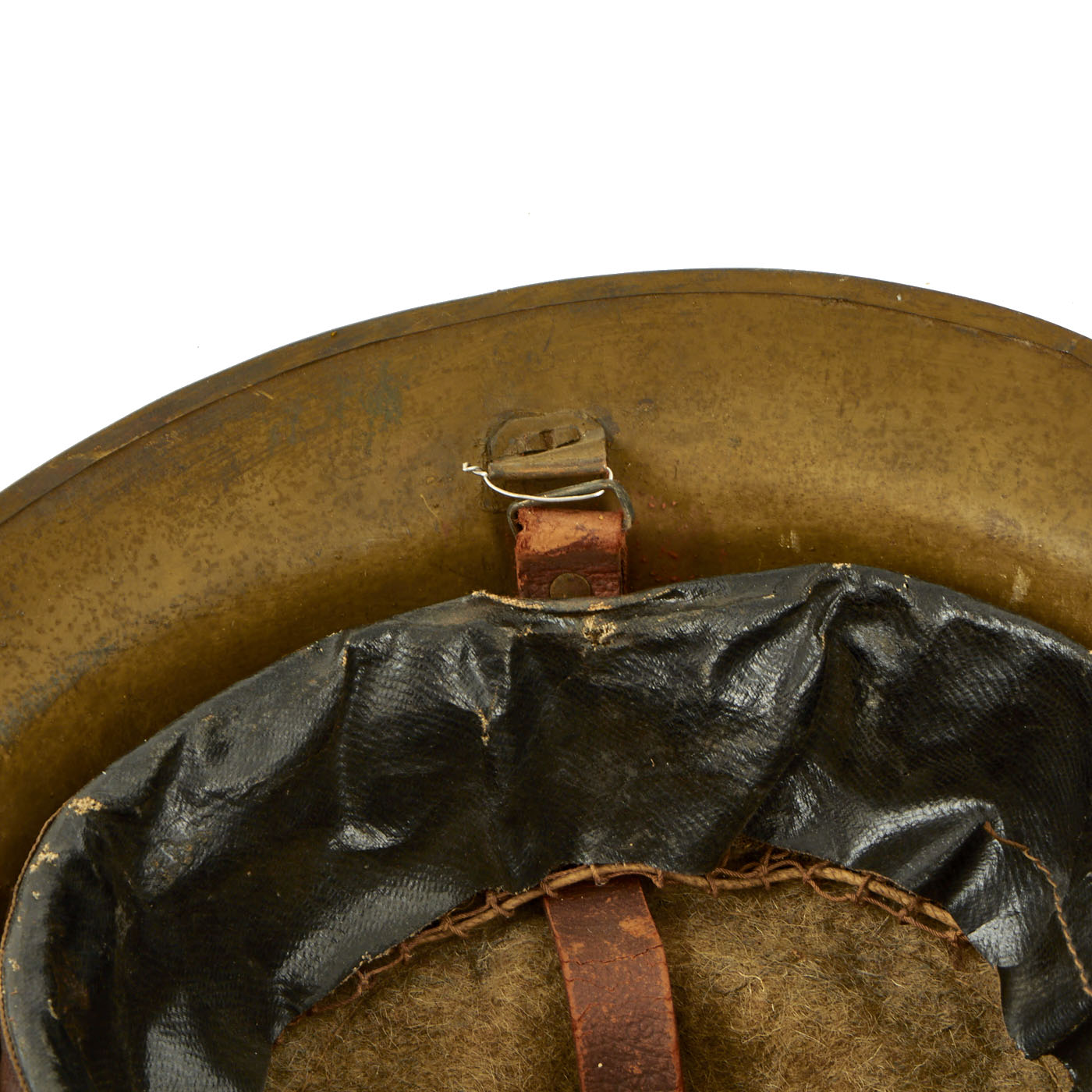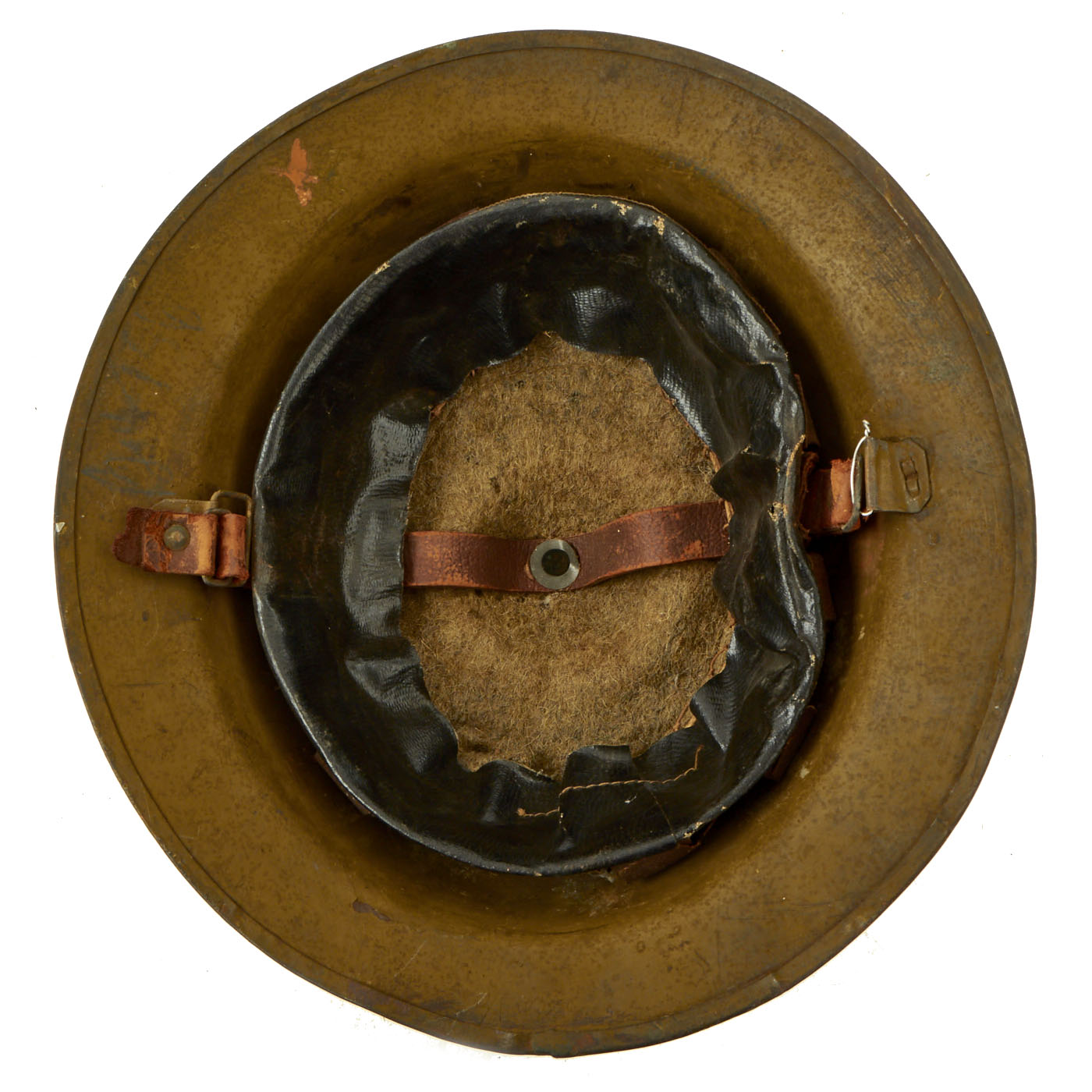 M1917 helmet liners typically show a paper label at the crown and the dome rivet head. The liner is set up as on the British versions, with an oilcloth band and net configuration, attached to a leather strap, riveted to the shell. The chinstrap is leather with steel buckle.