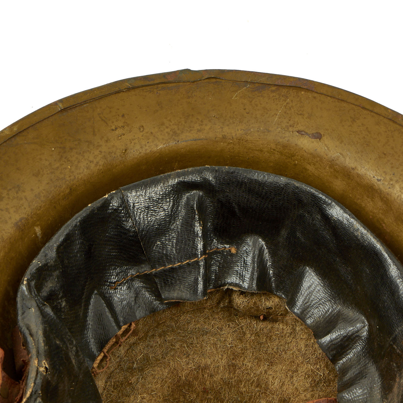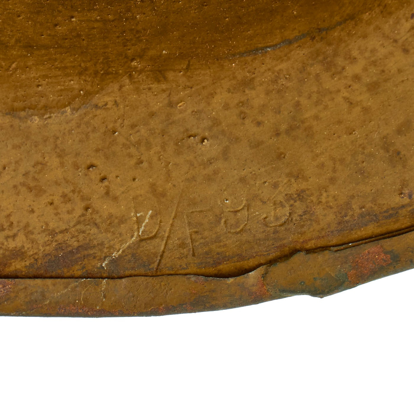 The heat stamp on the underside of the rim is D/F 93, a nice and low lot number for a helmet manufactured by James Dixon & Sons of Sheffield. The heat stamp and the split rivets on the chinstrap bales are a solid indication and a good reference point for identifying British made helmets for American use during the Great War.