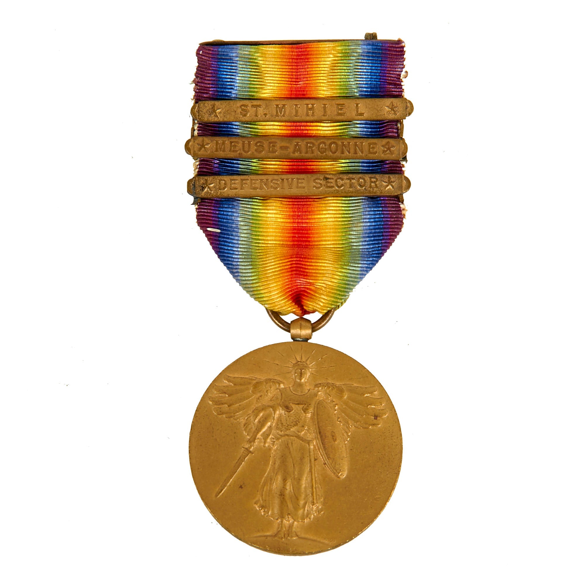 - Word’s WWI Victory Medal, with bars for St. Mihiel, Meuse-Argonne, and Defensive Sector. Great condition overall.