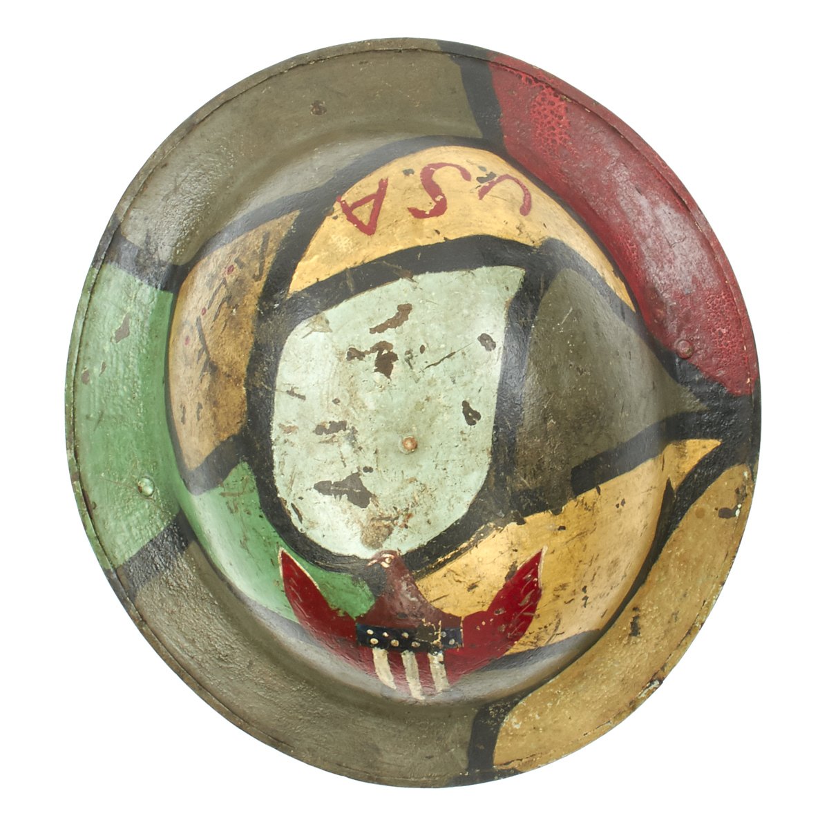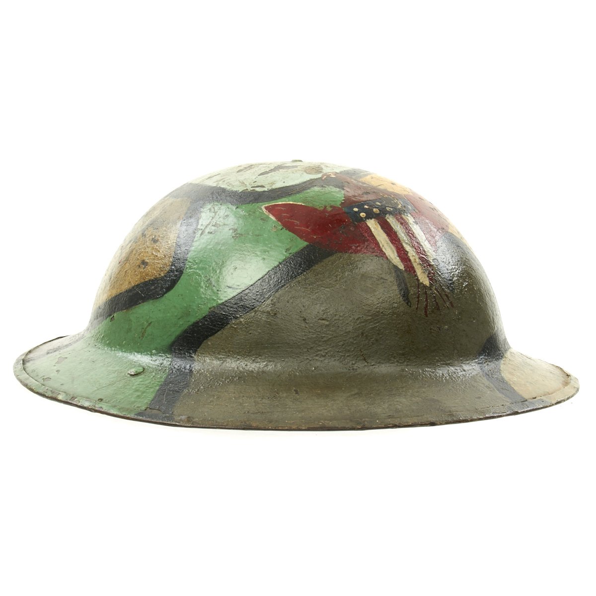 Original Item: One-of-a-kind. This is a fantastic genuine Great War hand painted camouflage helmet complete with its original liner and chin strap. Helmet features textured original period colored camouflage paint in various shades of grey, green, red, and blue. Definitely one of the more attractive camouflage color schemes we have seen. The helmet also has U S A and A.E.F. painted on the rear, for the American Expeditionary Force in WWI. It also has a wonderful red Eagle with a U.S. Shield on the front.