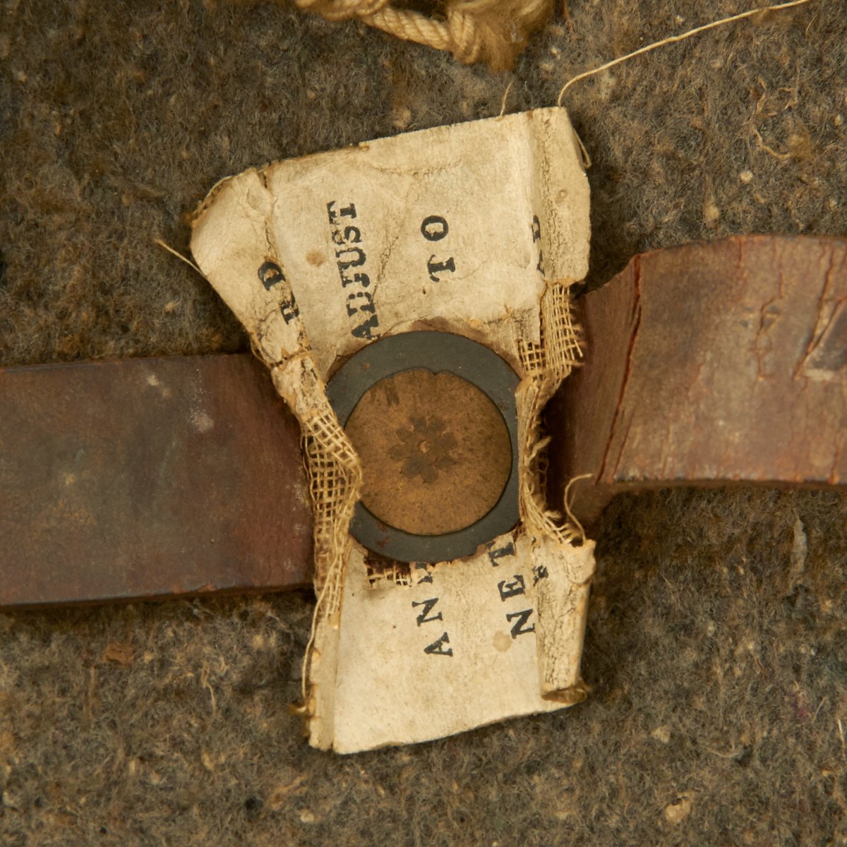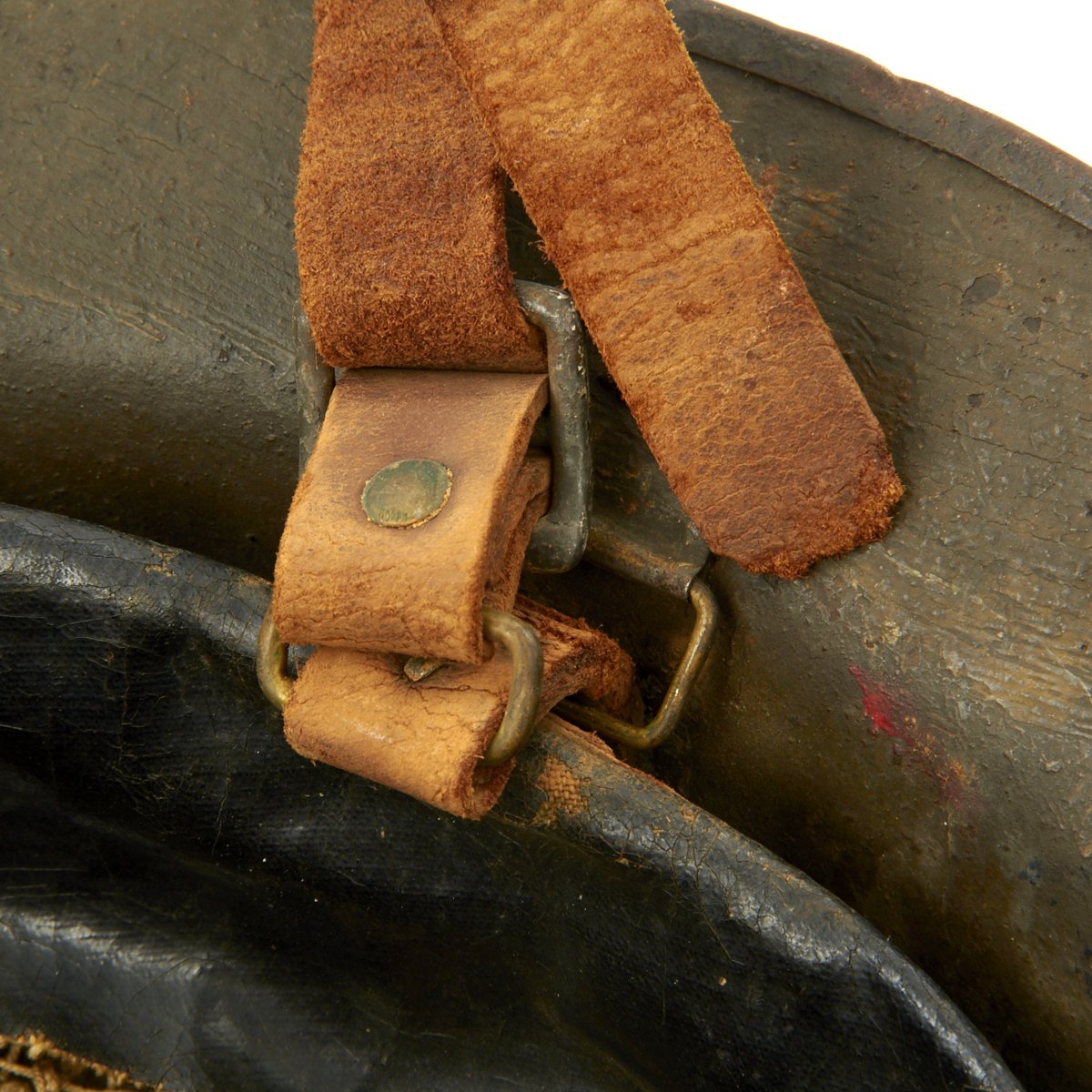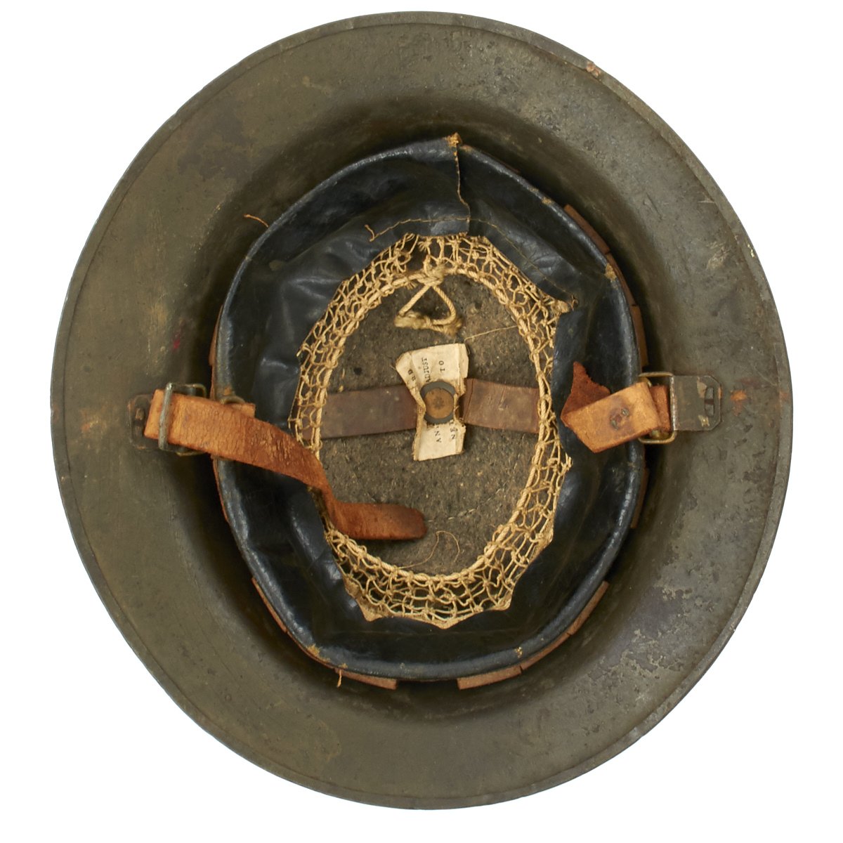 M1917 helmet liners typically show a paper label at the crown and the dome rivet head. The liner is set up as on the British versions, with an oilcloth band and net configuration, attached to a leather strap, riveted to the shell. The chinstrap is leather with steel buckle.