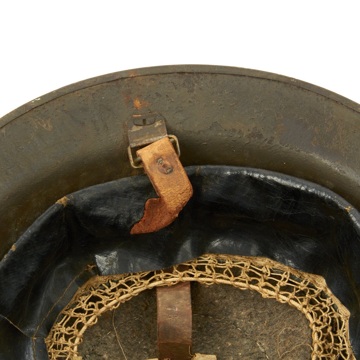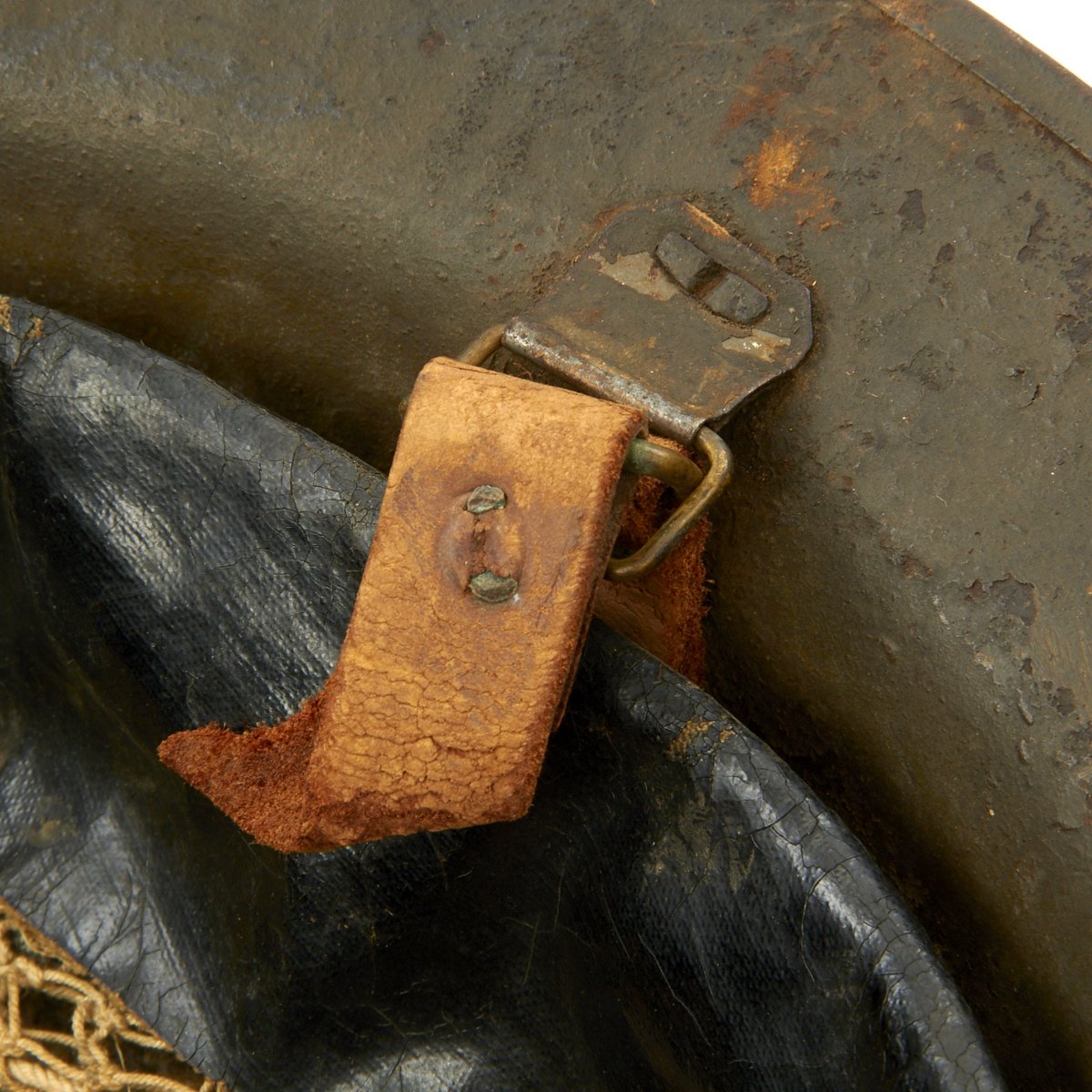 The paint is very nice and vibrant, with great color retention, and a nice patina of age. The interior of the helmet has all the original paint. It also has a very nice complete liner, with partial original leather chin strap. The liner does show some age, and the leather is somewhat dry, but the oil cloth is quite solid, as is the underlying netting. The chinstrap has deteriorated and is mostly present but completely torn through and delicate.