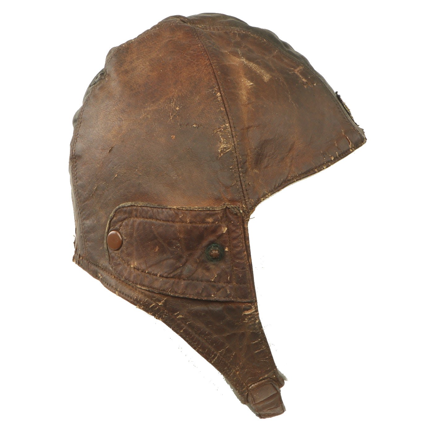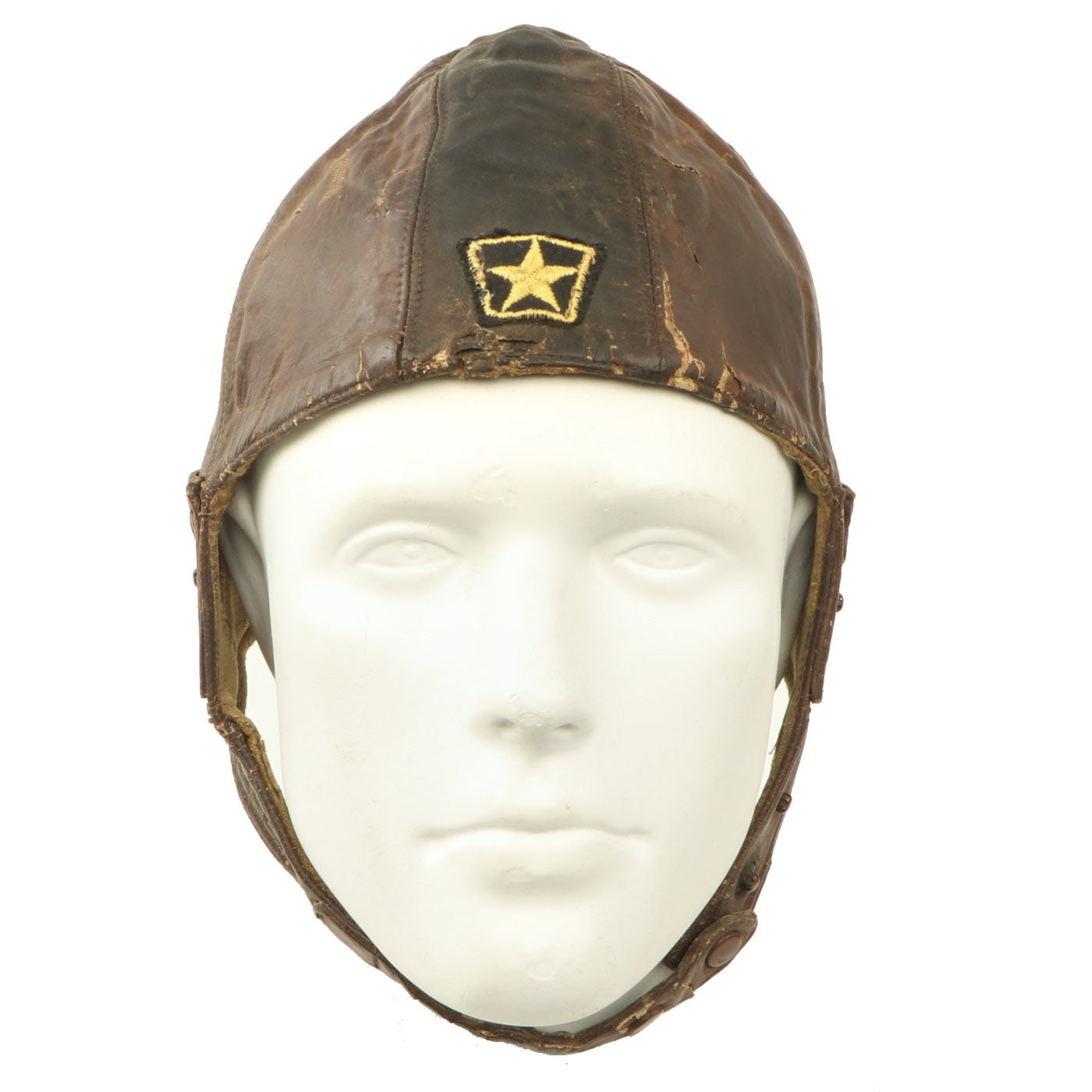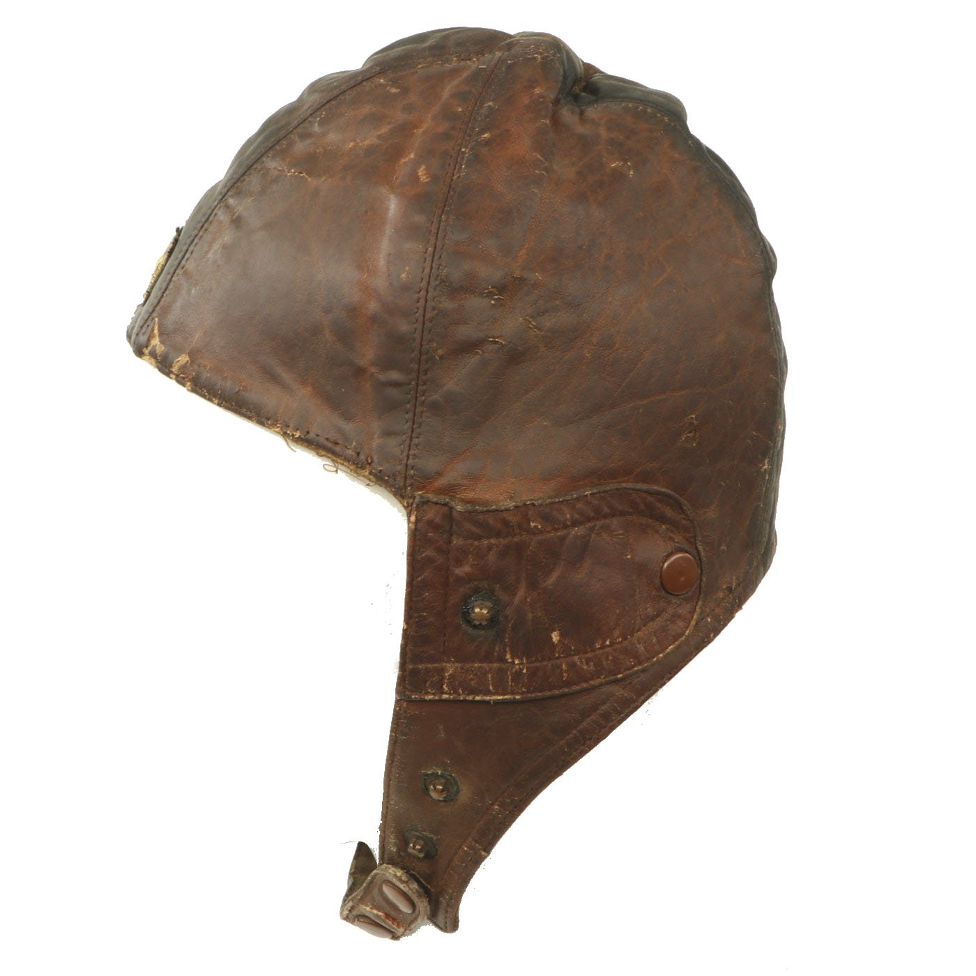 Original Item: Only One Available. This fantastic rare example of a genuine WWI Aviator flying helmet is made of a soft leather. Construction is brown leather chamois-lined flying helmet with snap chinstrap. Typical allied construction of the period with all snaps present; snaps are all period correct. The leather is soft and supple, nice condition for over 100 years of age. Features an embroidered black background yellow star patch to front. Helmet is approximate size 56cm ( US 7).