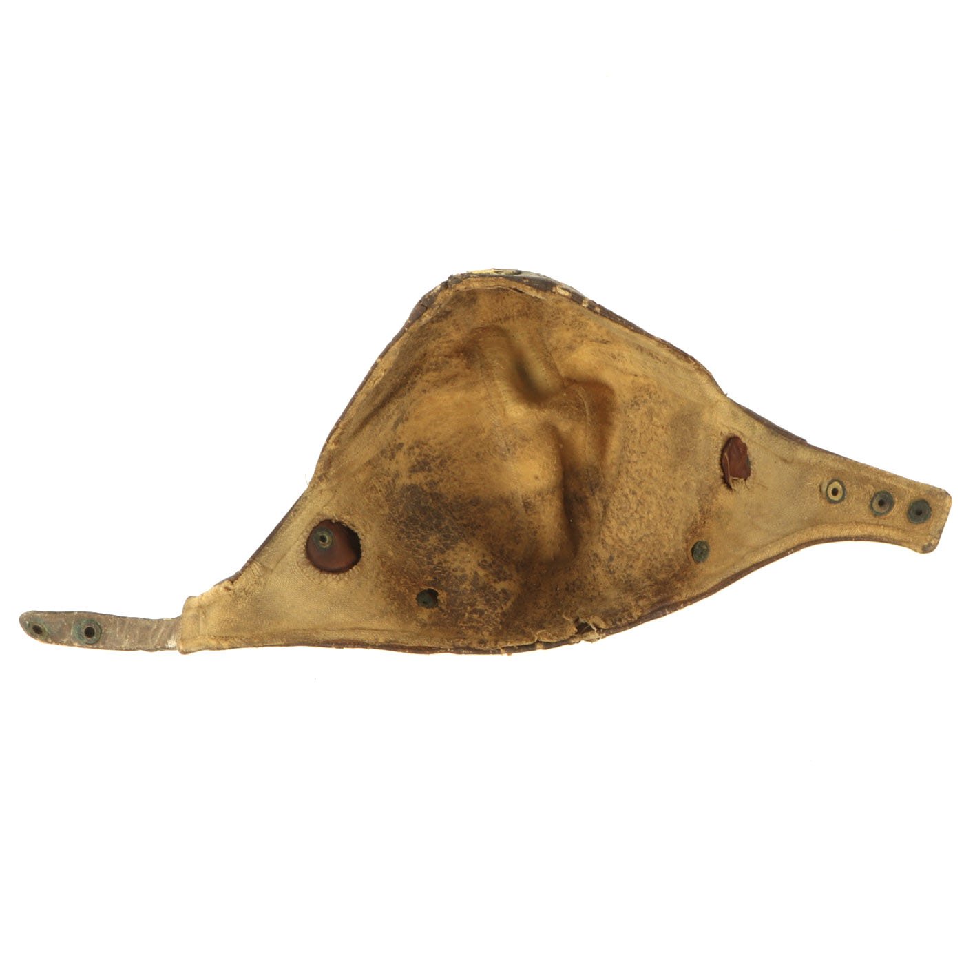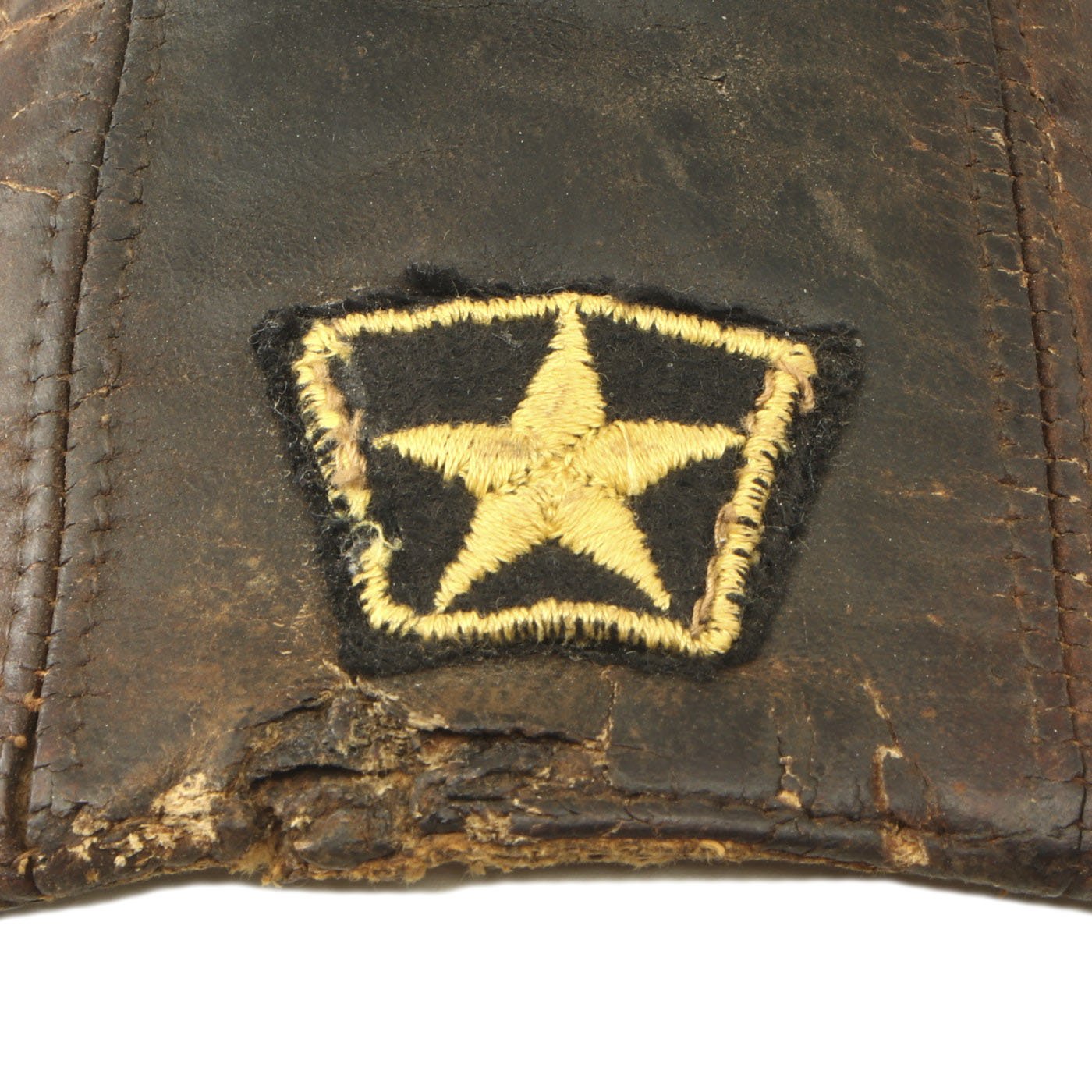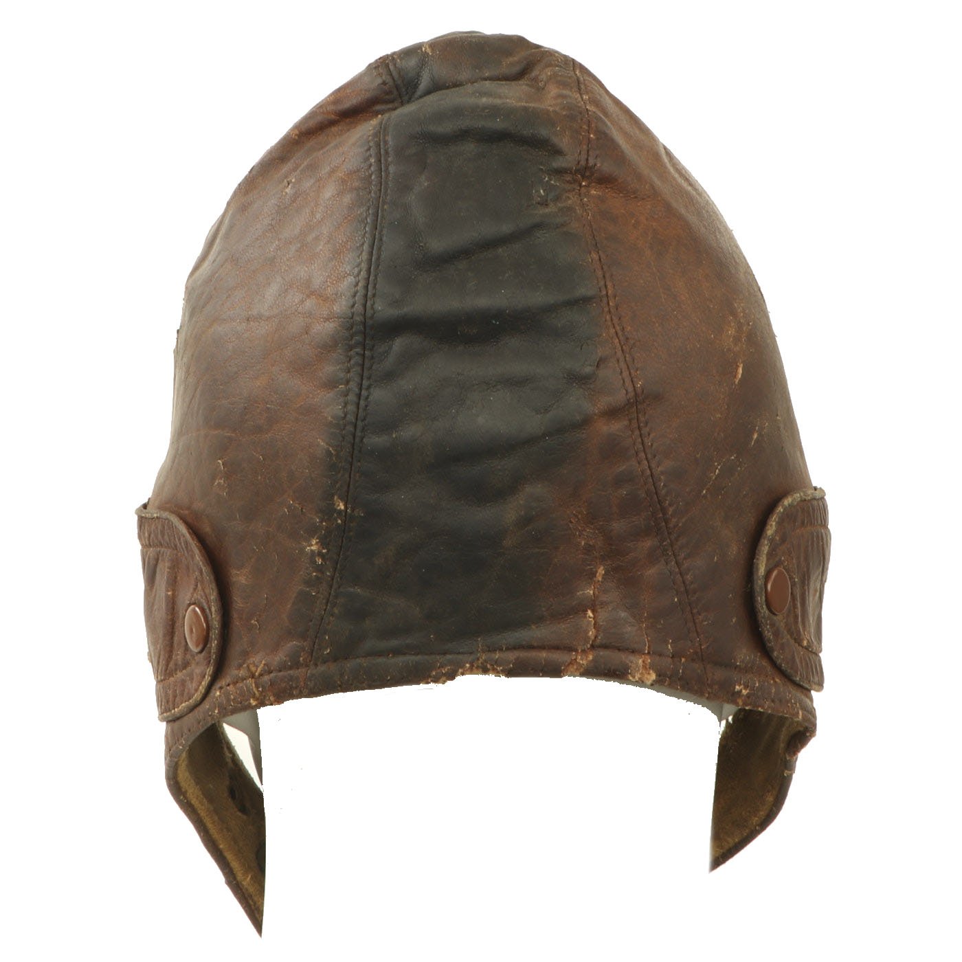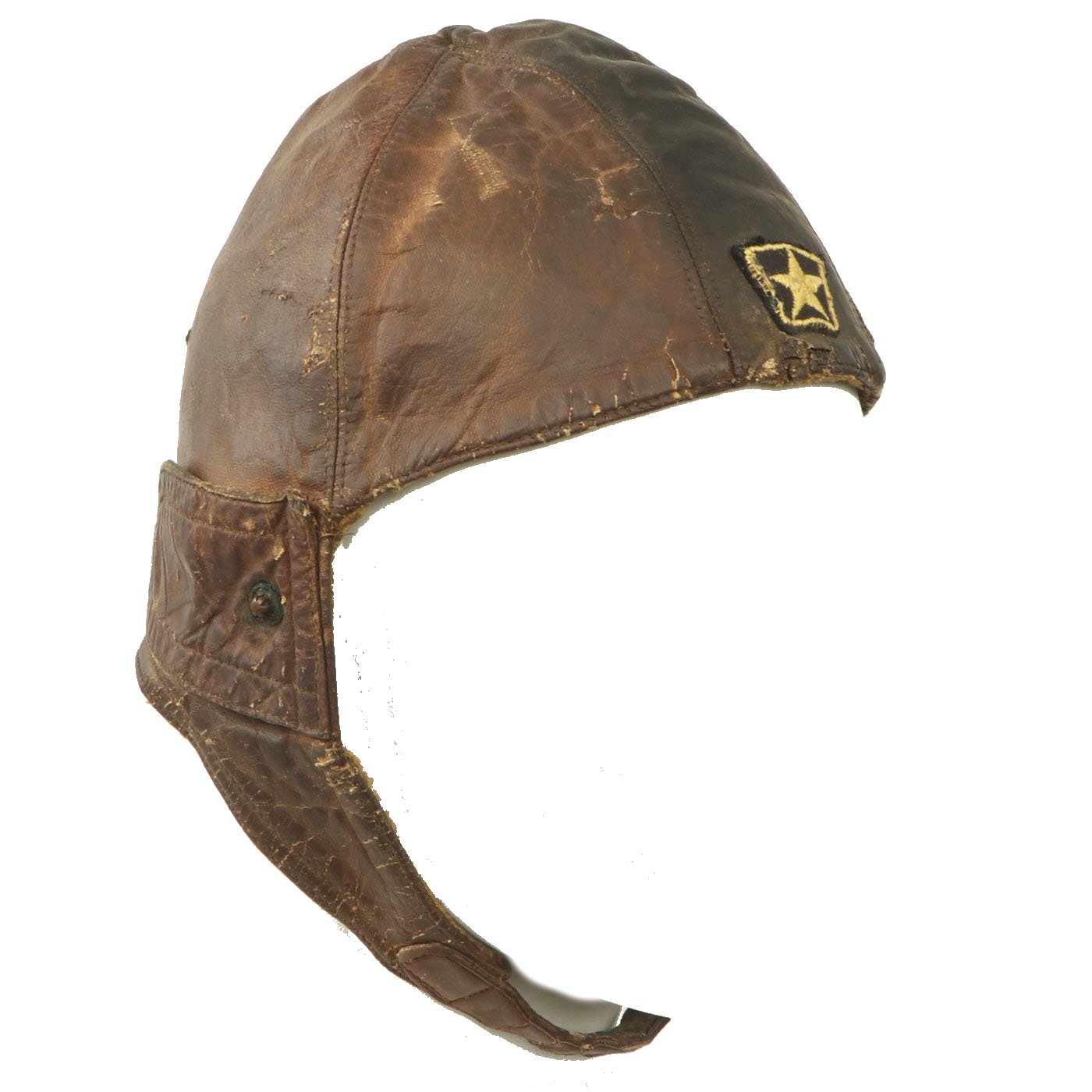 Original Item: Only One Available. This fantastic rare example of a genuine WWI Aviator flying helmet is made of a soft leather. Construction is brown leather chamois-lined flying helmet with snap chinstrap. Typical allied construction of the period with all snaps present; snaps are all period correct. The leather is soft and supple, nice condition for over 100 years of age. Features an embroidered black background yellow star patch to front. Helmet is approximate size 56cm ( US 7).