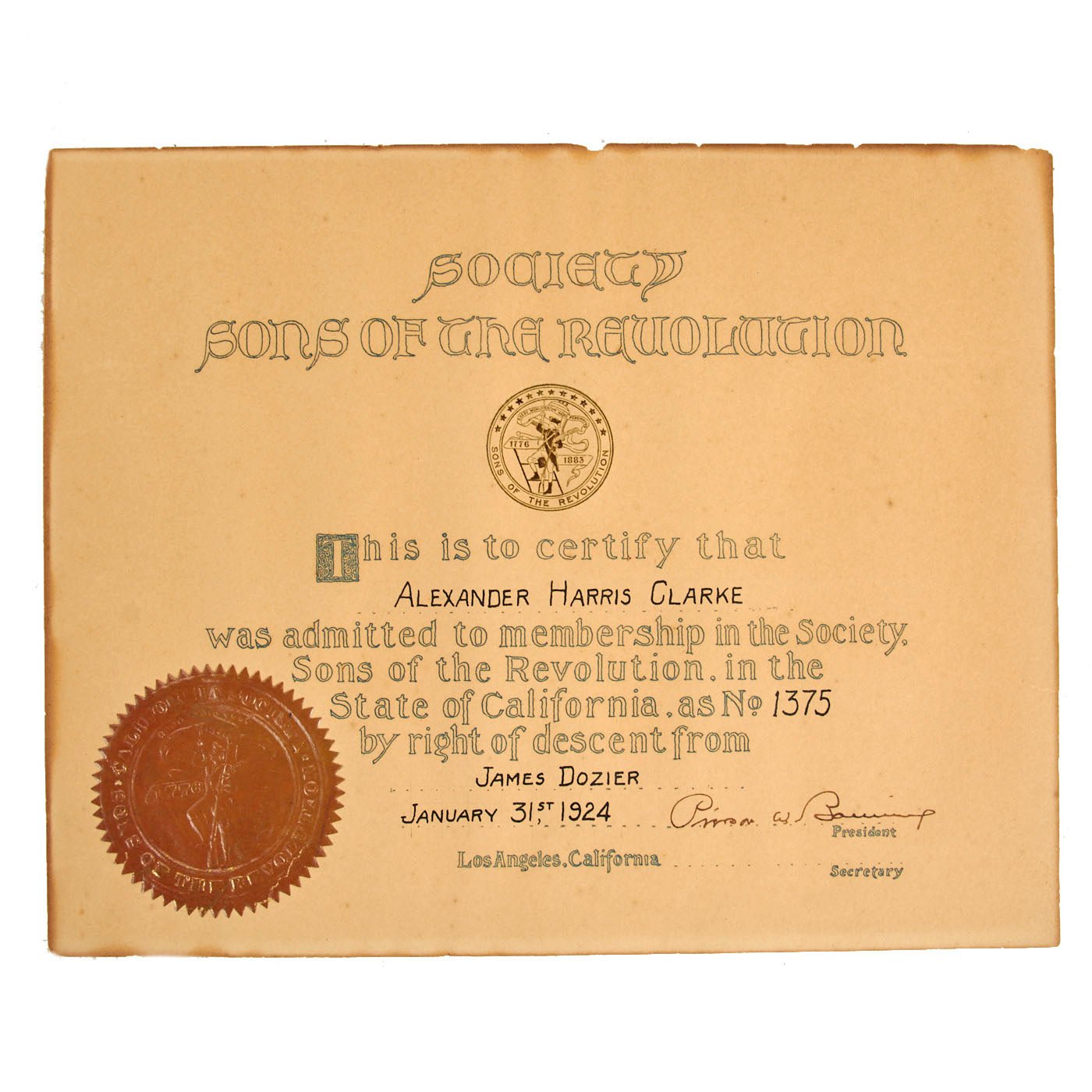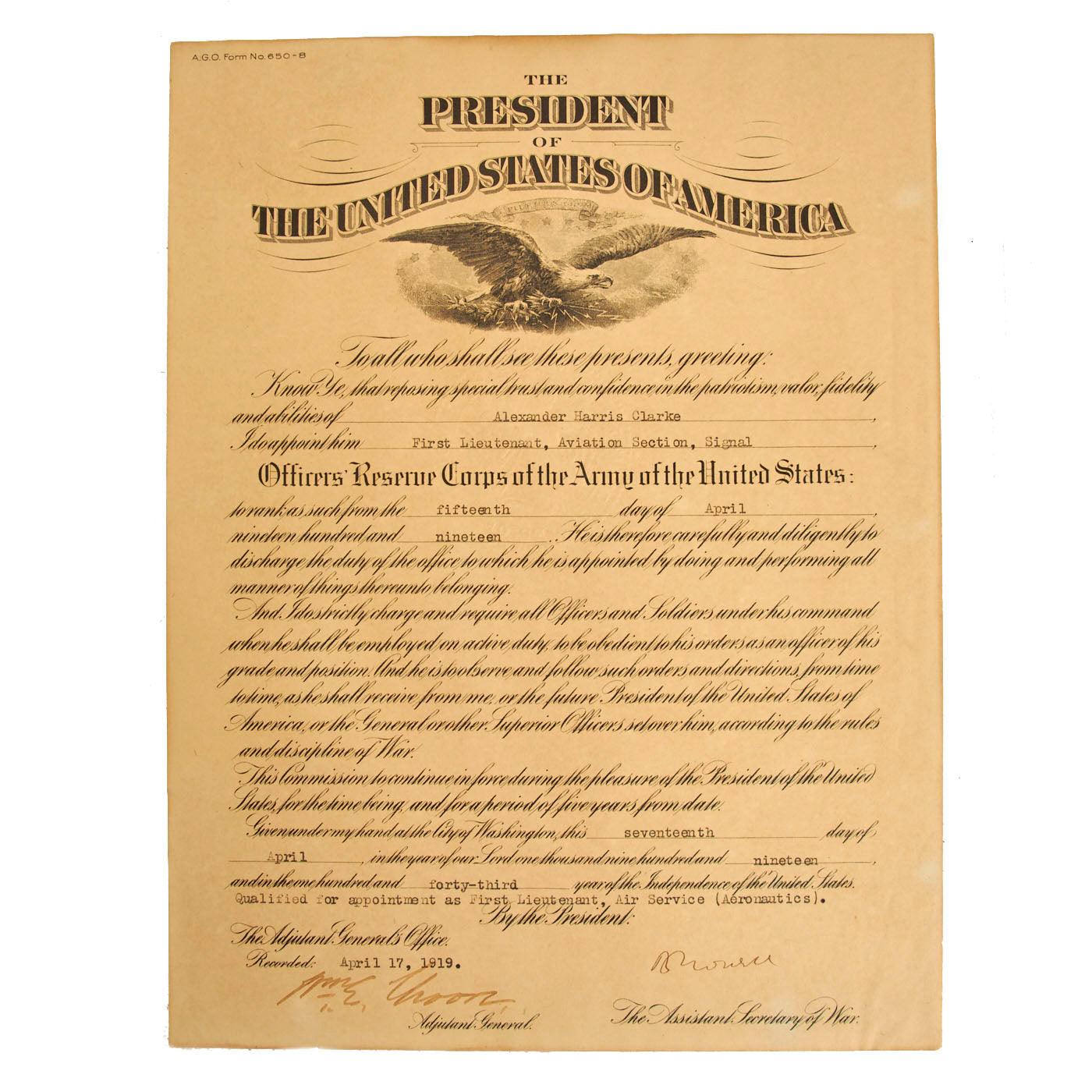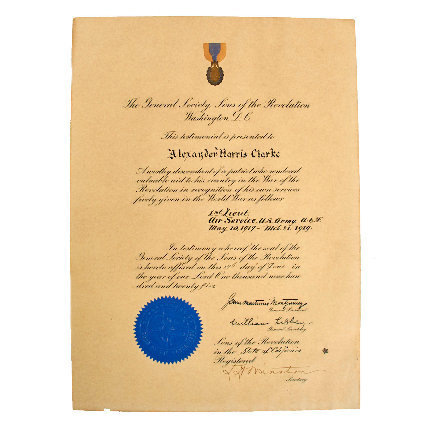 The documents included are certificates from the Society of the Sons of the American Revolution, promotion warrants and is certificate of completion from the United States School of Military Aeronautics! Clarke graduated from the school of aeronautics on March 30, 1918. After WWI, Clarke remained in the military and one of the promotion warrants states him as being promoted within the Infantry in 1922.