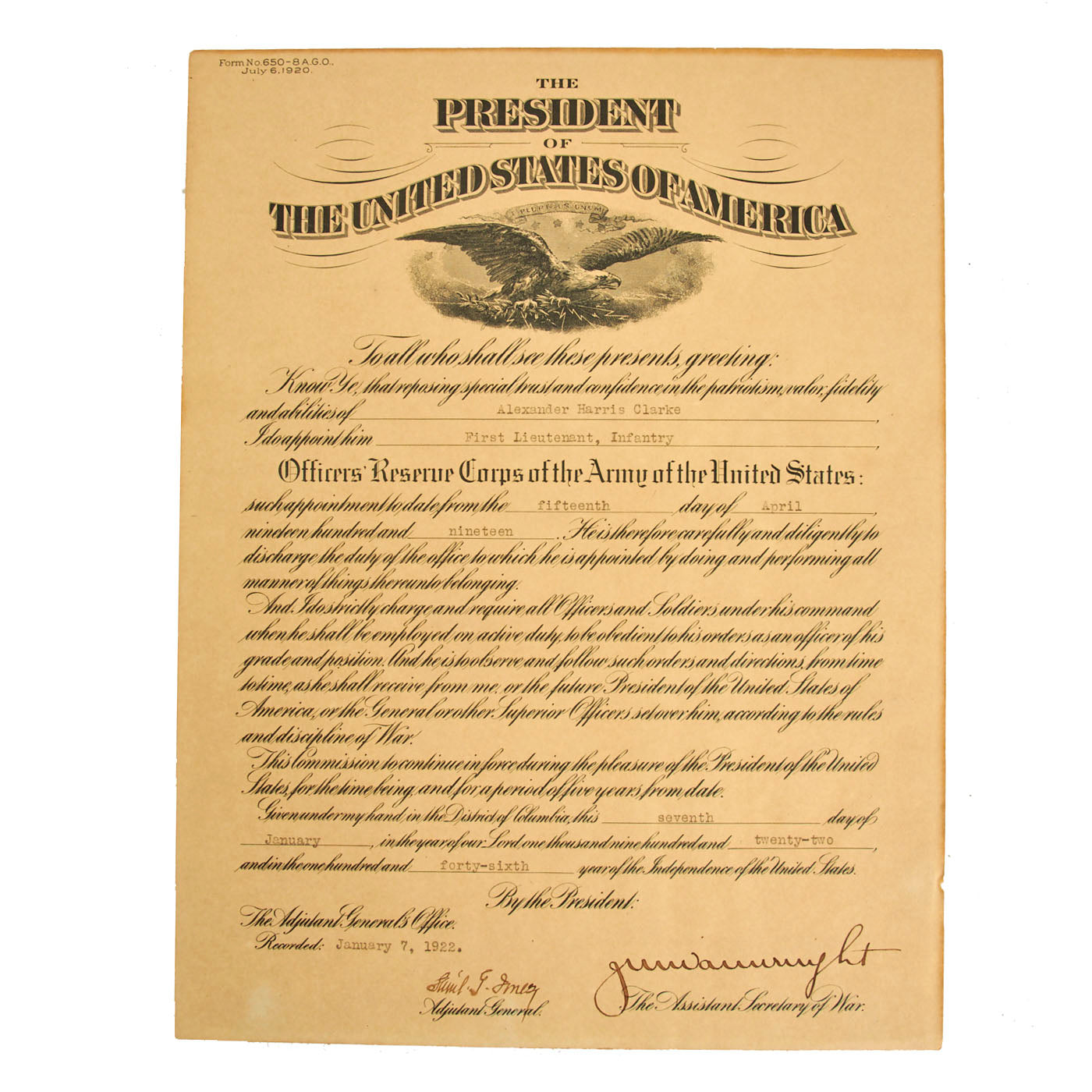 The documents included indicate that the original owner was Lieutenant Alexander Harris Clarke who was born on September 20, 1887 and died on June 19, 1960. We have not been able to locate a service record for Clarke, making this a wonderful research opportunity!