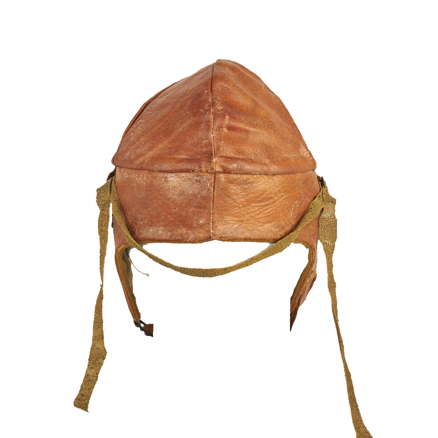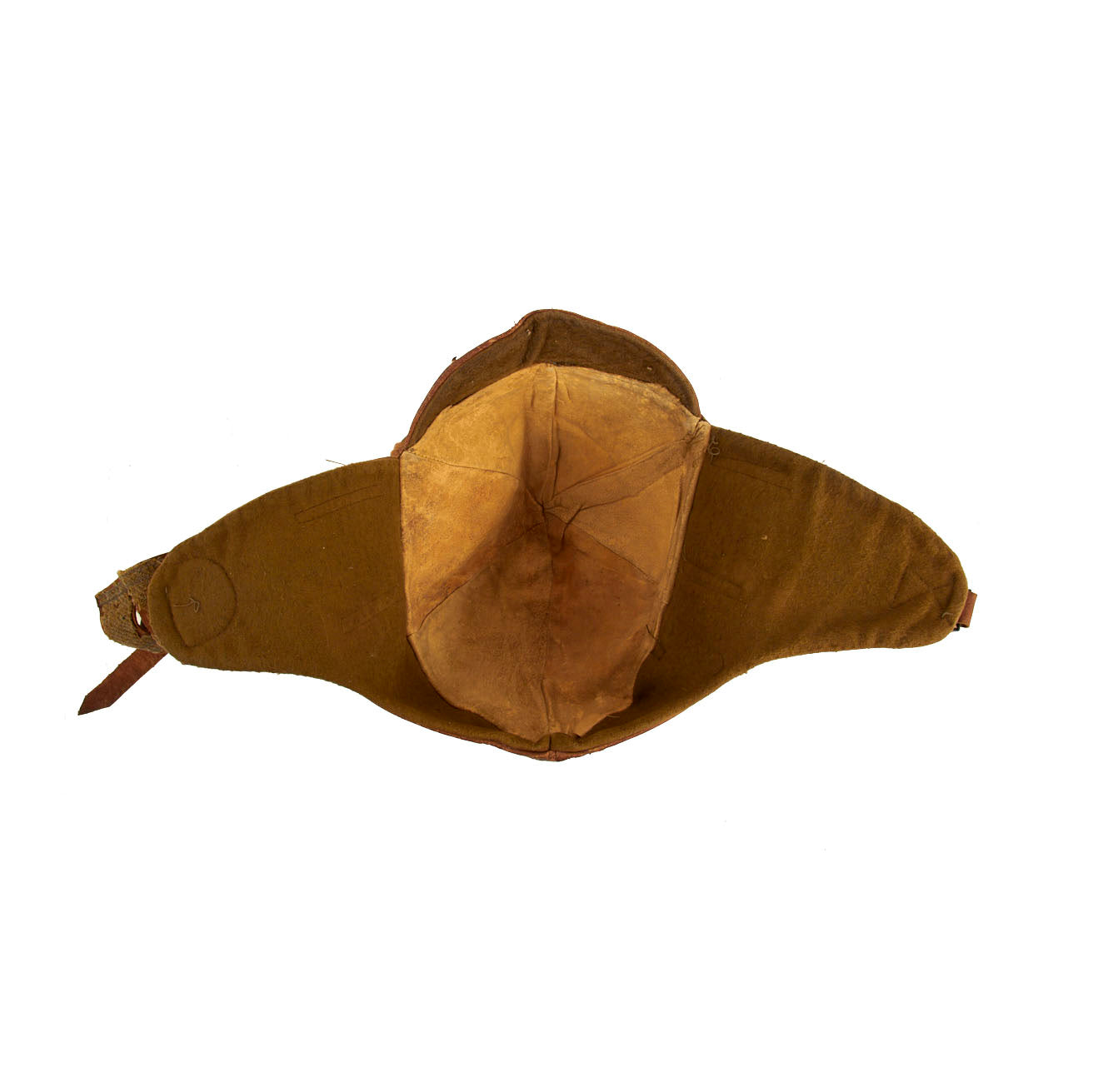 Construction is brown leather chamois-lined flying helmet with buckle chinstrap, same style as a belt. Typical allied construction of the period with all snaps and buckles present; snaps are all period correct. The leather is soft and supple, truly amazing condition for over 100 years of age. The chamois lining is in equally excellent condition and totally complete. Helmet still retains the size 7 tag.
