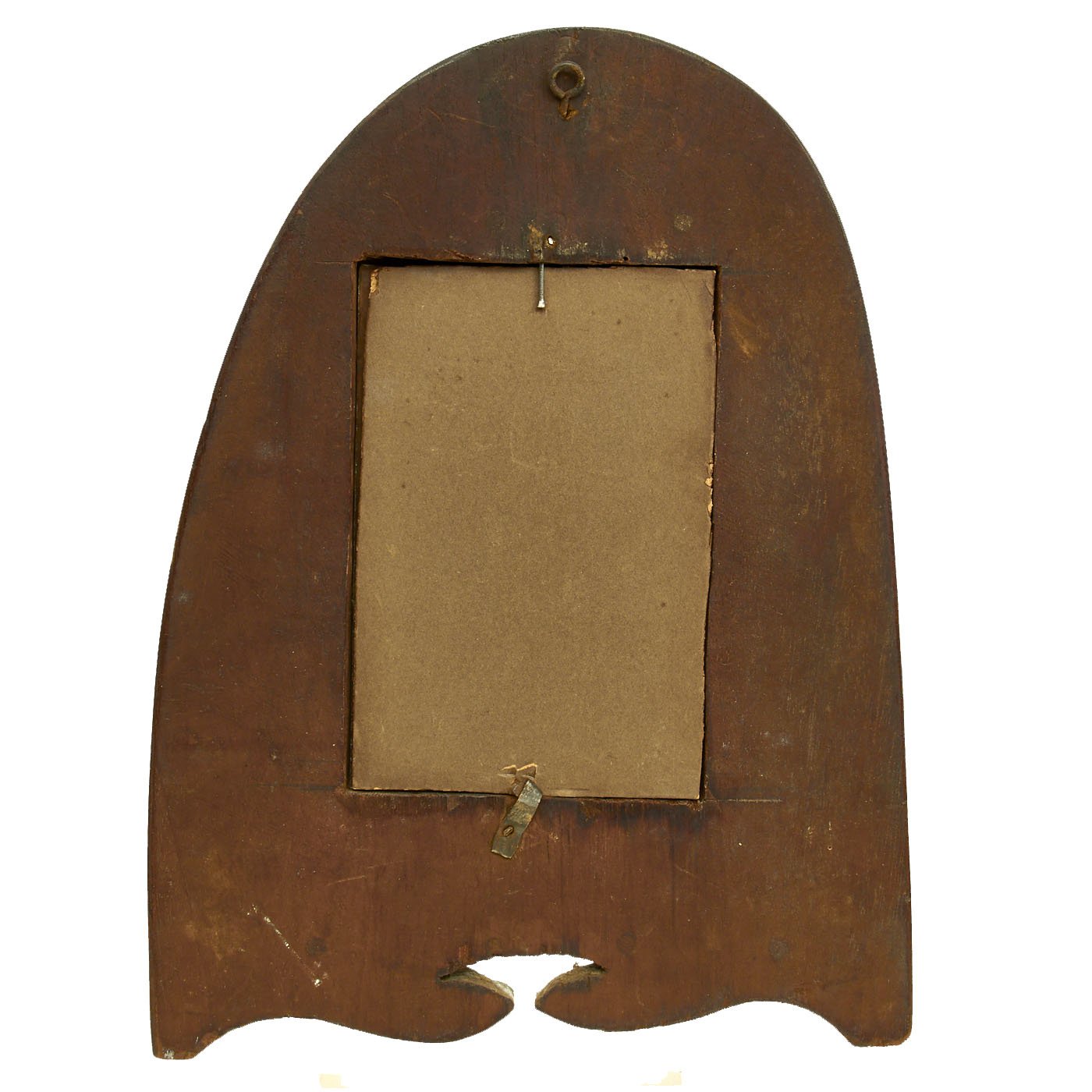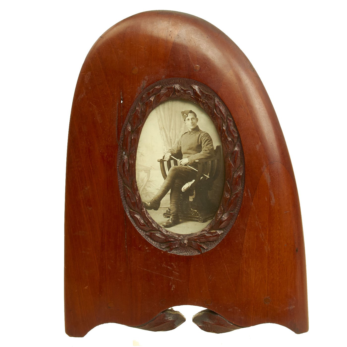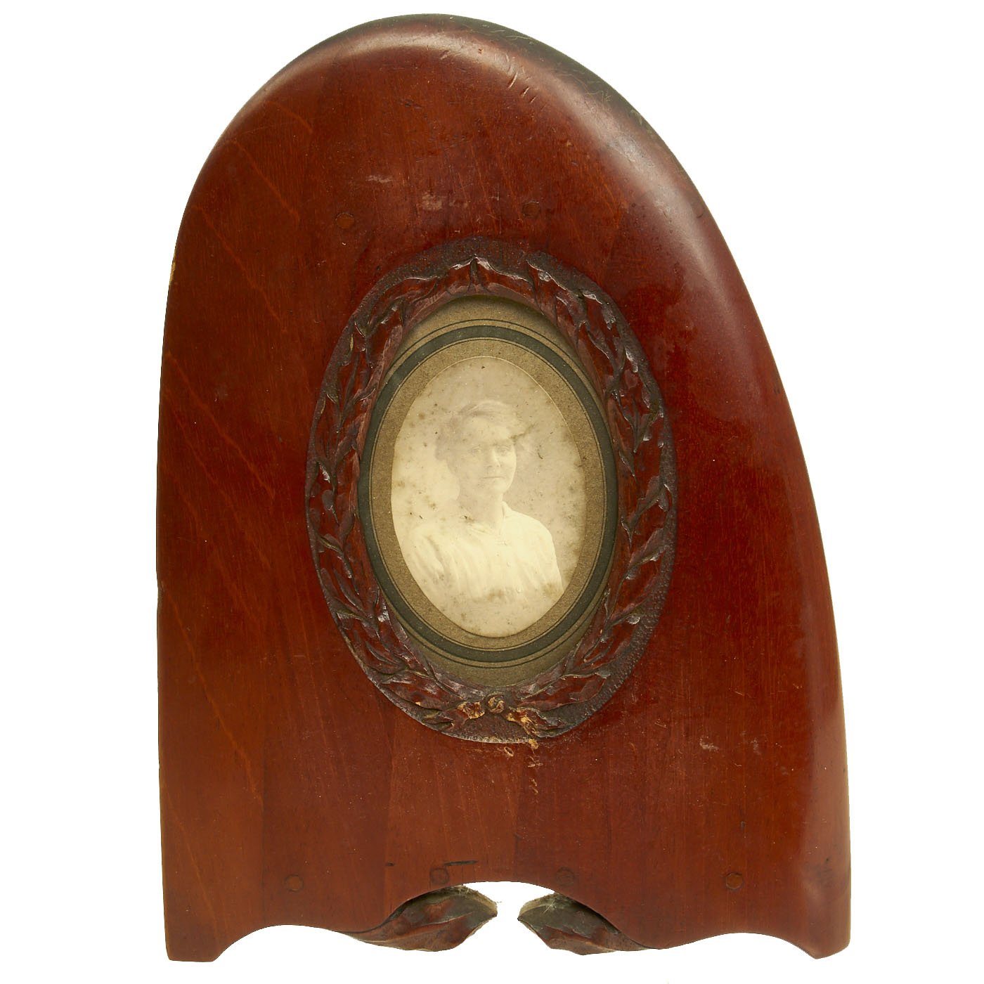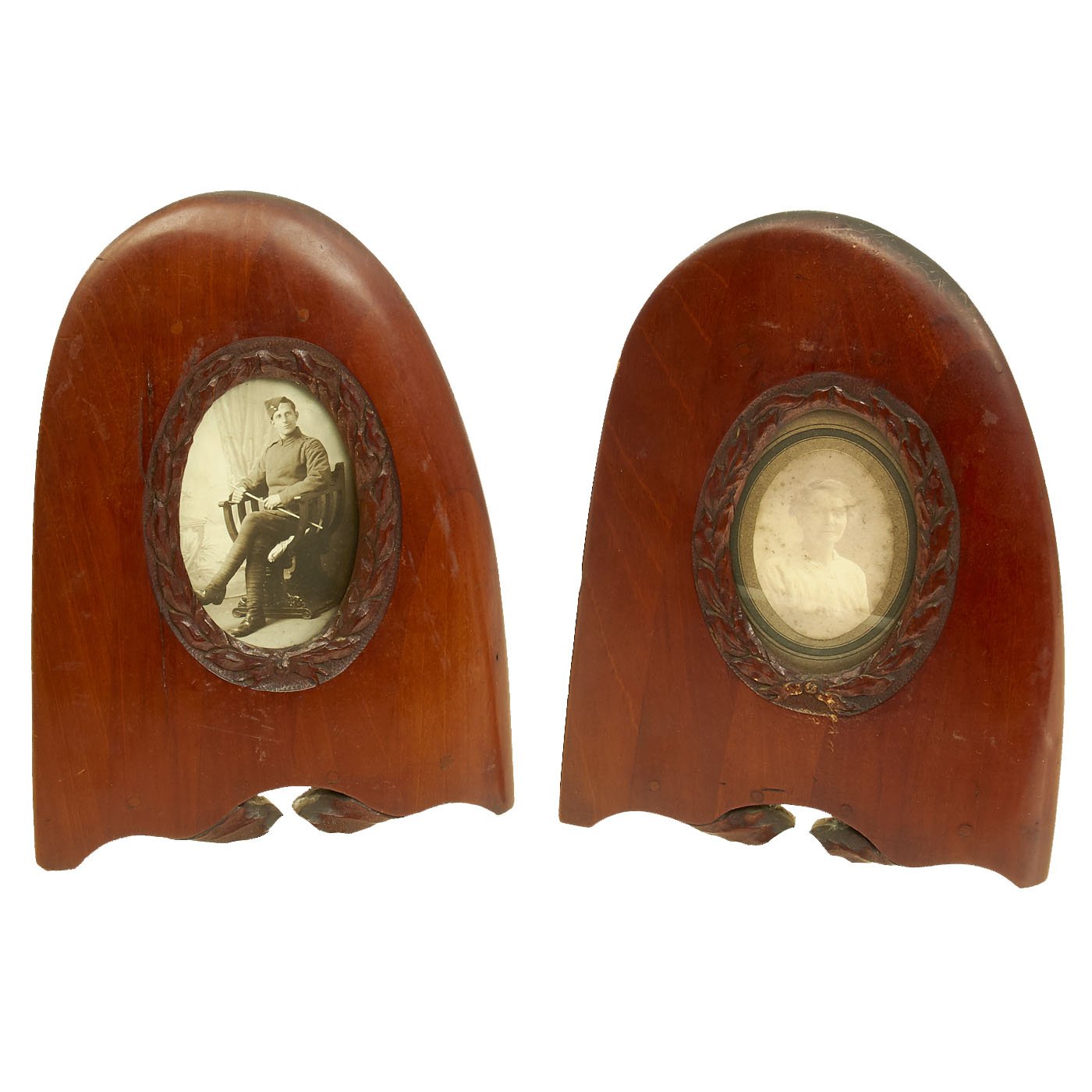 Original Items: One-of-a-Kind Set. This is a set of two wooden airplane propellor tips from World War One which were converted into hanging picture frames. Inside the frames are presumably a husband (dressed in WW1 United States Aero Squadron uniform) and wife. Each frame has glassed glass front. The frames measure 11" H x 8" wide.