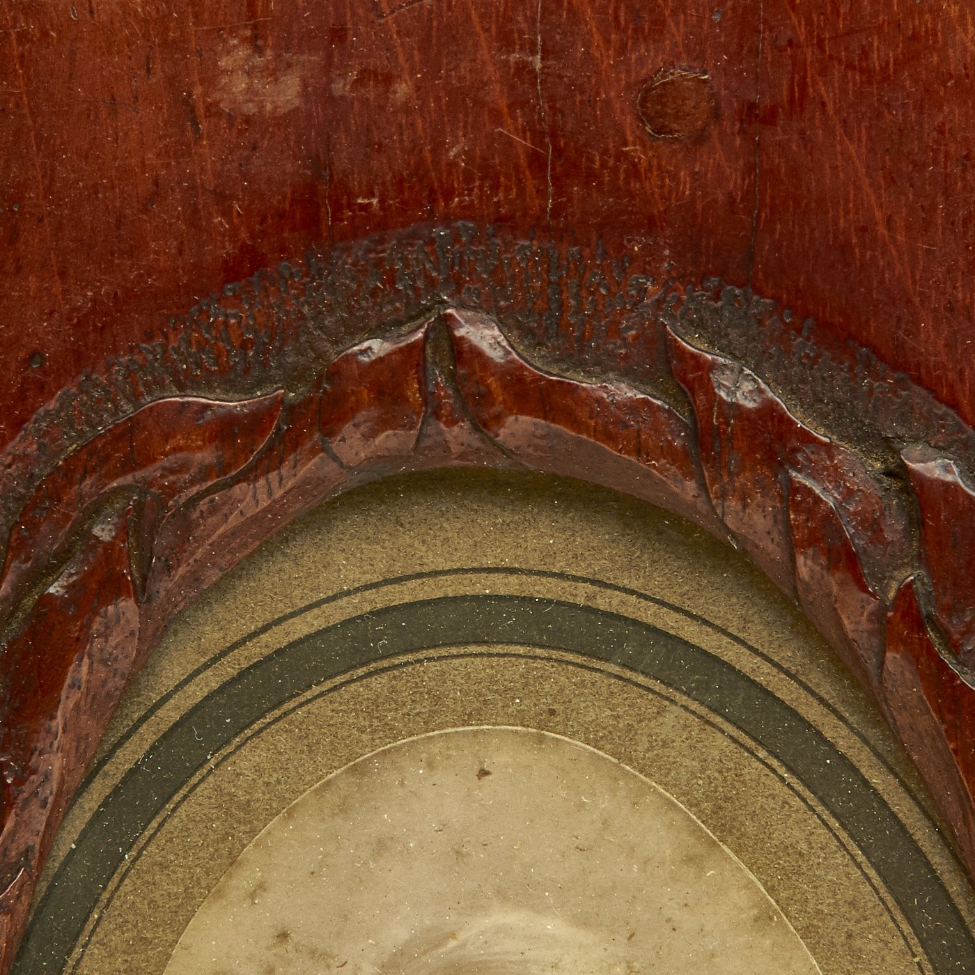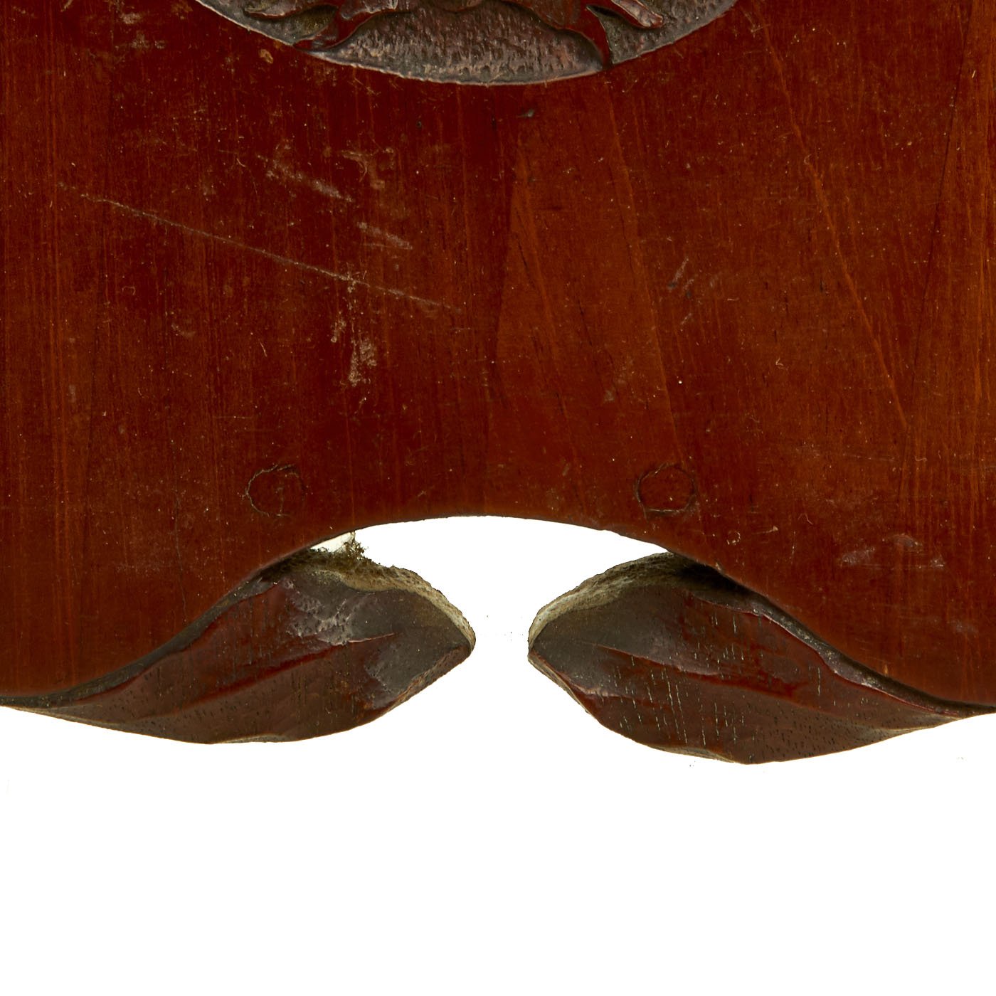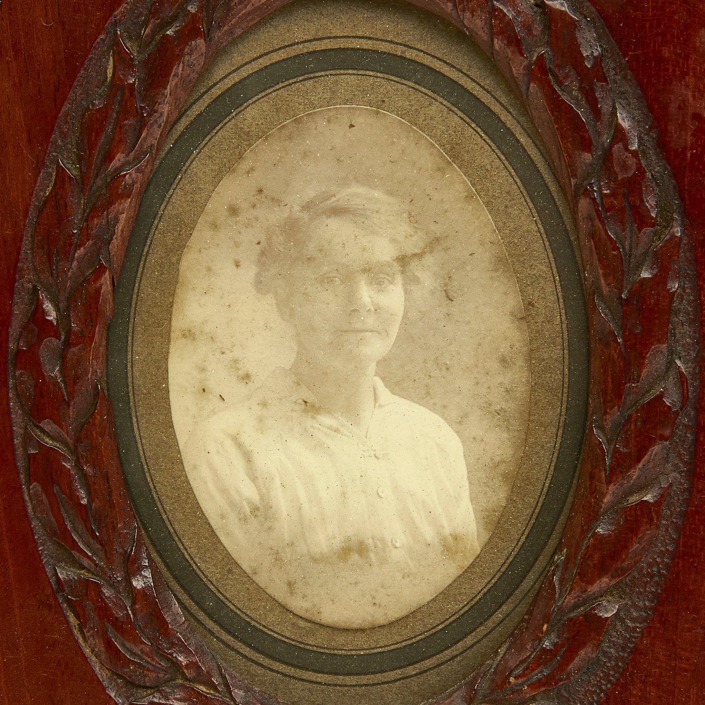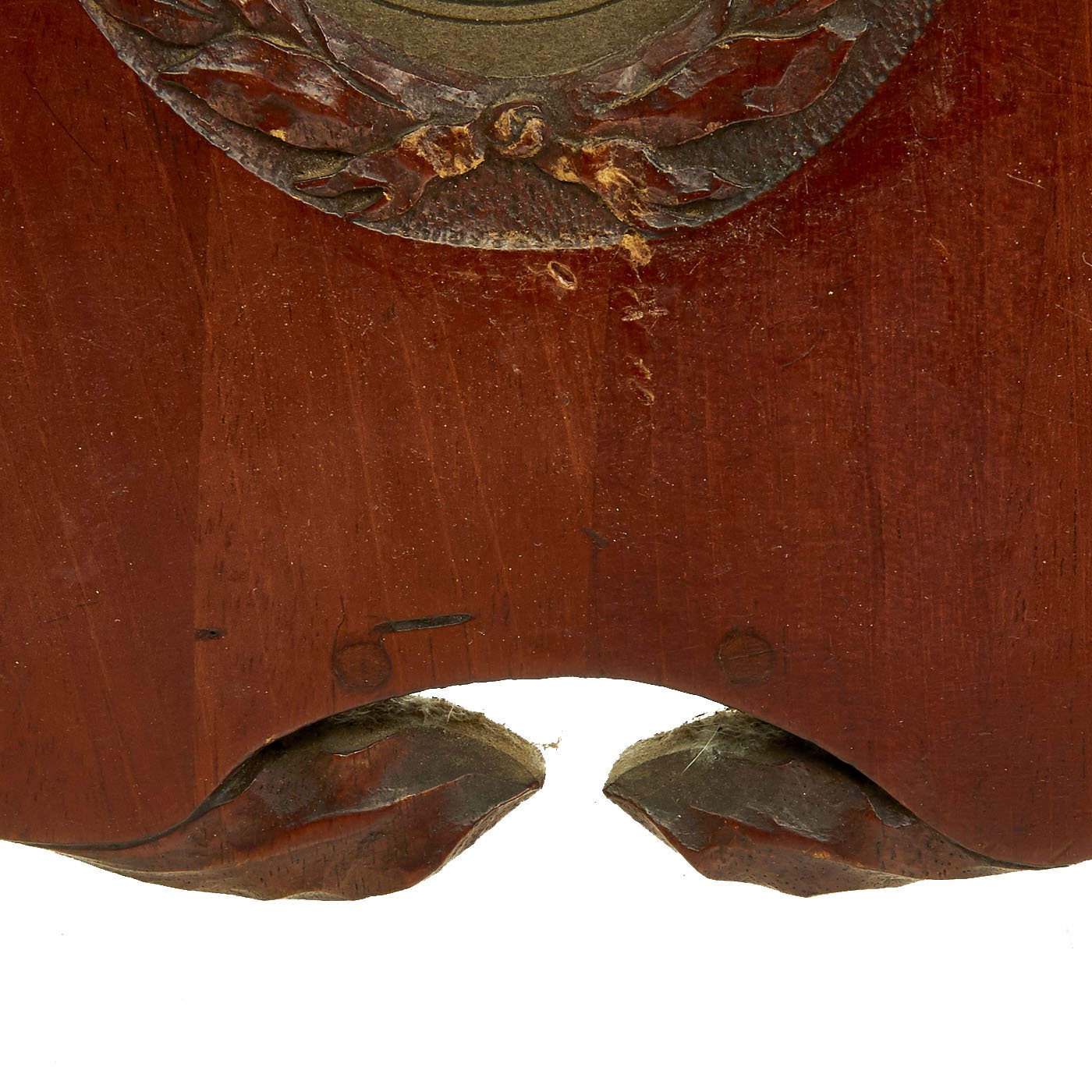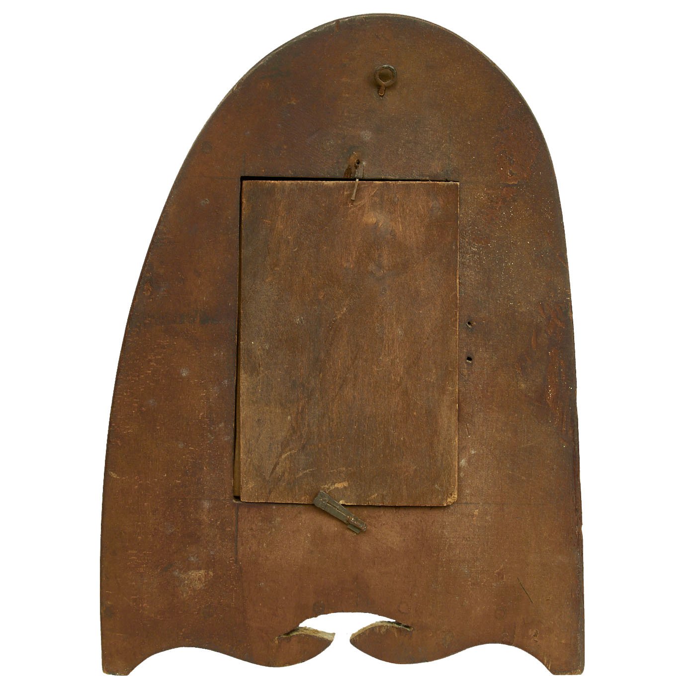 Original Items: One-of-a-Kind Set. This is a set of two wooden airplane propellor tips from World War One which were converted into hanging picture frames. Inside the frames are presumably a husband (dressed in WW1 United States Aero Squadron uniform) and wife. Each frame has glassed glass front. The frames measure 11" H x 8" wide.