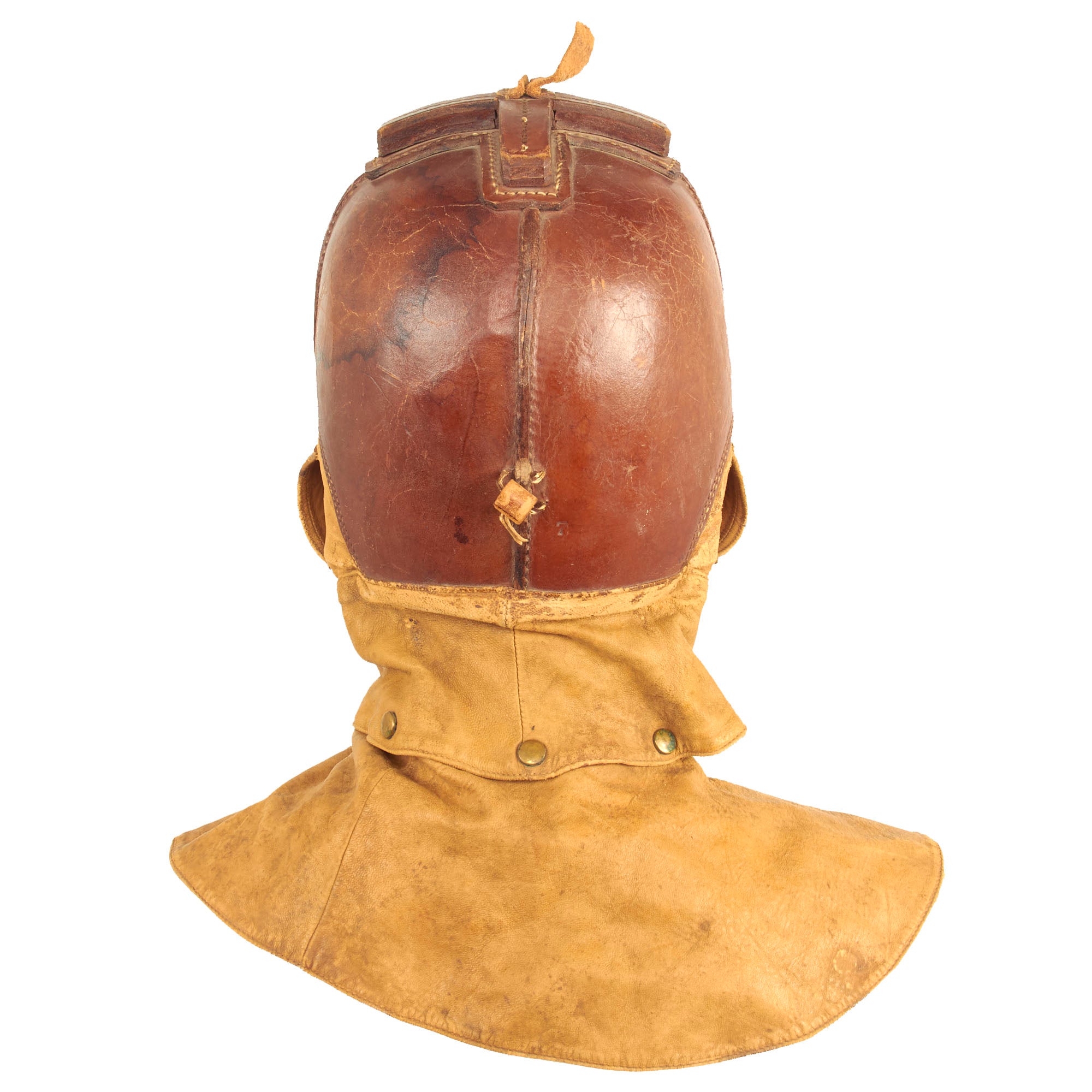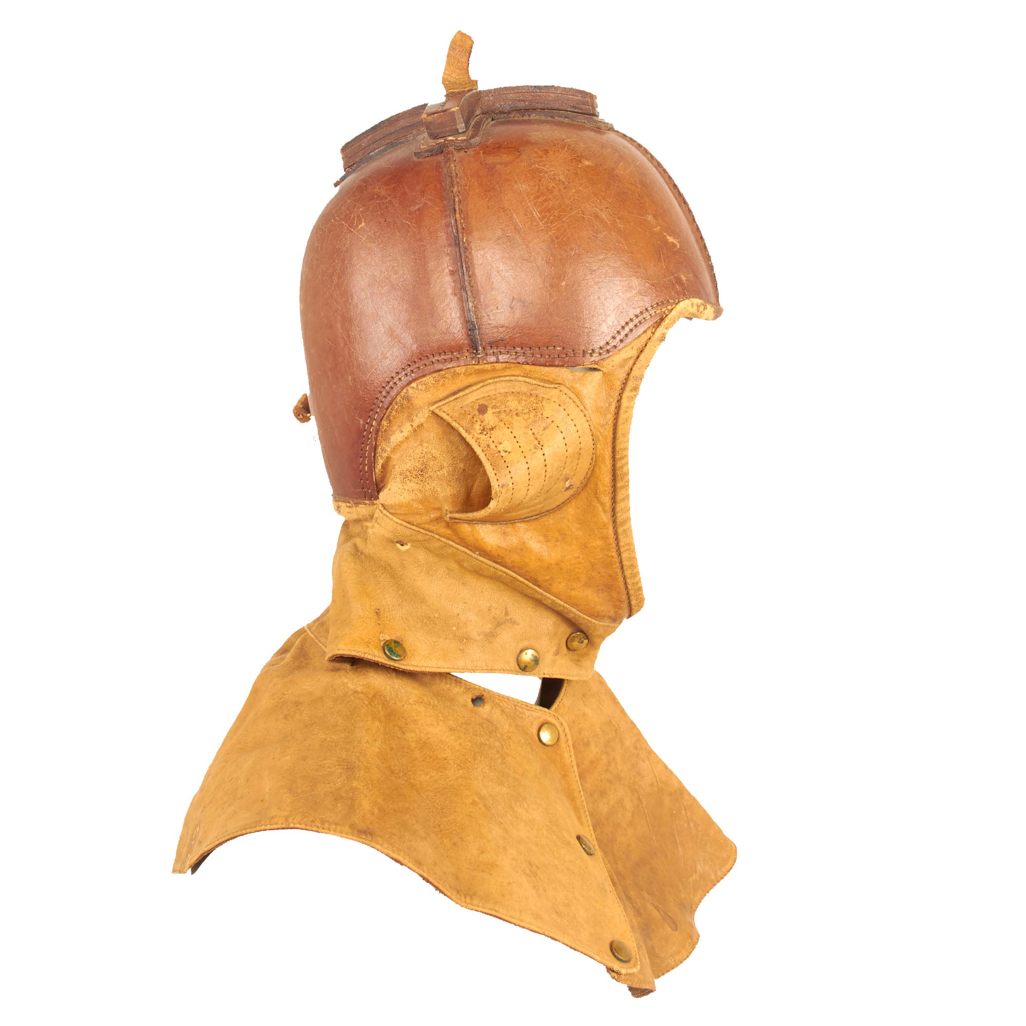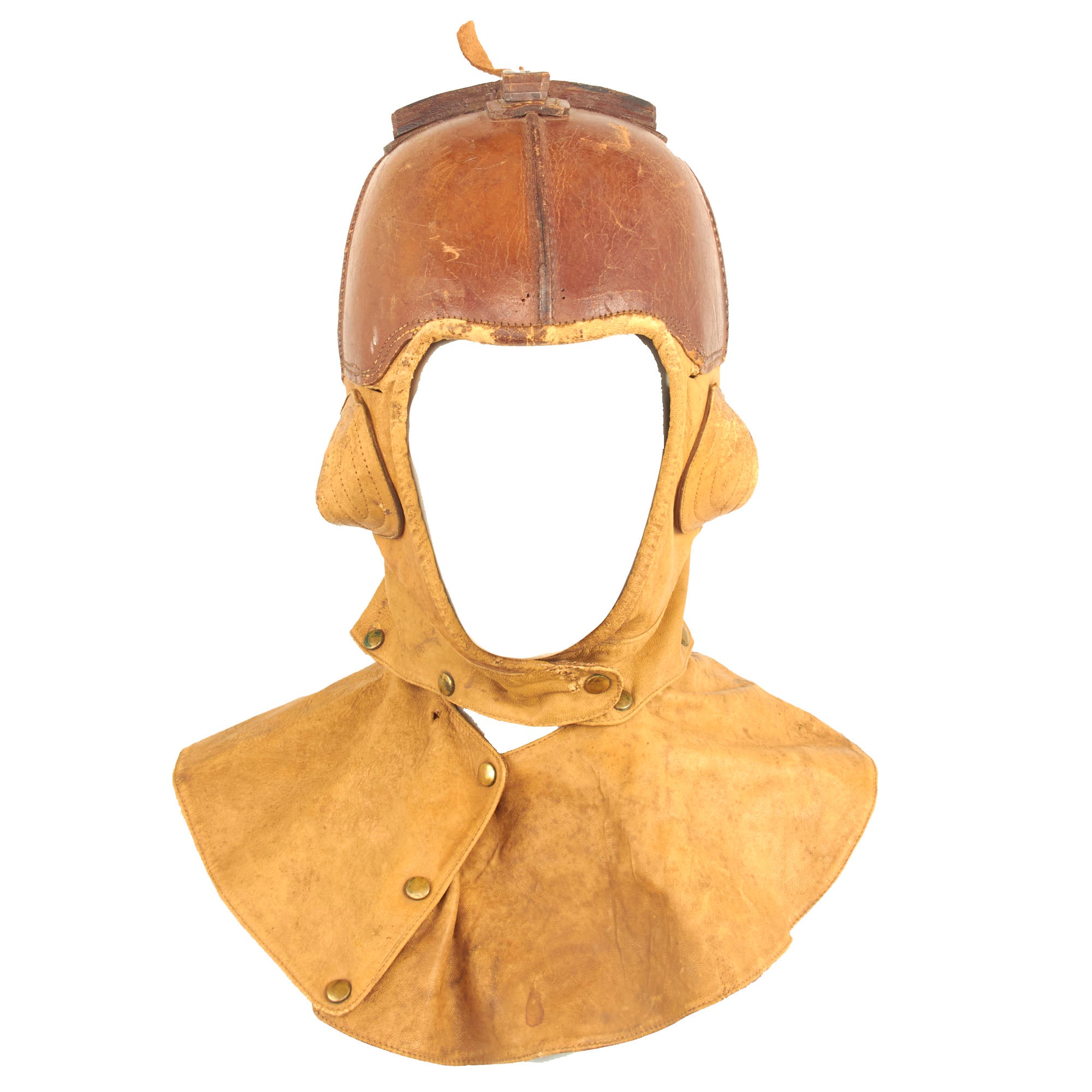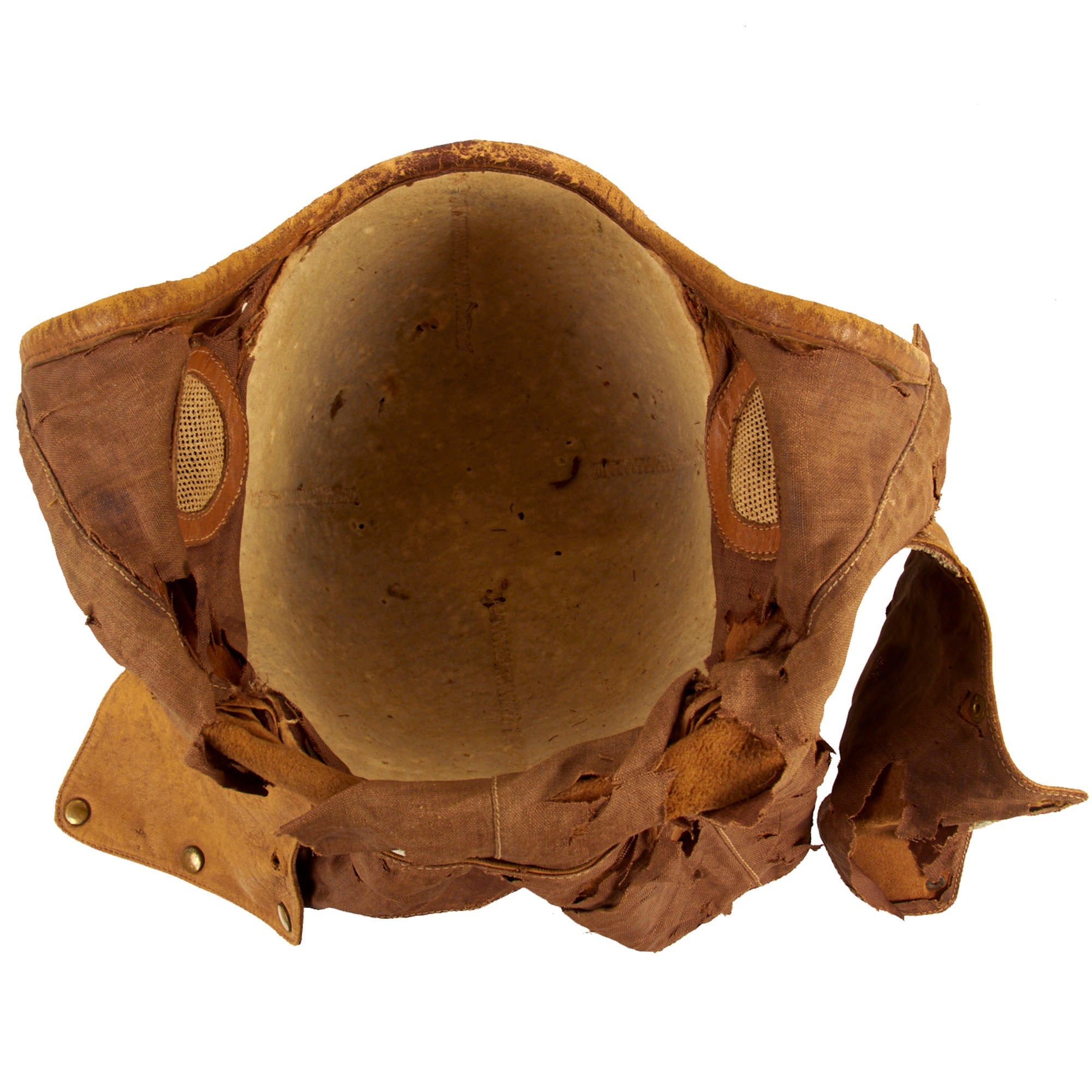 Original Items: Only One Available. Original Item: Only One Available. This fantastic ultra rare example of a genuine WWI Aviator flying helmet is made of a stiff leather, much like the leather shells of the WWI German pickelhaub helmets. Below the stiff leather bowl is a supple leather apron that covers the pilots neck. The internal ears are covered with a fabric mesh material and the interior of the entire helmet is lined with a soft cotton canvas. This example is size stamped 7 and is not maker marked on the back, but it’s identical construction to similar ones in the past, we do believe this to be another Spalding example.