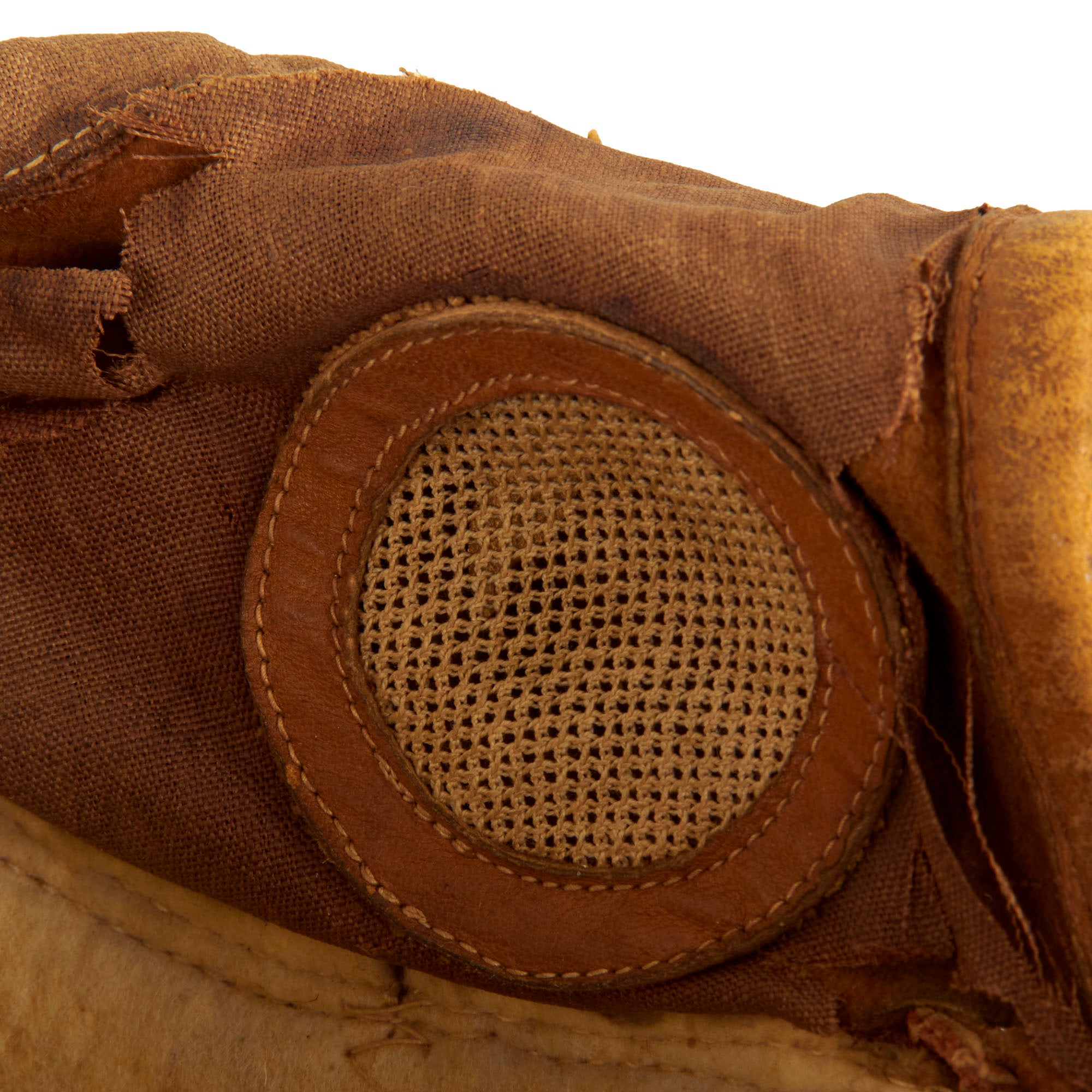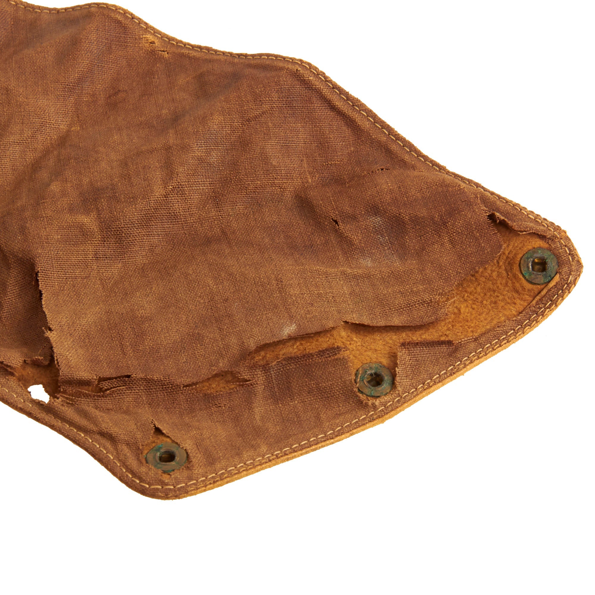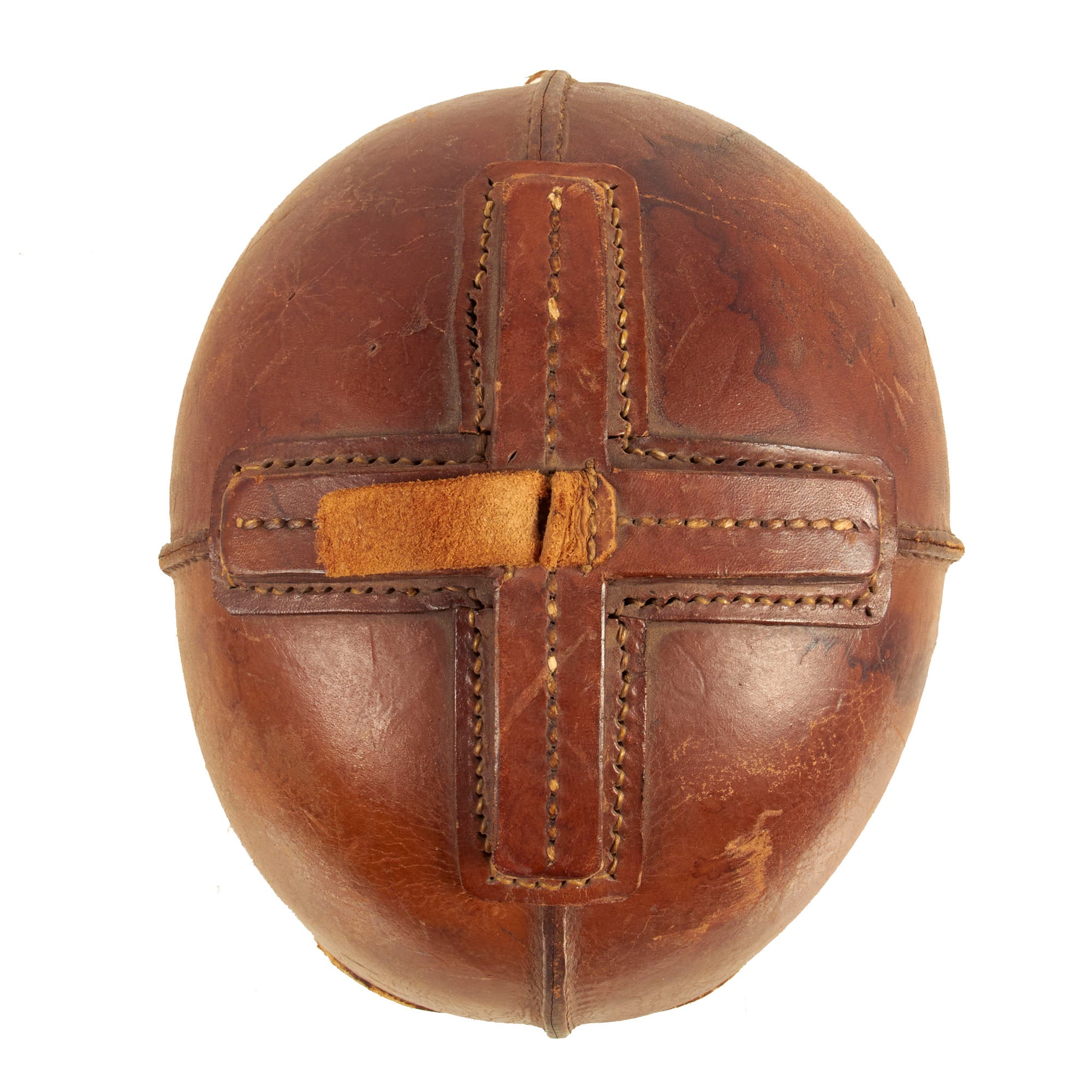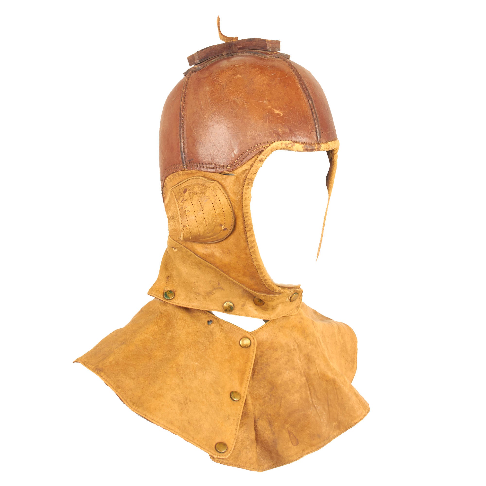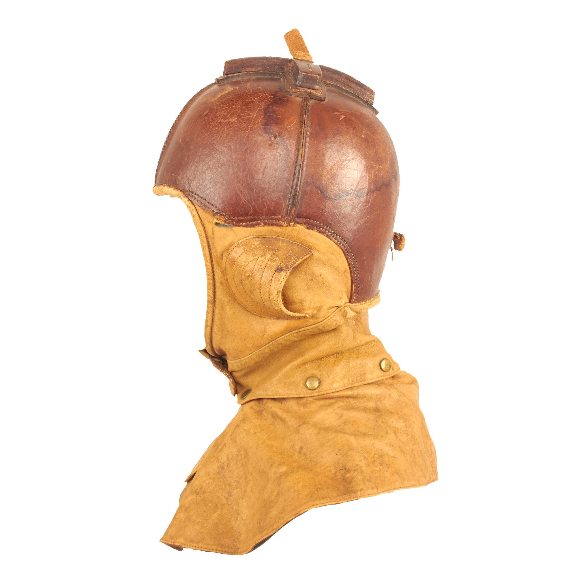 Original Items: Only One Available. Original Item: Only One Available. This fantastic ultra rare example of a genuine WWI Aviator flying helmet is made of a stiff leather, much like the leather shells of the WWI German pickelhaub helmets. Below the stiff leather bowl is a supple leather apron that covers the pilots neck. The internal ears are covered with a fabric mesh material and the interior of the entire helmet is lined with a soft cotton canvas. This example is size stamped 7 and is not maker marked on the back, but it’s identical construction to similar ones in the past, we do believe this to be another Spalding example.