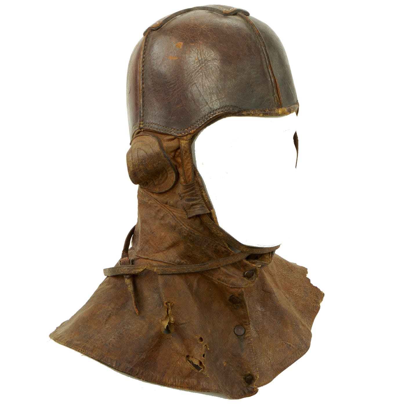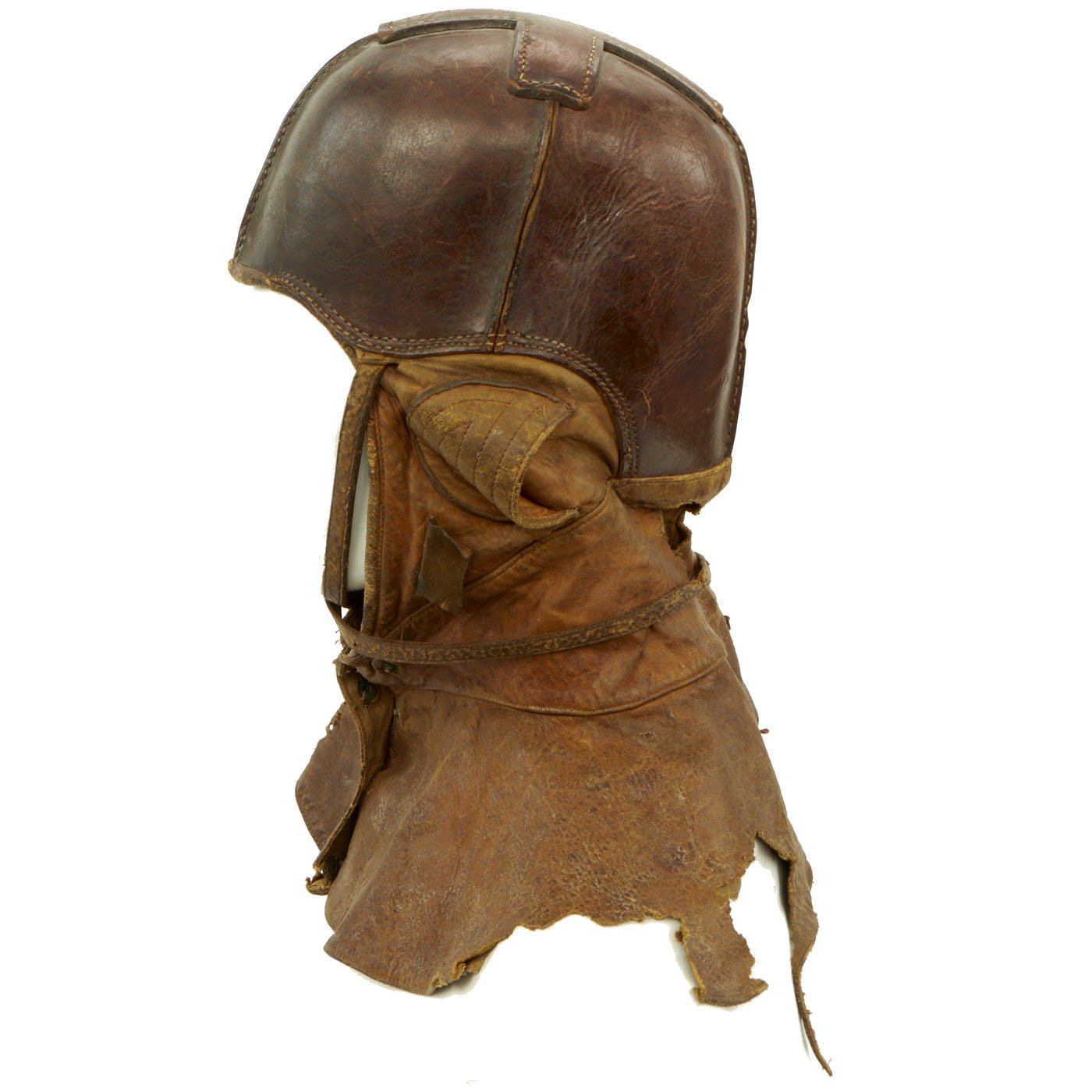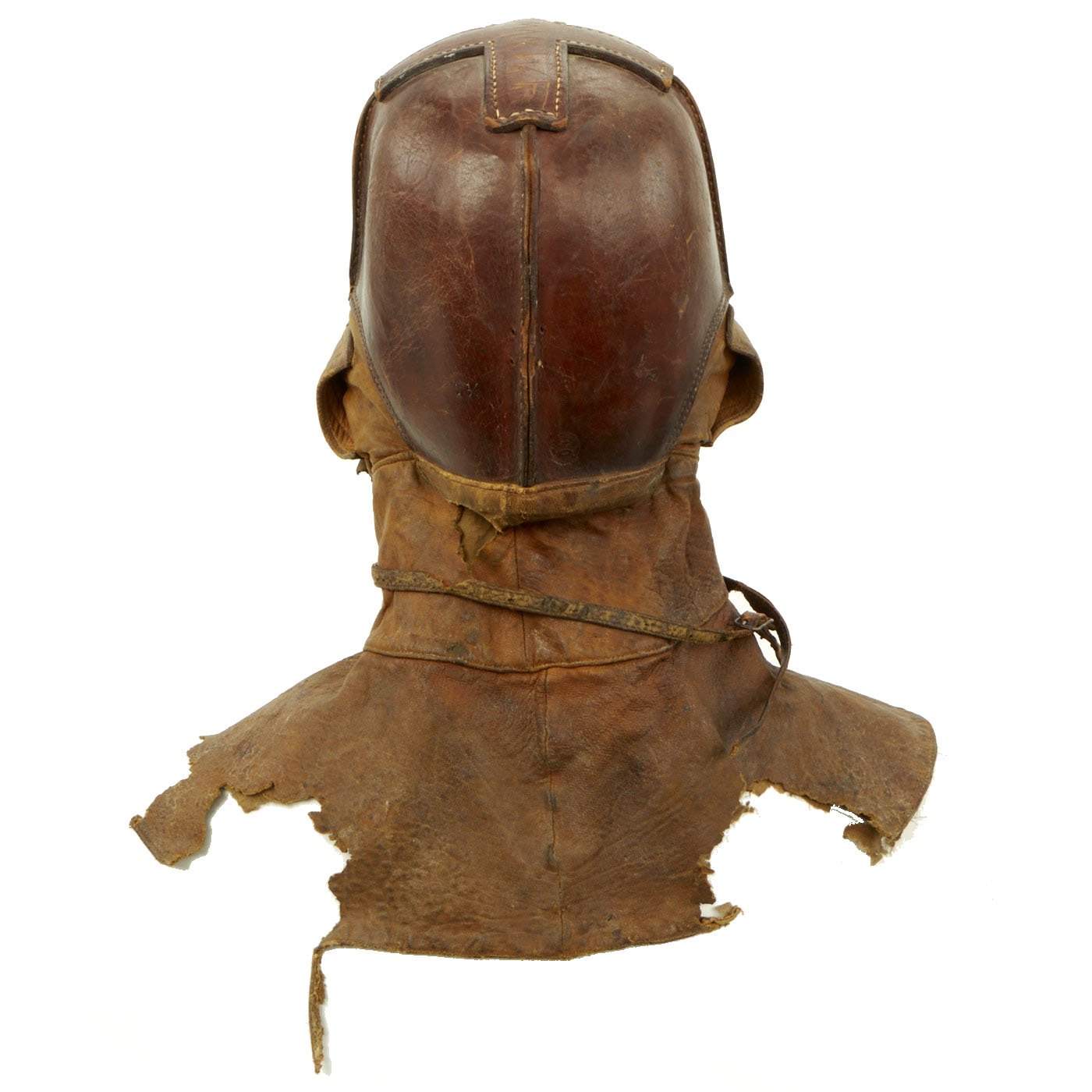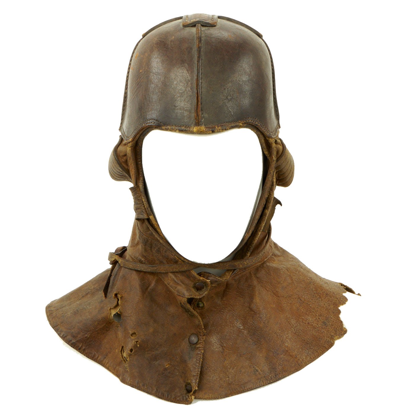 Original Item: Only One Available. This fantastic ultra rare example of a genuine WWI Aviator flying helmet is made of a stiff leather, much like the leather shells of the WWI German pickelhaub helmets. Below the stiff leather bowl is a supple leather apron that cover's the pilots neck and upper shoulders. The internal ears are covered with a fabric mesh material and the interior of the entire helmet is lined with a soft cotton canvas. This example is size stamped 7 1/4 and is maker marked on the back by the AG Spalding Company.