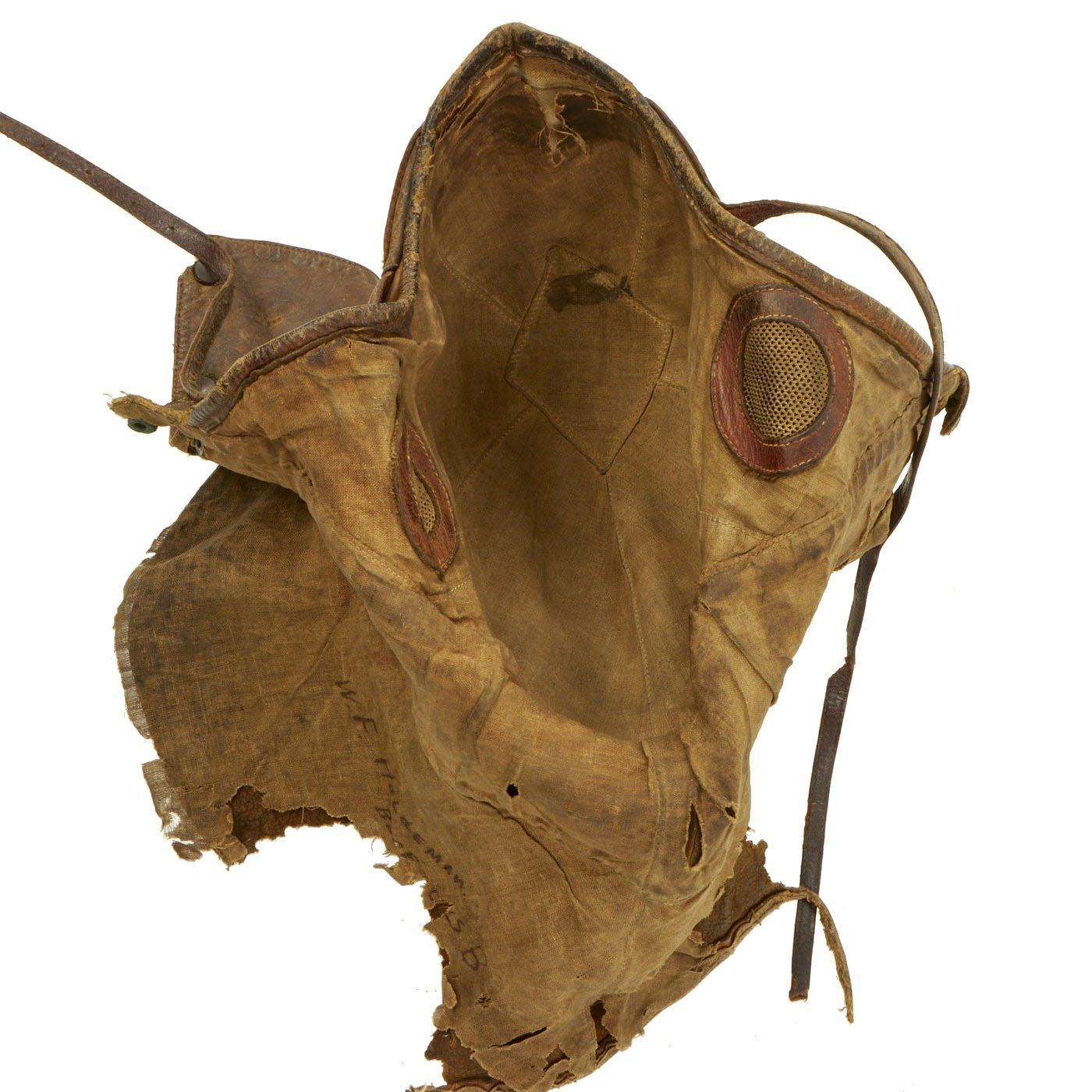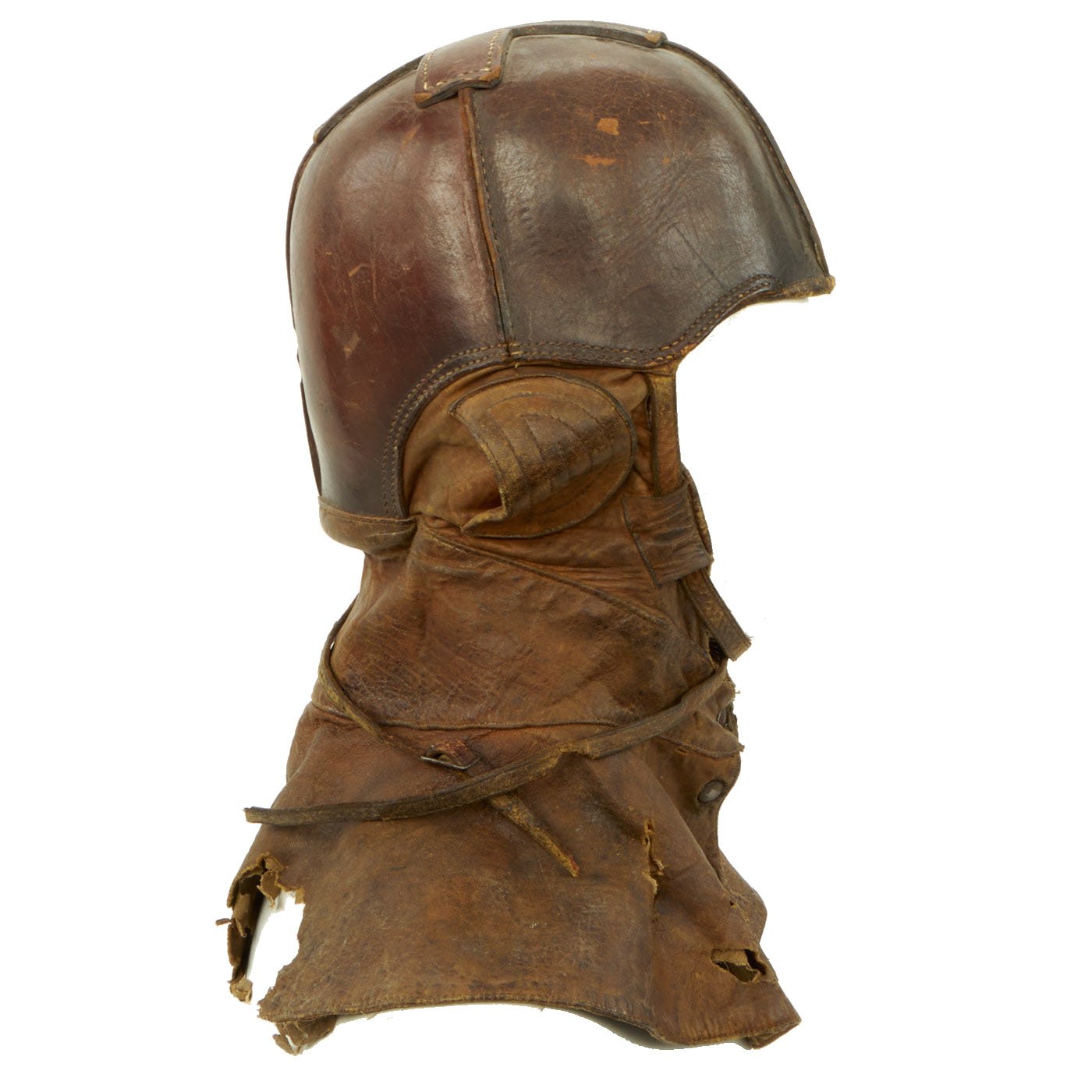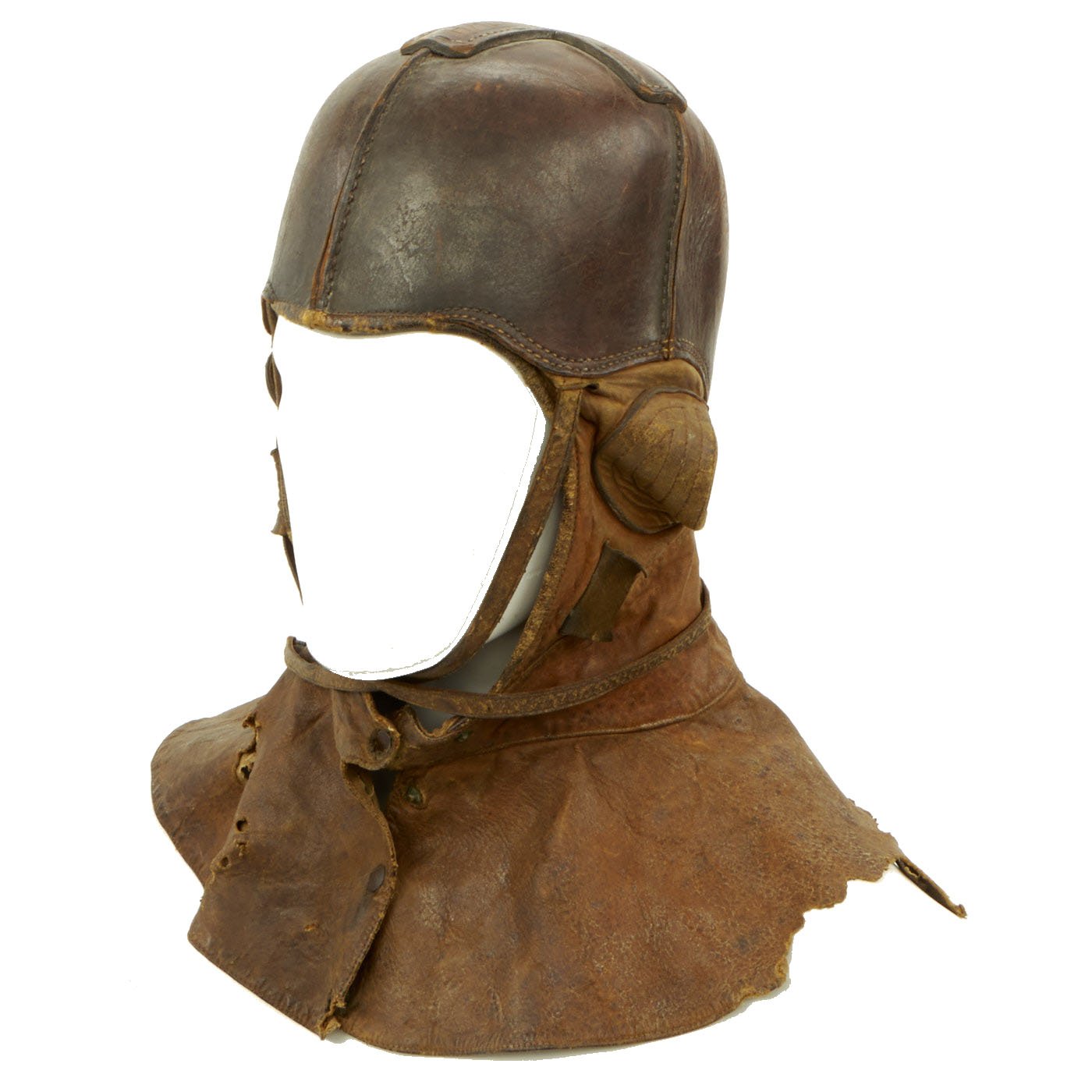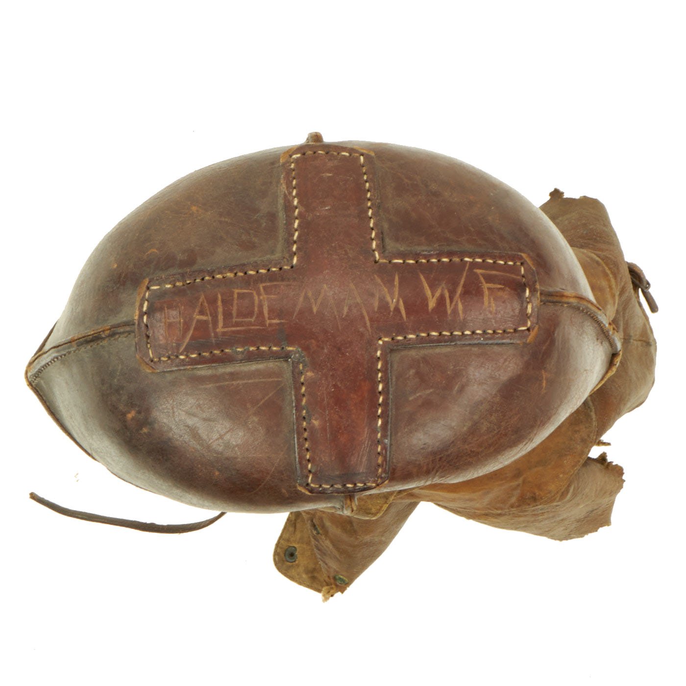 Original Item: Only One Available. This fantastic ultra rare example of a genuine WWI Aviator flying helmet is made of a stiff leather, much like the leather shells of the WWI German pickelhaub helmets. Below the stiff leather bowl is a supple leather apron that cover's the pilots neck and upper shoulders. The internal ears are covered with a fabric mesh material and the interior of the entire helmet is lined with a soft cotton canvas. This example is size stamped 7 1/4 and is maker marked on the back by the AG Spalding Company.