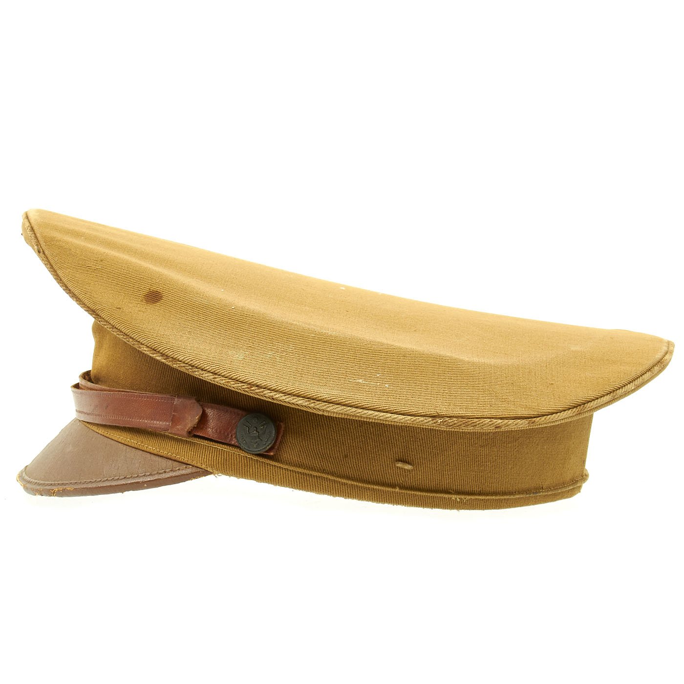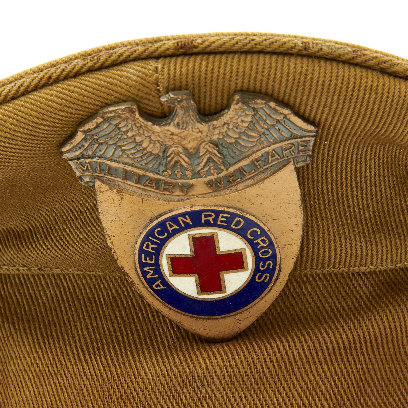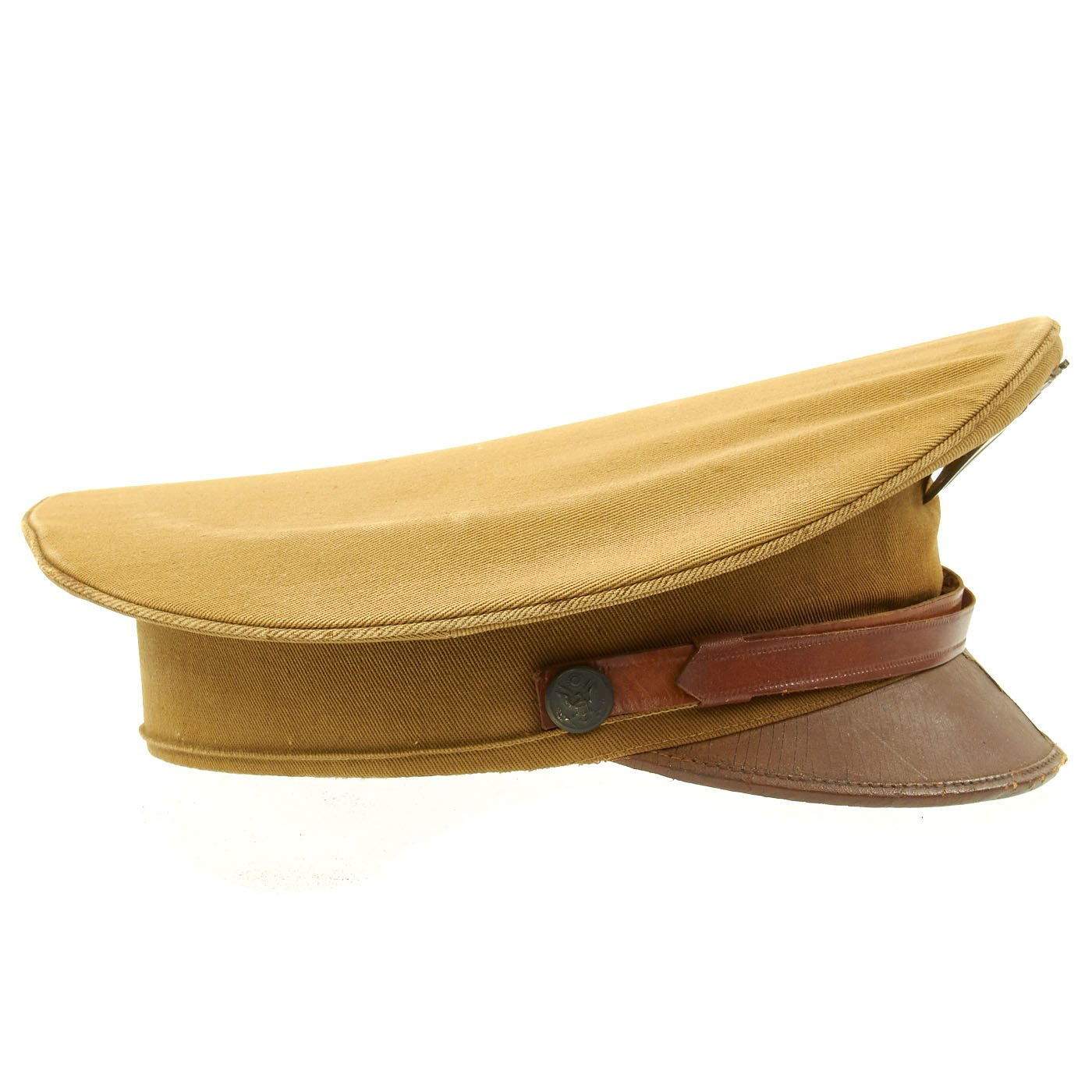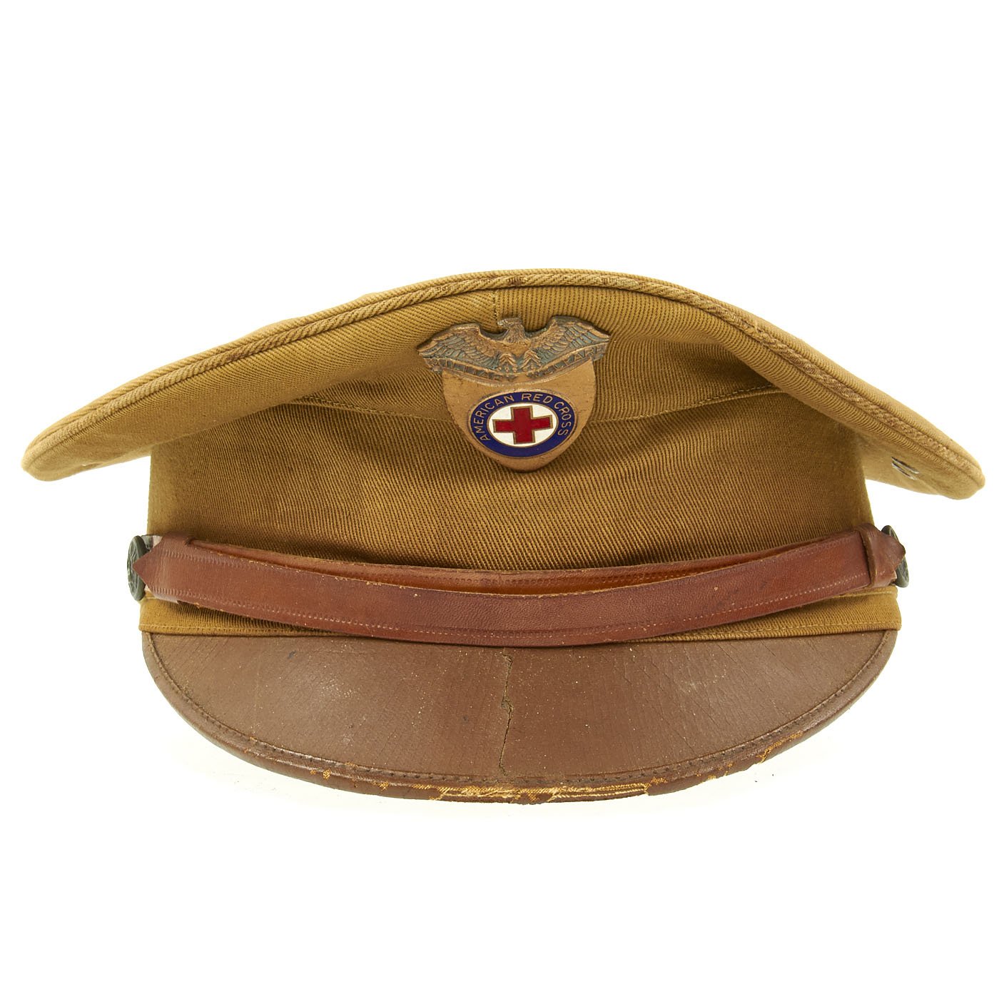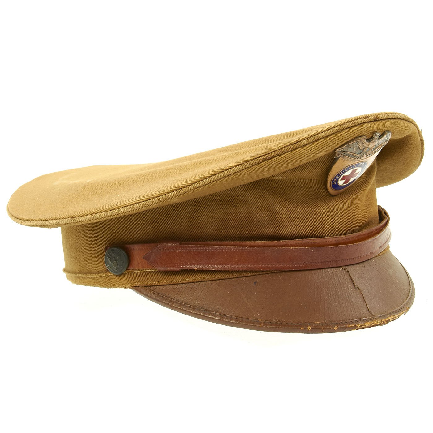 Original Item: One-of-a-kind. This is an original WWI Era United States Army Officer visor cap with the mohair band removed and the typical Eagle cap badge replaced with a screw back bronze and enamel ARC hat shield. Cap features leather visor and sweatband, leather chinstrap and brass eagle buttons. Hat size is approximately US 7 (56cm).