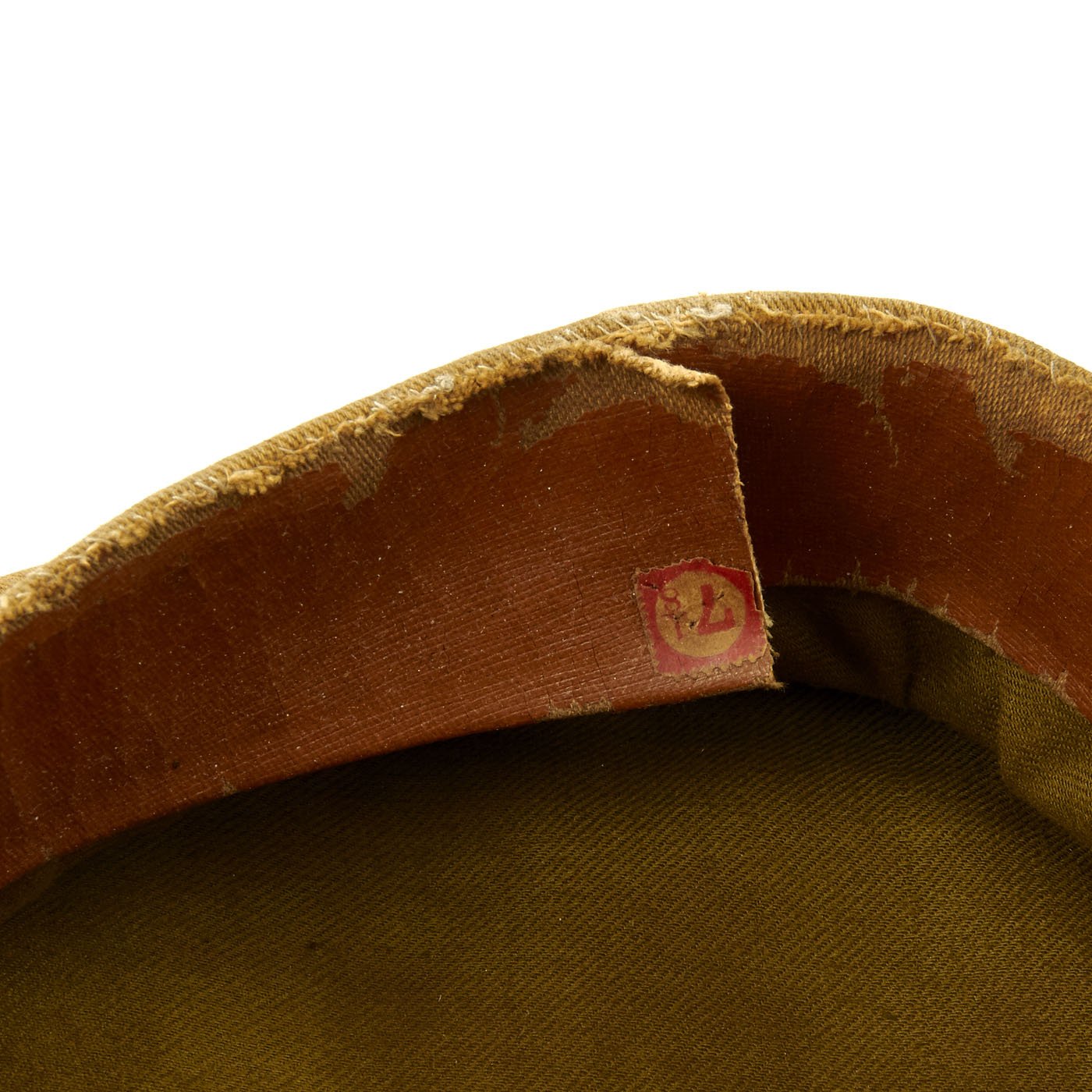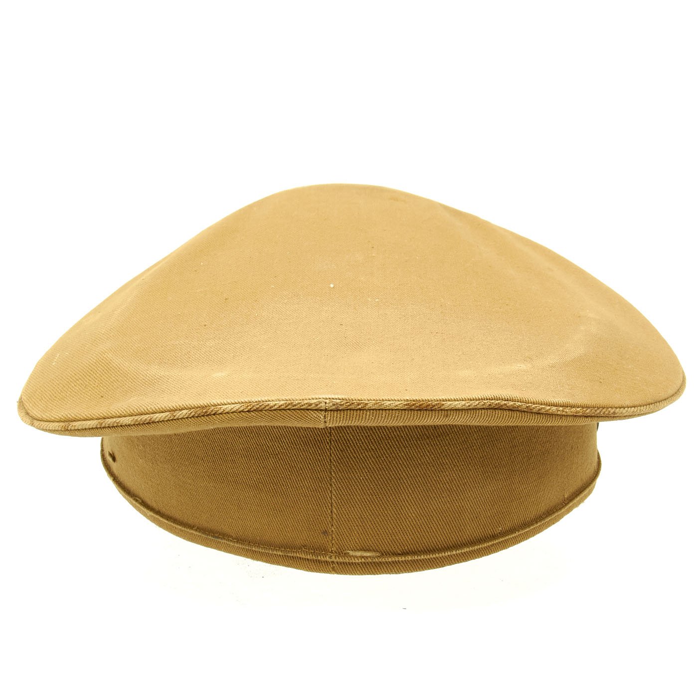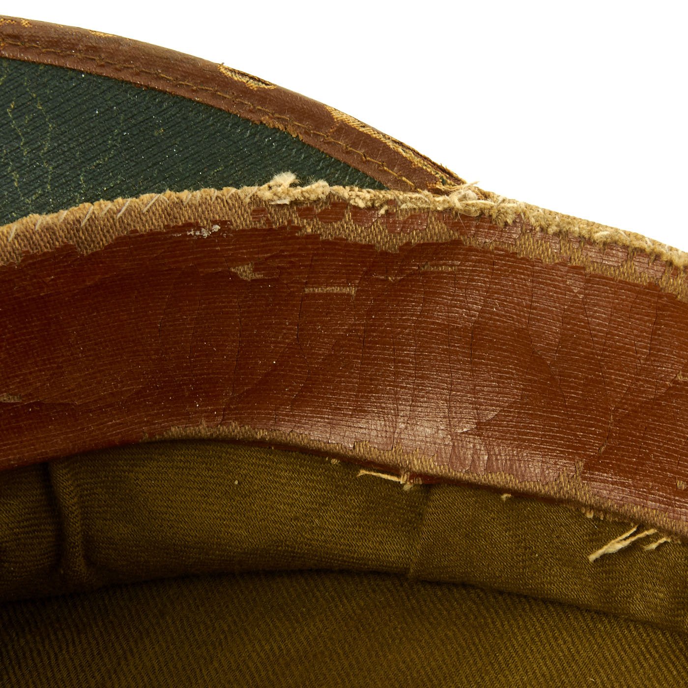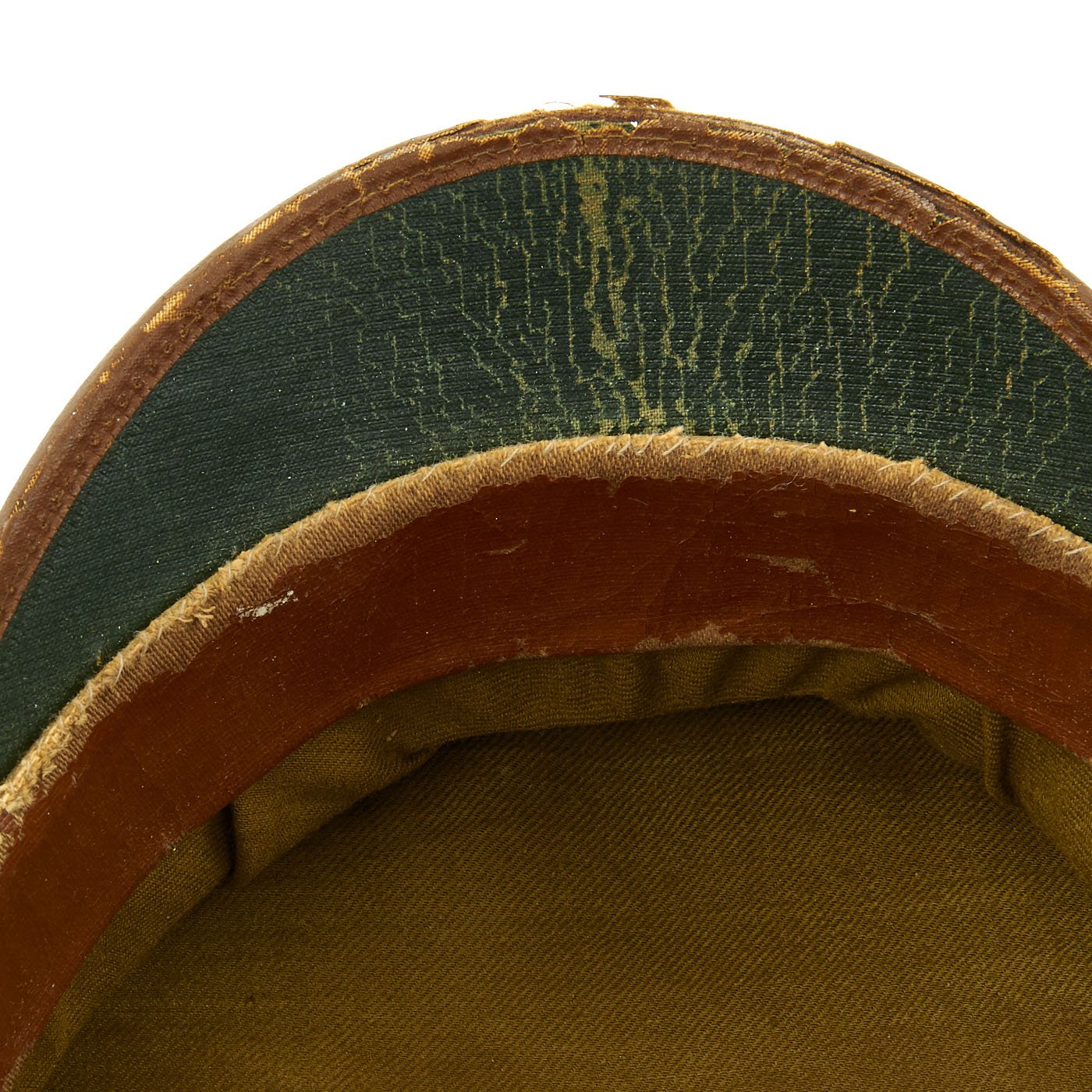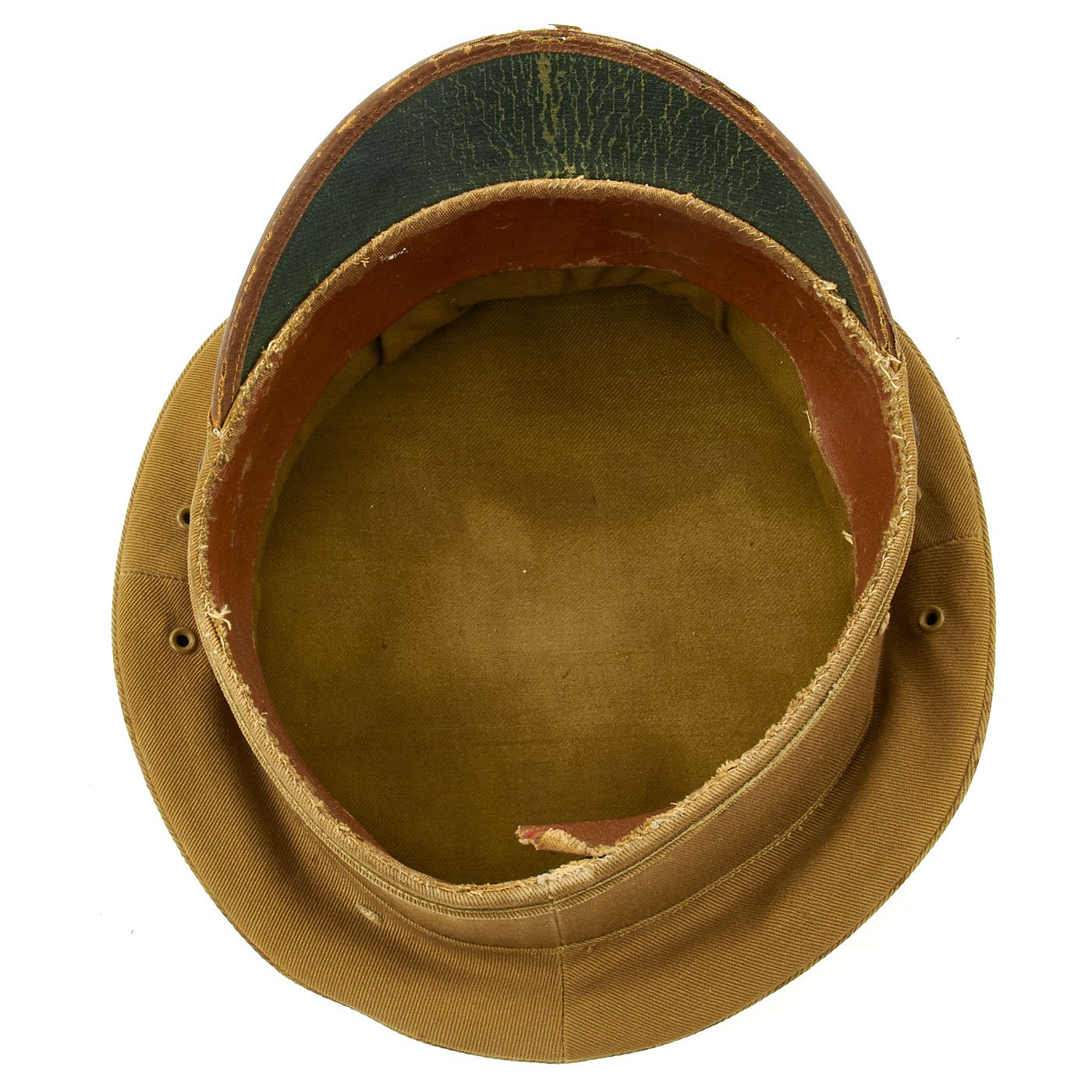 Original Item: One-of-a-kind. This is an original WWI Era United States Army Officer visor cap with the mohair band removed and the typical Eagle cap badge replaced with a screw back bronze and enamel ARC hat shield. Cap features leather visor and sweatband, leather chinstrap and brass eagle buttons. Hat size is approximately US 7 (56cm).