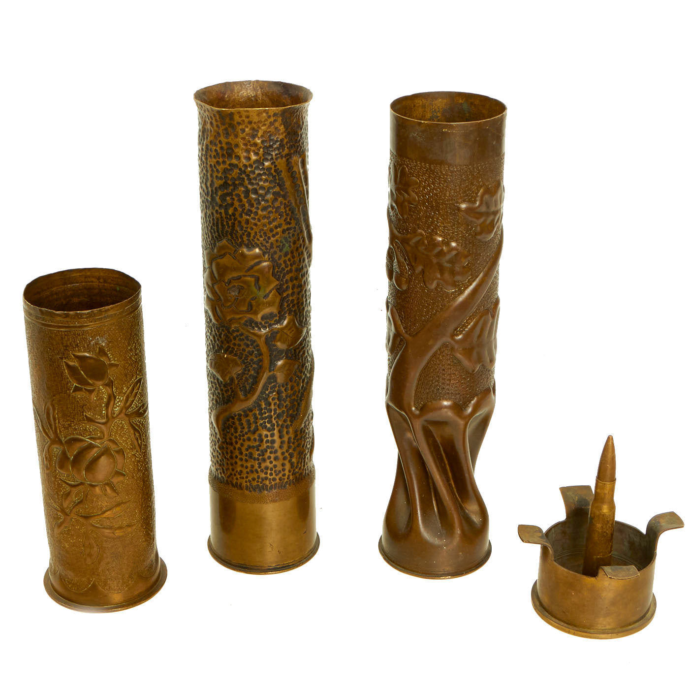 Original Items: Only One Lot of 4 Available. Trench art is any decorative item made by soldiers, prisoners of war, or civilians where the manufacture is directly linked to armed conflict or its consequences. It offers an insight not only to their feelings and emotions about the war, but also their surroundings and the materials they had available to them.