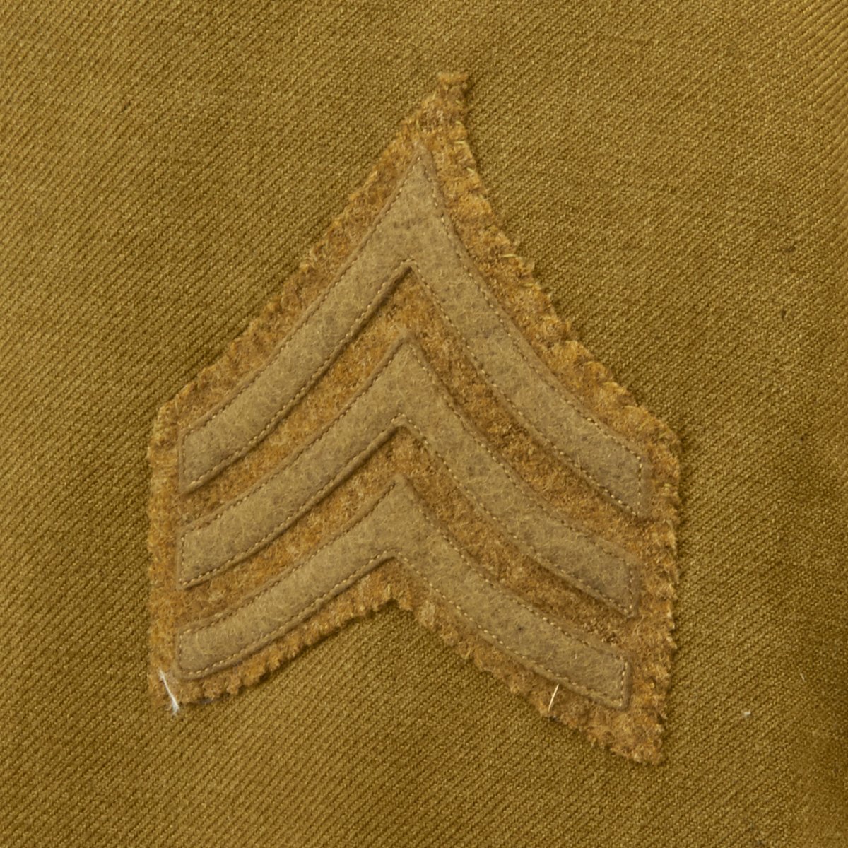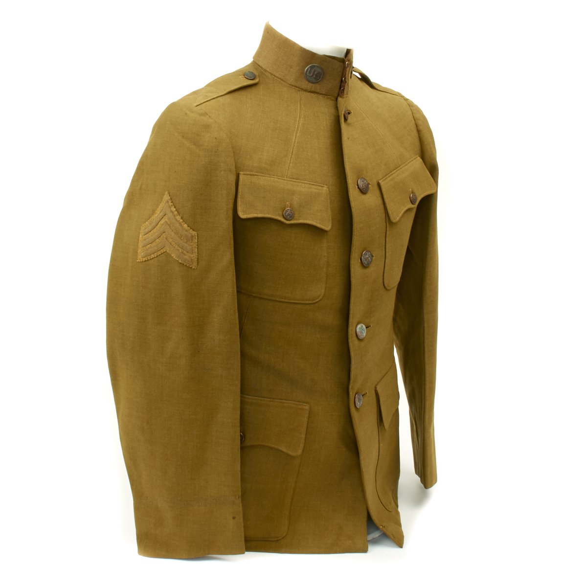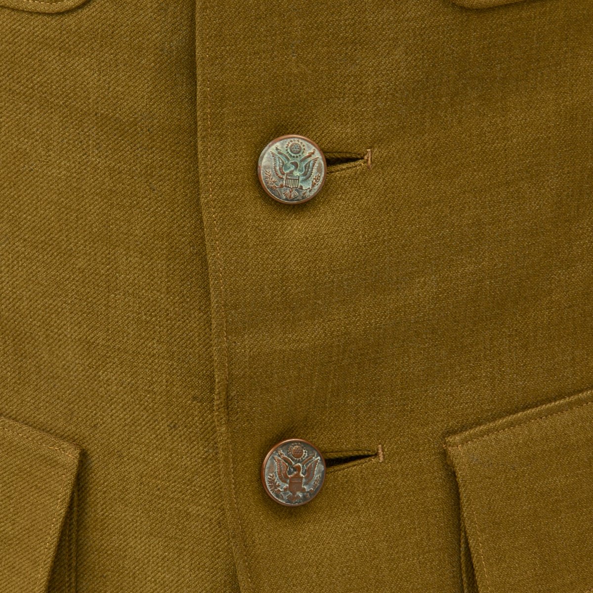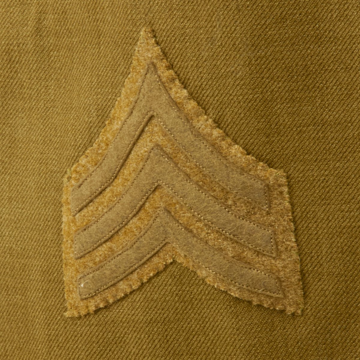 On the upper sleeves are the three stripes indicating sergeant's rank. On the right collar is the aviation disc indicating his Air Service assignment and on the left collar is the round U.S. Army disc. All buttons for the pockets and front closure and epaulettes display the U.S. Army eagle insignia.