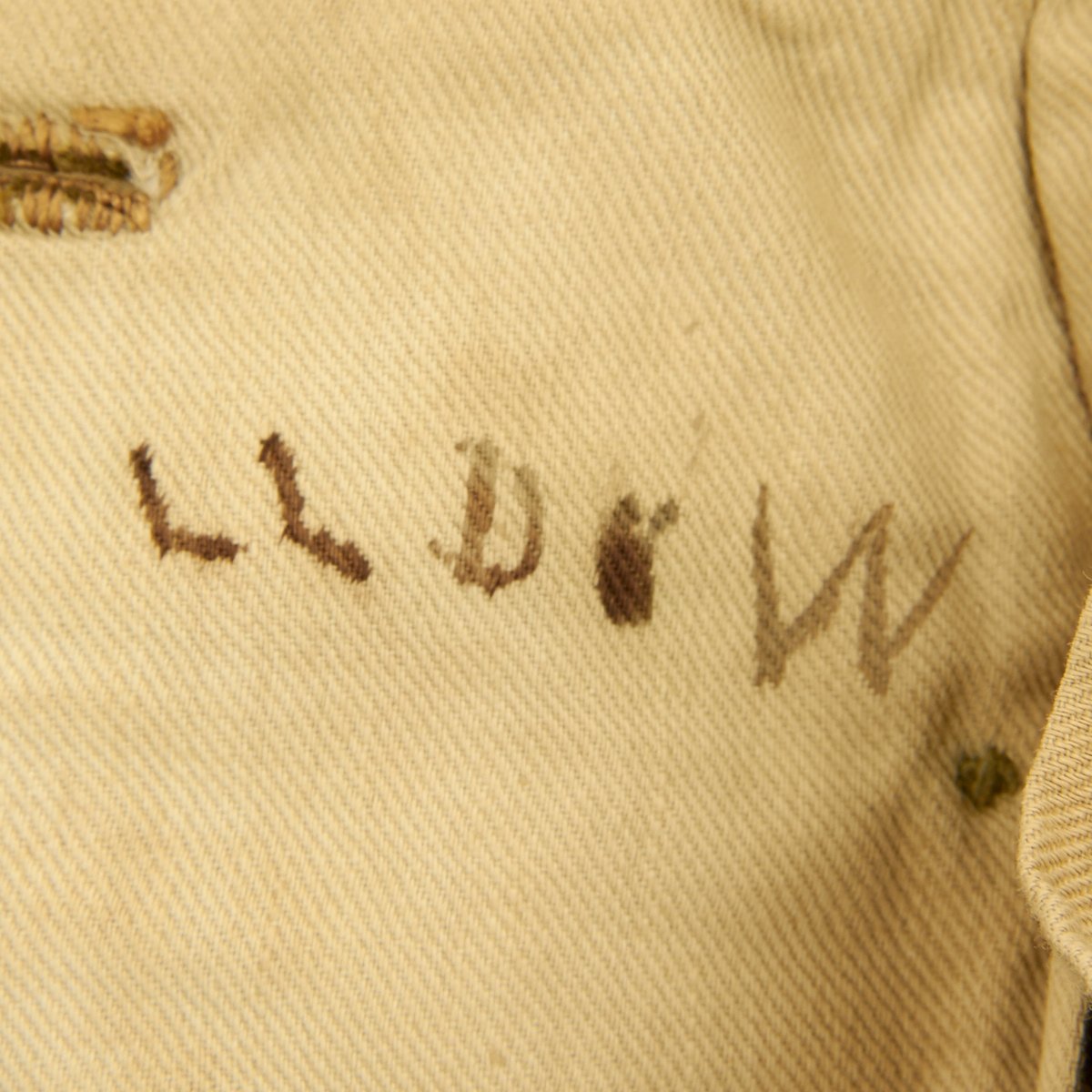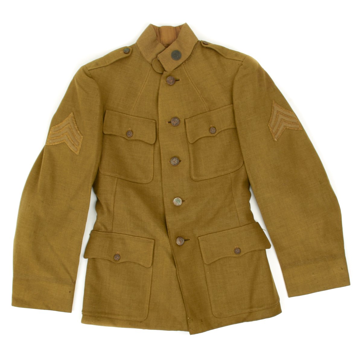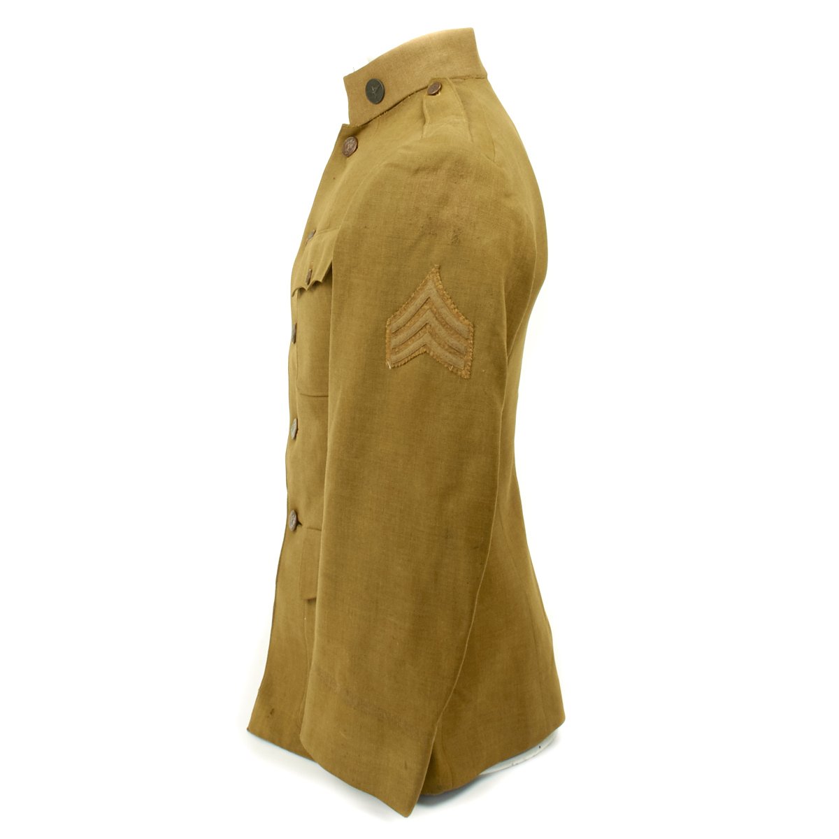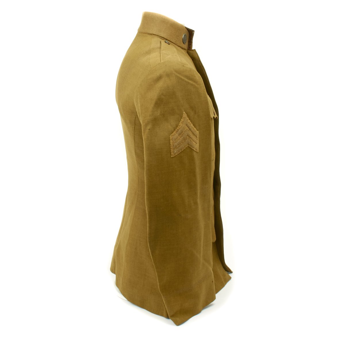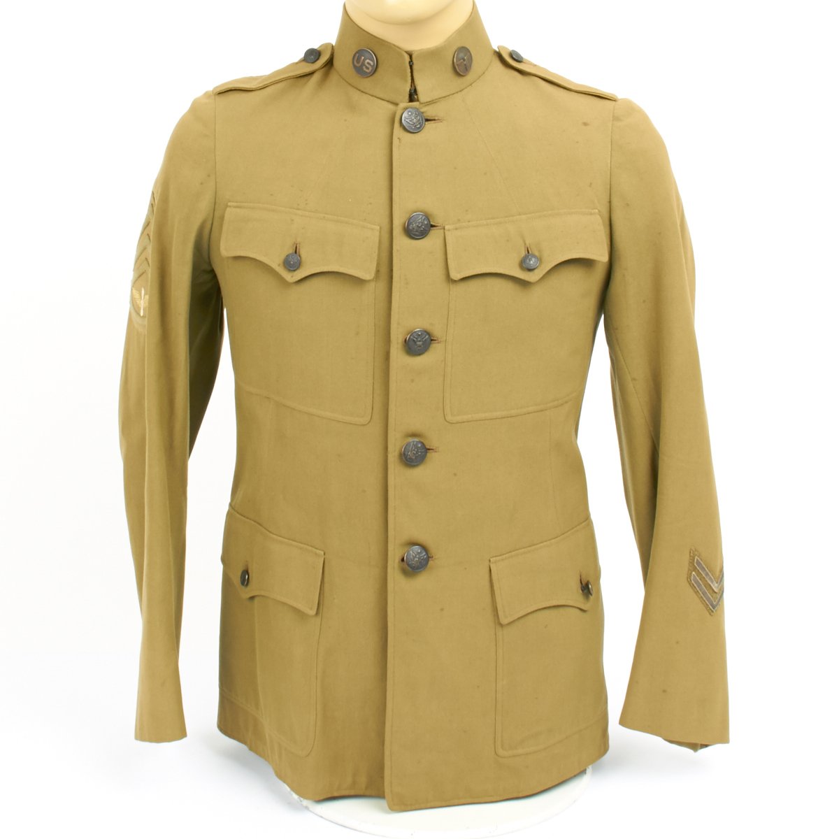 On the upper sleeves are the three stripes indicating sergeant's rank. On the right collar is the aviation disc indicating his Air Service assignment and on the left collar is the round U.S. Army disc. All buttons for the pockets and front closure and epaulettes display the U.S. Army eagle insignia.