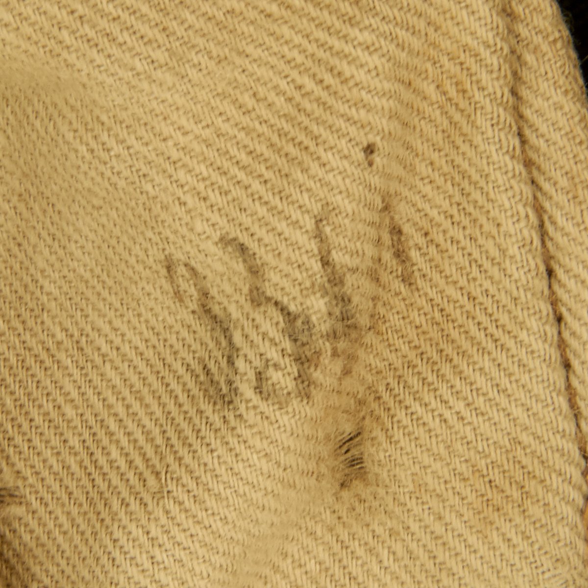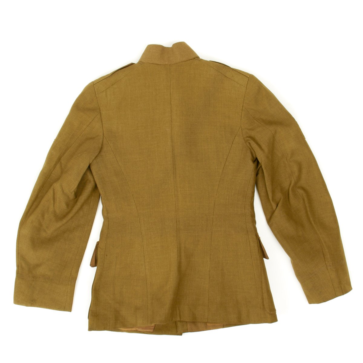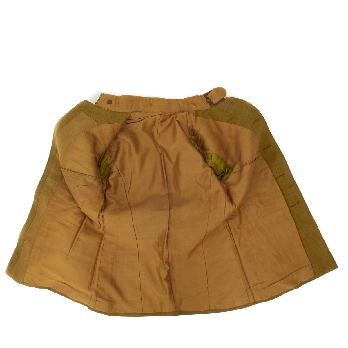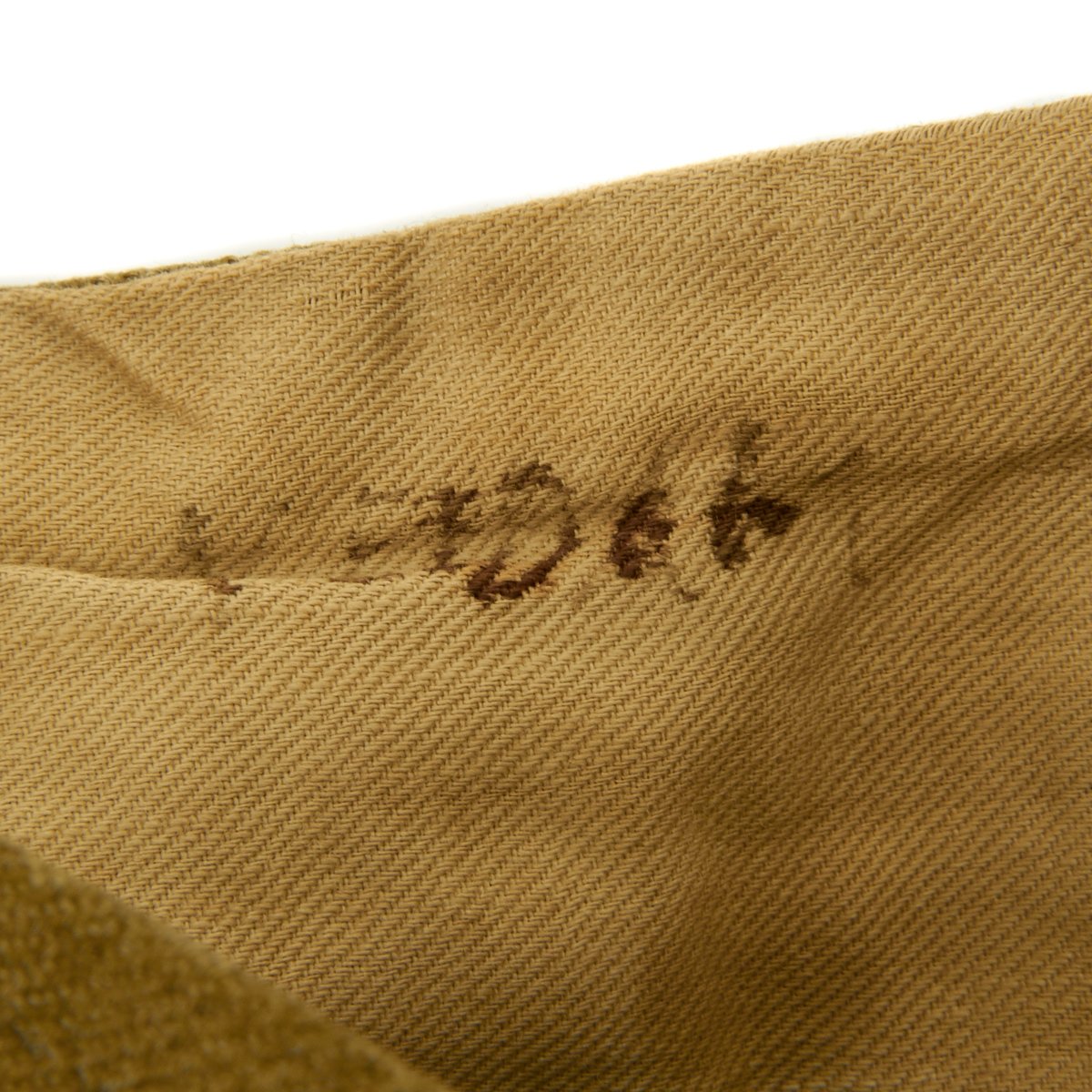 U.S. Army Air Service sergeant's M17 tunic and breeches. This uniform ensemble features scalloped patch breast and hip pockets, single line stitching along the sleeve bottoms, stand-up collar with grommets for attaching the collar service discs, coarse brown wool, five eagle button front closure, two hook collar closure and shoulder epaulettes. The interior is lined with tan cotton.