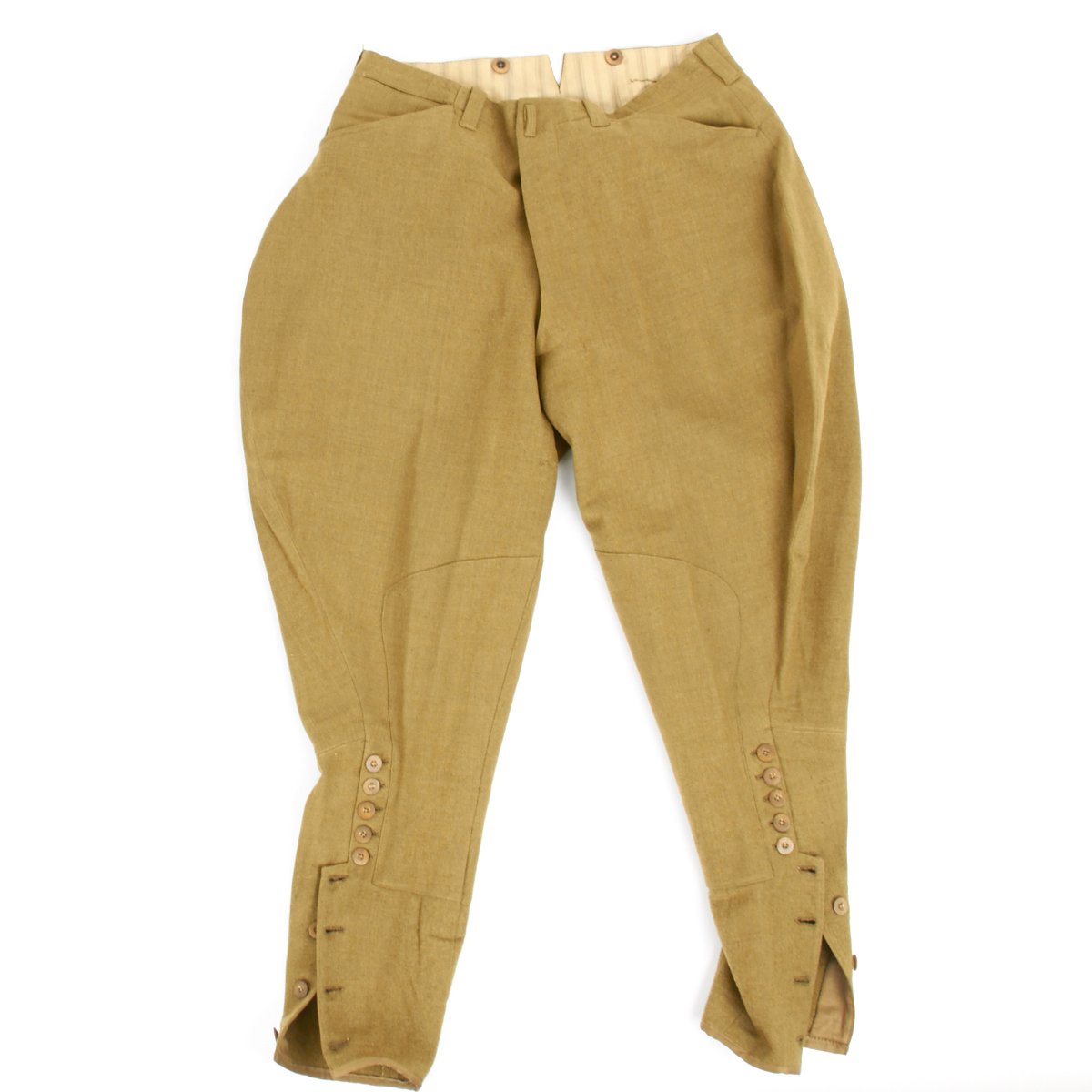 The model 1917 breeches feature two front maternity style single button pockets along with a watch pocket. The seat also displays one slash pocket. Each pant leg ends with a double row of six (6) grommets for lacing the breeches. The interior waistline is lined with cream cotton fabric.