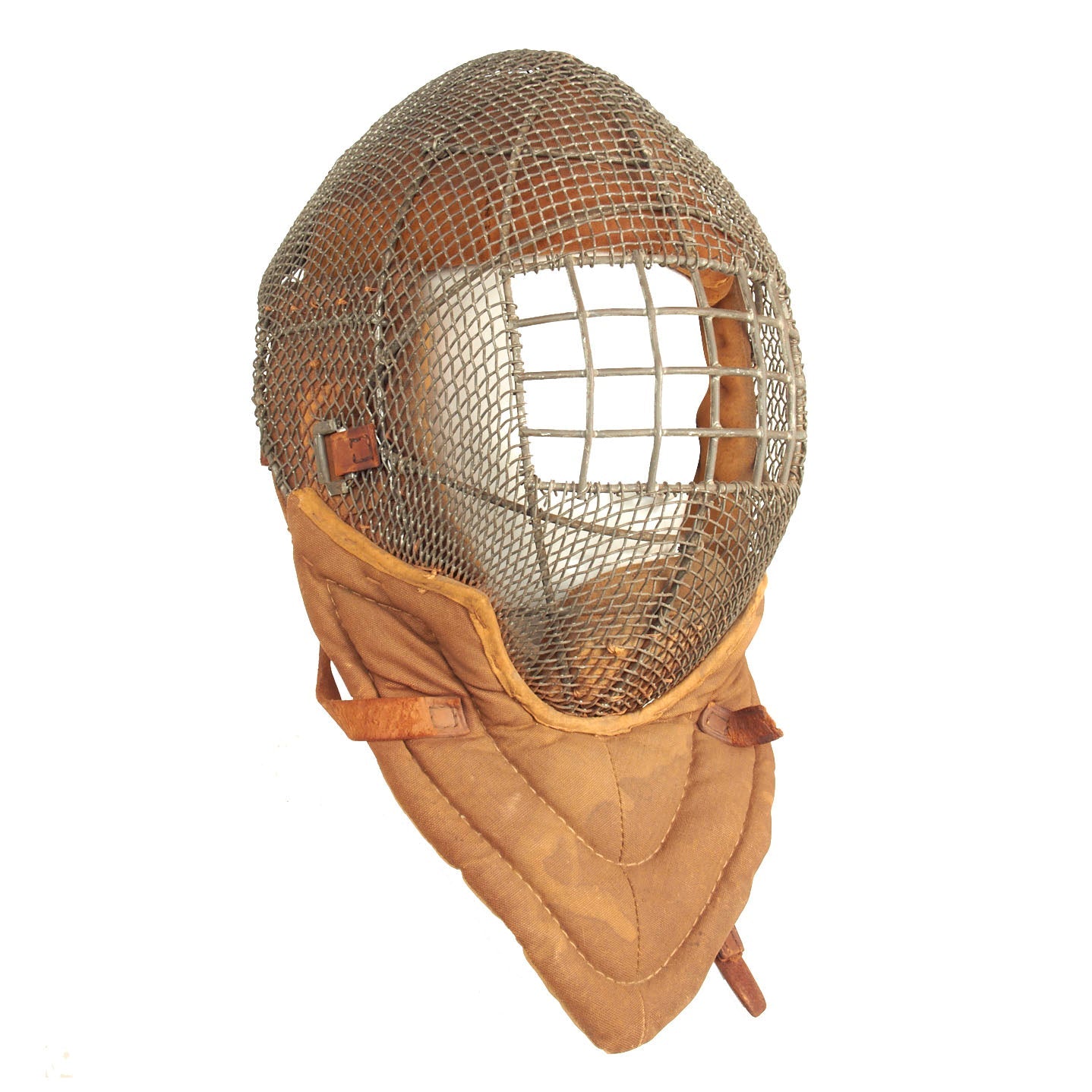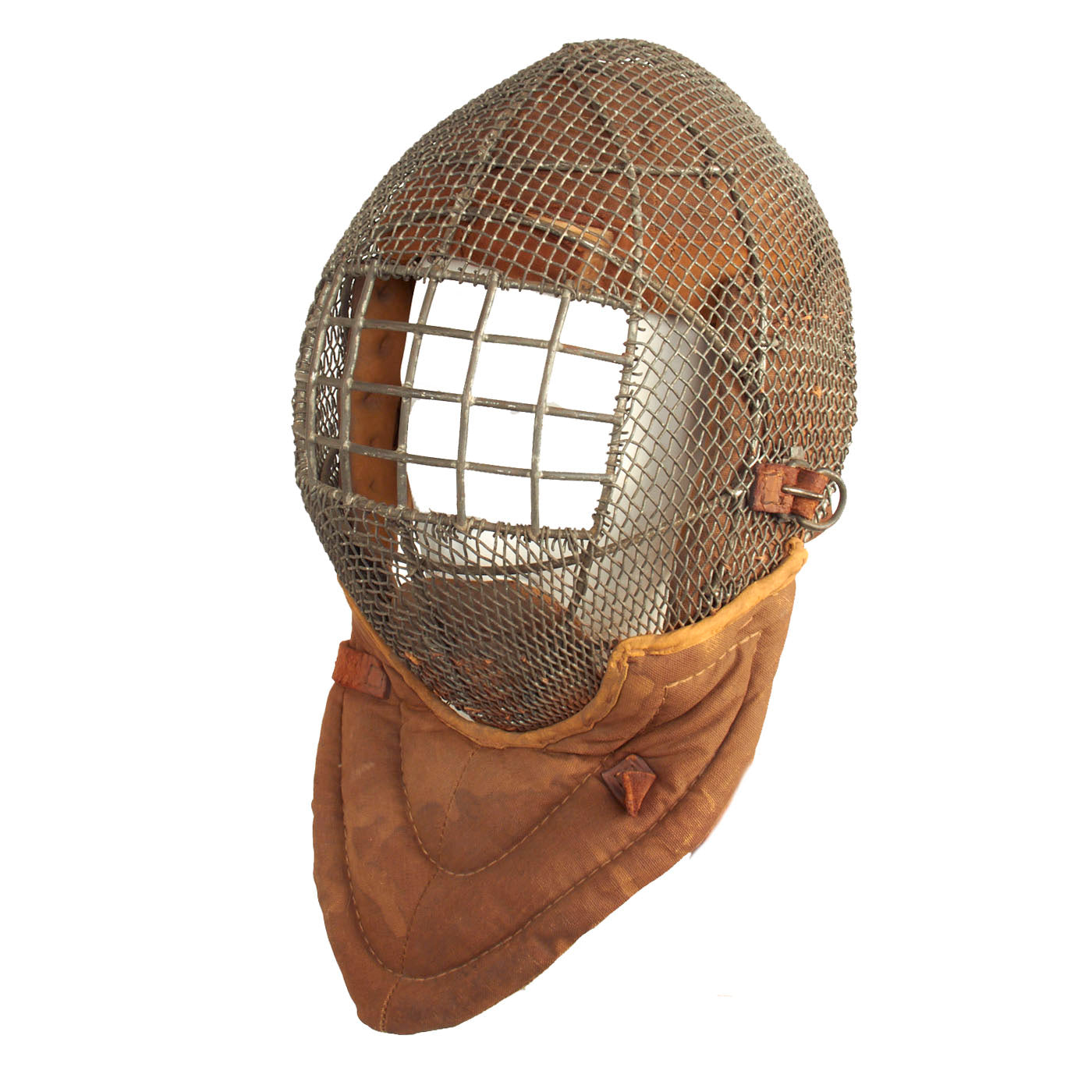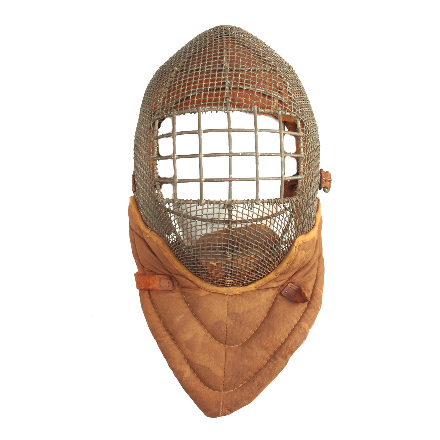 This mask, along with the vest and gauntlet set, are for the saber and the fighting techniques specific to its use. This mask measures 19" high by 9" wide. It covers the wearer's head from the crown forward, including the ears on the sides. It features a covering made of fine mesh steel wire, the spacing of which is much greater in front so as not to obstruct vision. There is soft leather-lined padding along the top and cheeks, and a quilted upper chest and throat protector extending eight inches below the chin. Leather straps with buckles are used to fasten the device to the wearer's head along with a spring-loaded pad that secures it in the back. This mask is in very good condition, but shows obvious signs of honest use and years of storage wear. The leather, while supple and flexible still, is very dry. All straps are intact, however one is broken. There are some minor tears to the padding inside the helmet, but nothing which would distract from its outward appearance while on display.