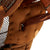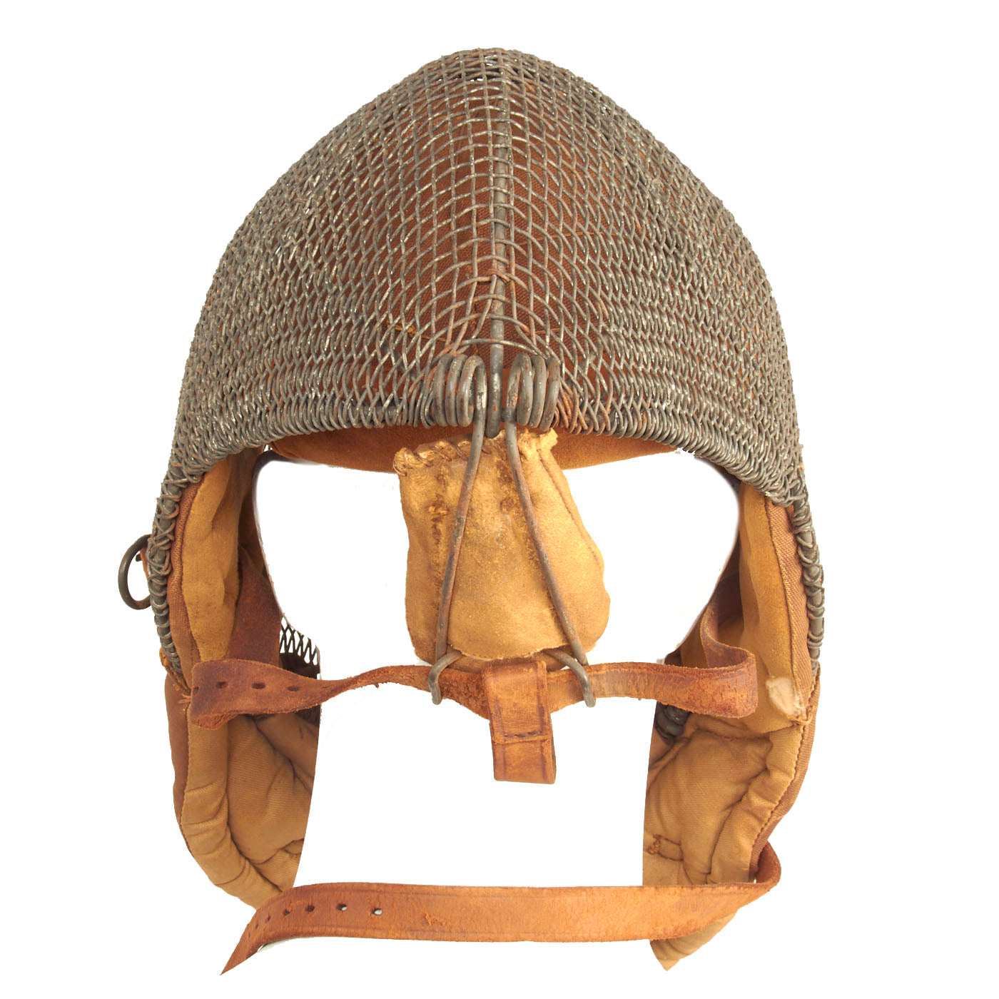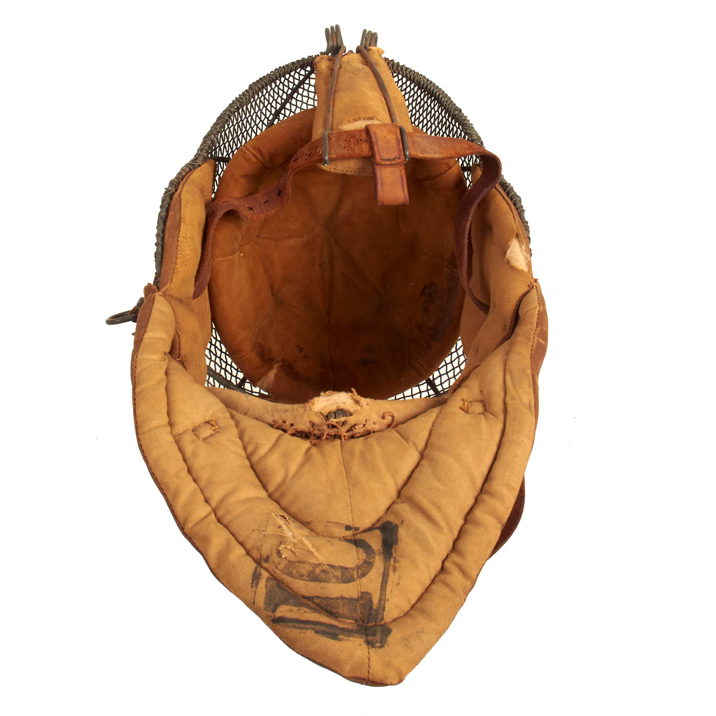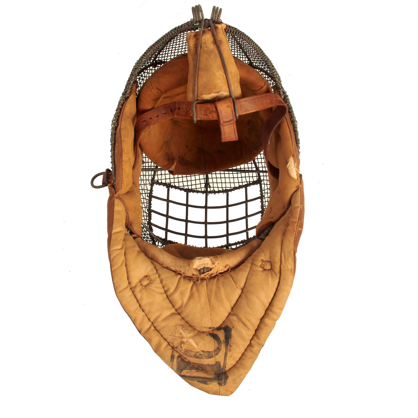 This mask, along with the vest and gauntlet set, are for the saber and the fighting techniques specific to its use. This mask measures 19" high by 9" wide. It covers the wearer's head from the crown forward, including the ears on the sides. It features a covering made of fine mesh steel wire, the spacing of which is much greater in front so as not to obstruct vision. There is soft leather-lined padding along the top and cheeks, and a quilted upper chest and throat protector extending eight inches below the chin. Leather straps with buckles are used to fasten the device to the wearer's head along with a spring-loaded pad that secures it in the back. This mask is in very good condition, but shows obvious signs of honest use and years of storage wear. The leather, while supple and flexible still, is very dry. All straps are intact, however one is broken. There are some minor tears to the padding inside the helmet, but nothing which would distract from its outward appearance while on display.