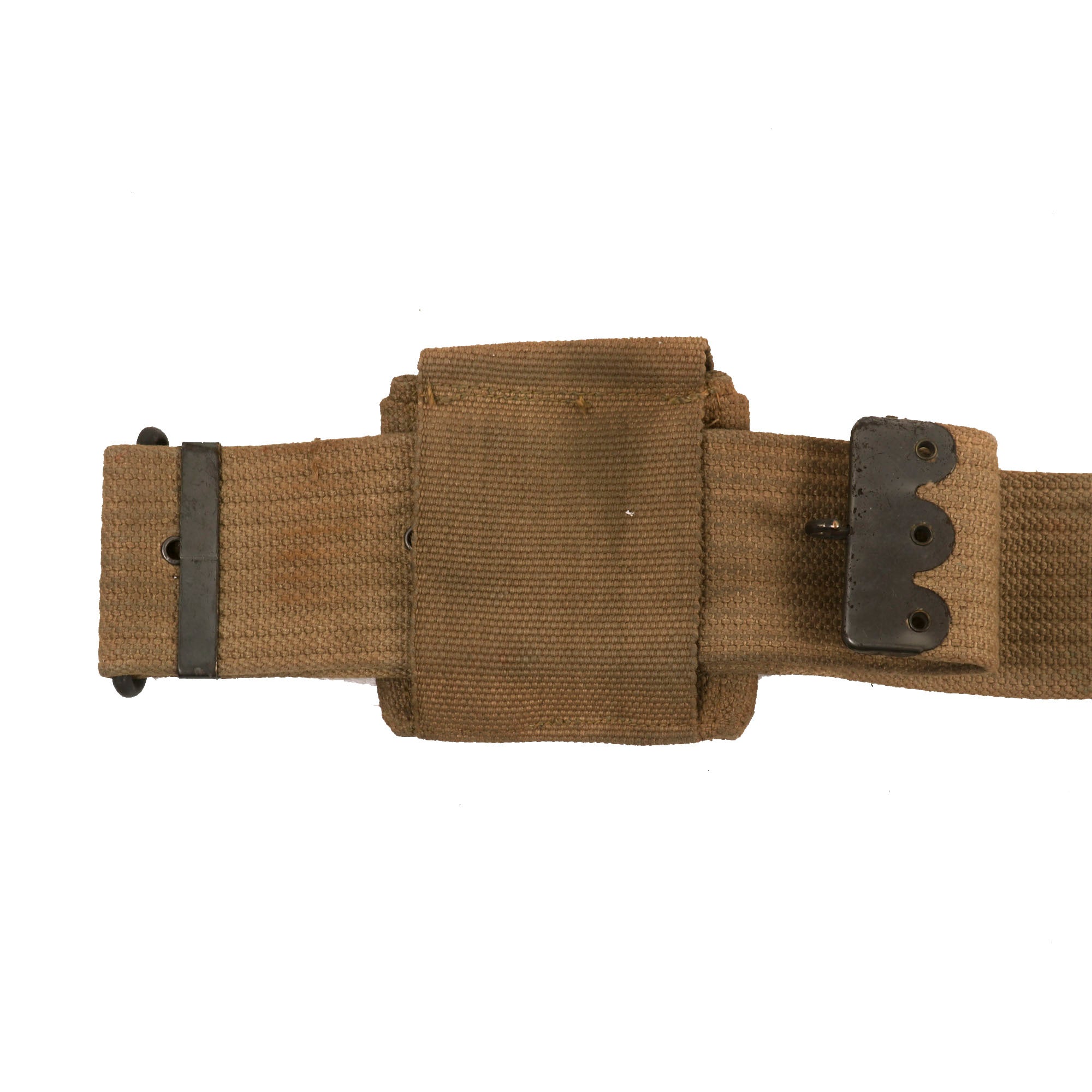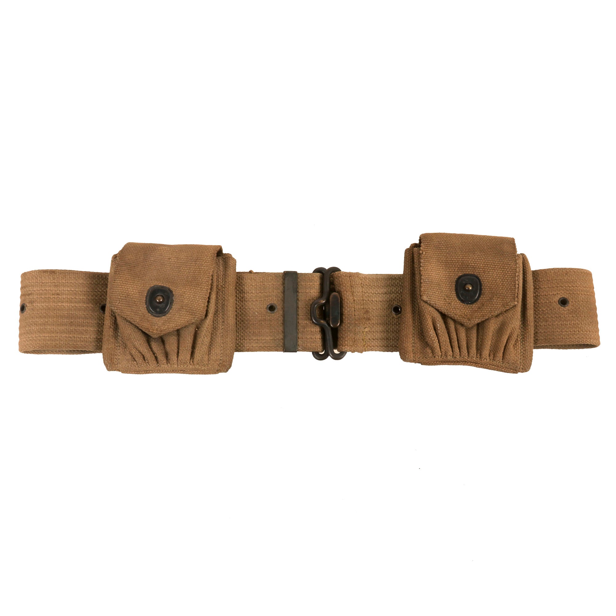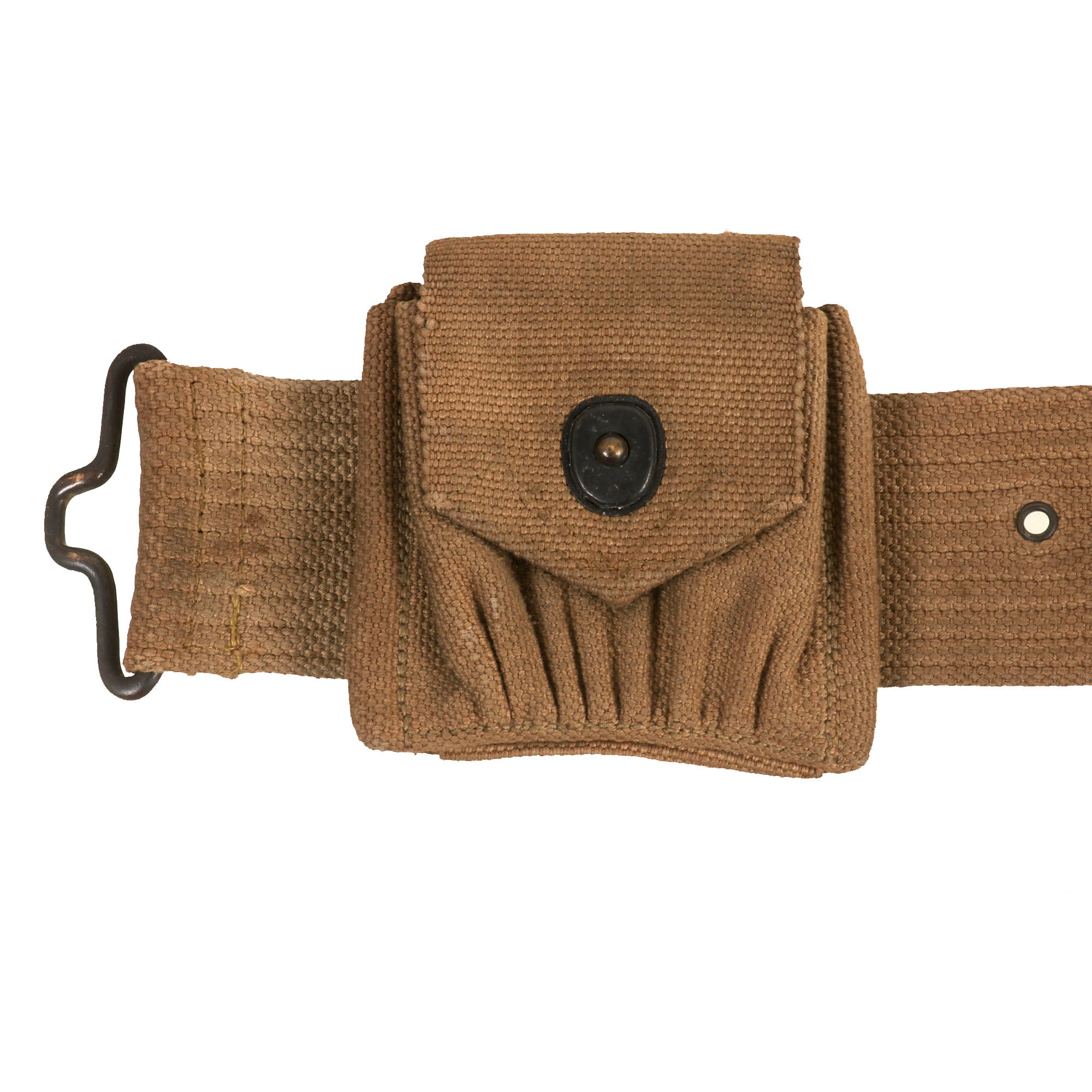 Original Item. Only One Available. This is a seldom-seen example of the M1917 Garrison belt with its original two ammunition pouches. This example is not maker-marked that we could find, which is not uncommon on these wartime examples.This is a dark tan canvas belt with a single line of adjusting grommets through the center of the belt. It has a bronze-finished T-buckle and clasp, with a single size adjusting tab on the interior. The snaps of the pouches are in good order, and there is a small fragment of a junior marksman card in one of the pouches.A lovely example, ready for further research and display.