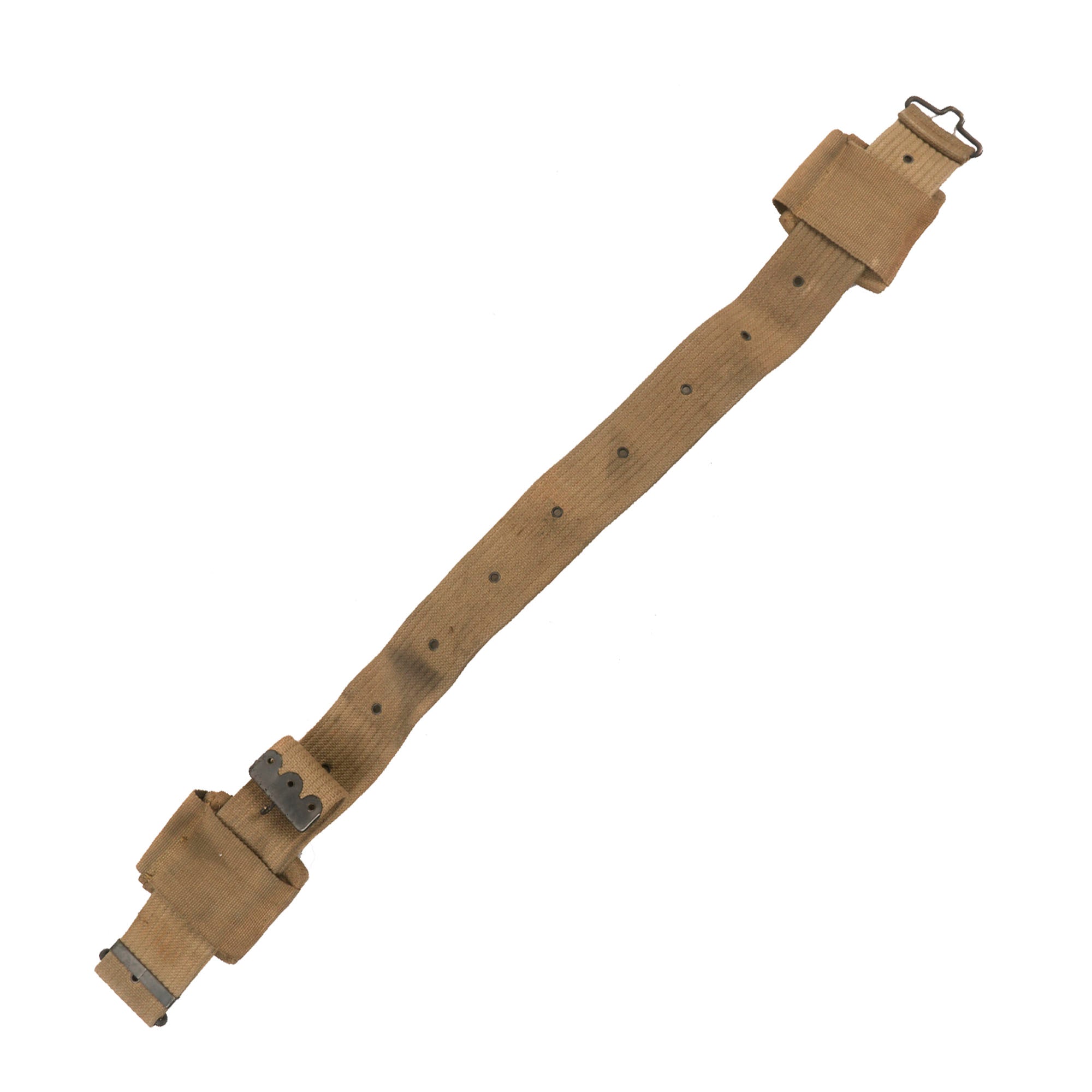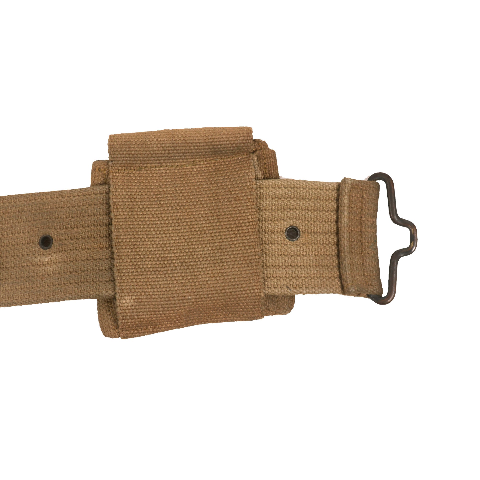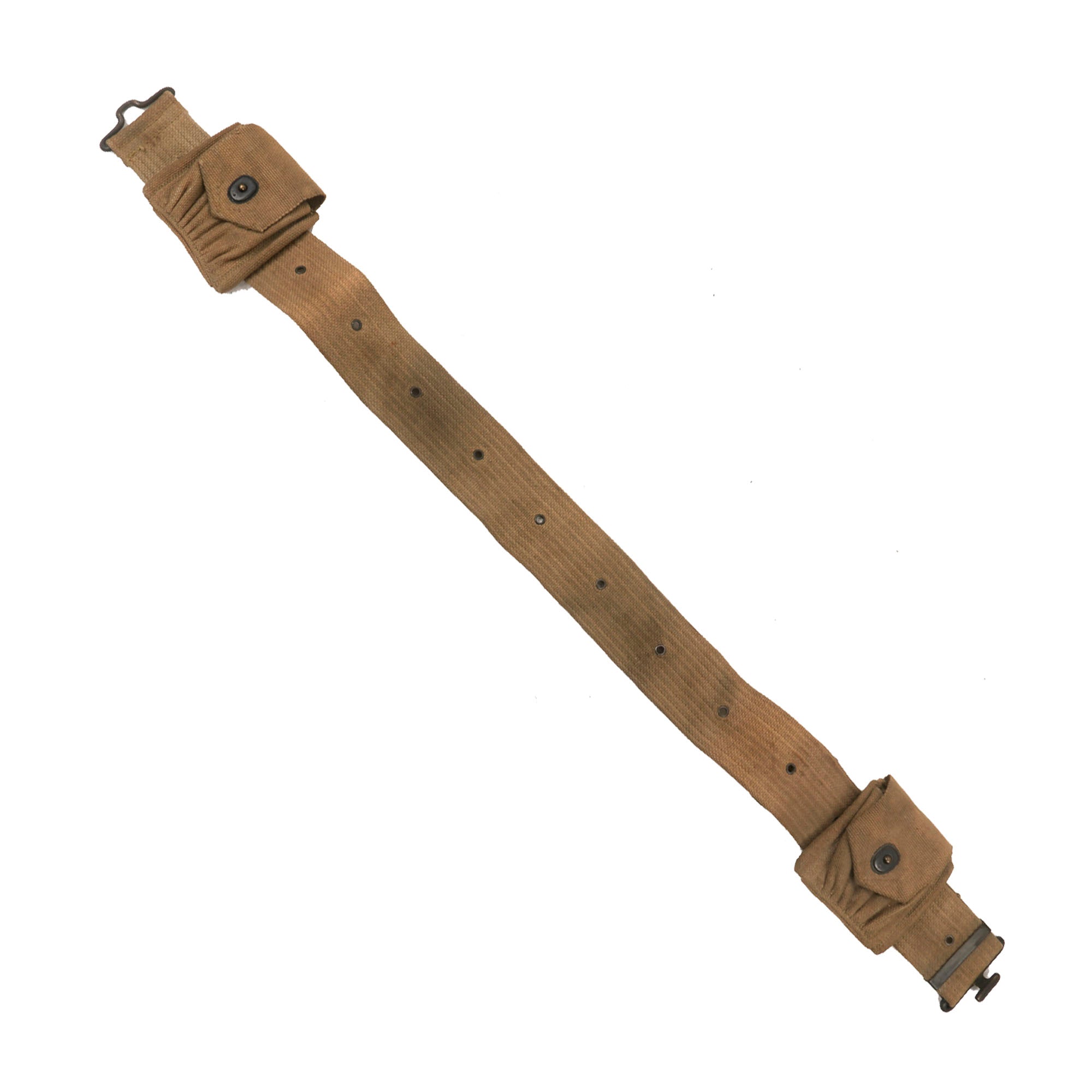 Original Item. Only One Available. This is a seldom-seen example of the M1917 Garrison belt with its original two ammunition pouches. This example is not maker-marked that we could find, which is not uncommon on these wartime examples.This is a dark tan canvas belt with a single line of adjusting grommets through the center of the belt. It has a bronze-finished T-buckle and clasp, with a single size adjusting tab on the interior. The snaps of the pouches are in good order, and there is a small fragment of a junior marksman card in one of the pouches.A lovely example, ready for further research and display.