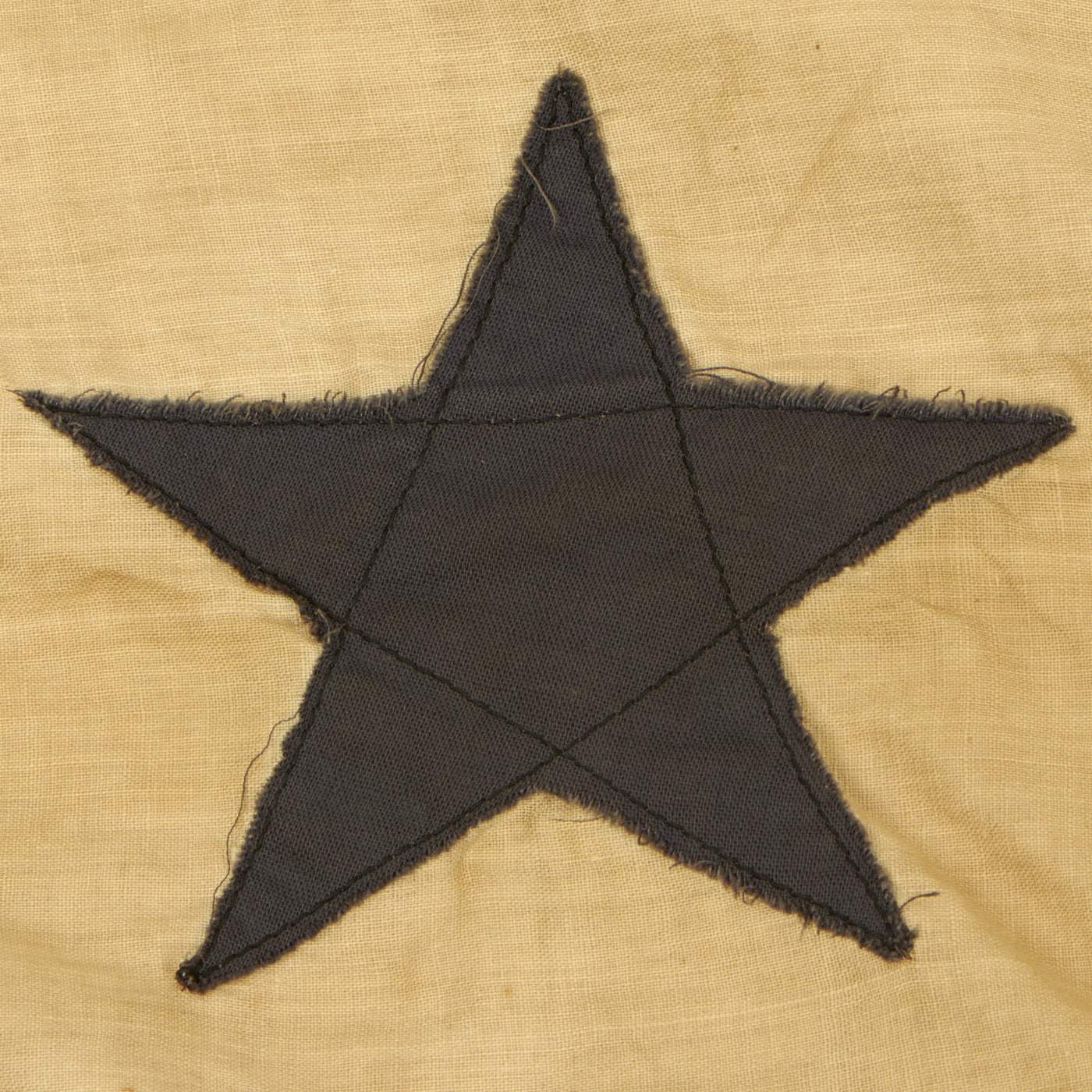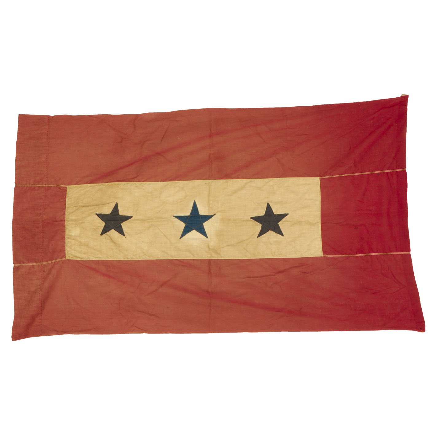 This is a typical example from WWI, with three blue stars for three sons in service, in a nice displayable 32" x 54" size. The flag looks to be made of linen, and is of multi-piece double-sided construction. Looking at the stars, this flag may have been purchased with a single star, and then two additional stars added on the sides, as the center star is a different color than the other two. The flag definitely looks to be of quality construction.
