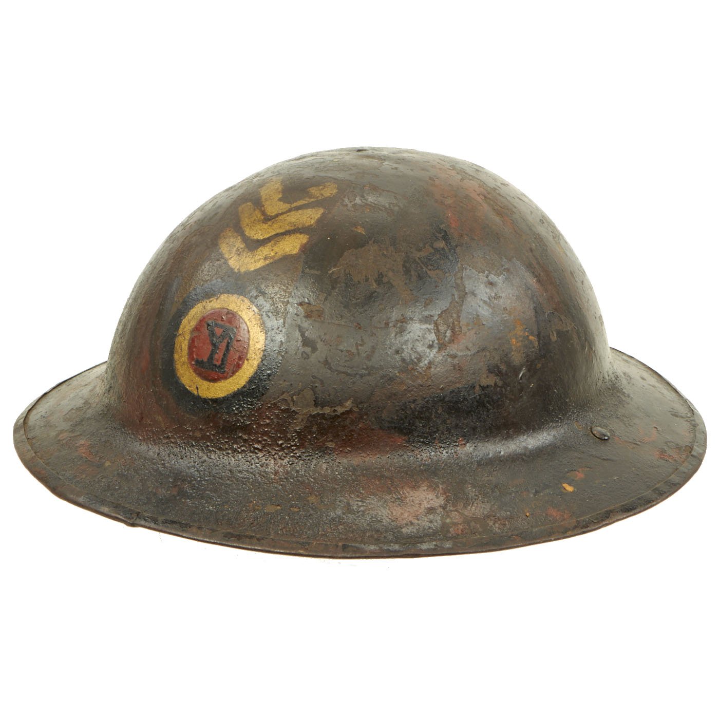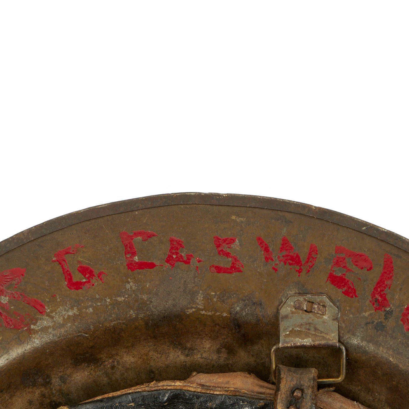 Original Item: One-of-a-kind. This is a fantastic genuine Great War hand painted unt marked camouflage helmet, complete with its original liner and intact, unbroken, chinstrap. Helmet features original period colored camouflage paint in a mottled brown and black smotch pattern. The front of the helmet is painted with a 26th Division Unit Insignia within a Roundel with three gold chevrons painted above the insignia. The chevrons most likely are a representation of overseas service chevrons, which makes sense considering the 26th Division arrived in France in September, 1917. Furthermore, the helmet has the name “R.G.Caswell” painted in red paint on the underside of the helmet.