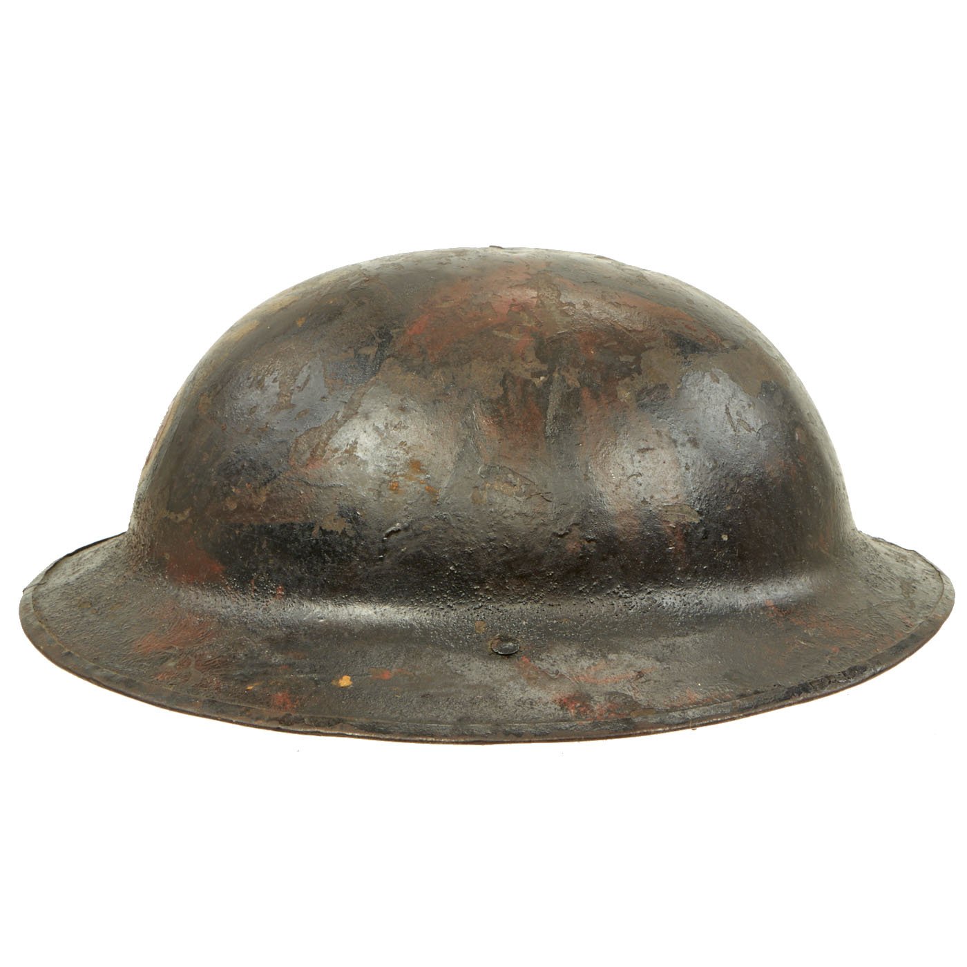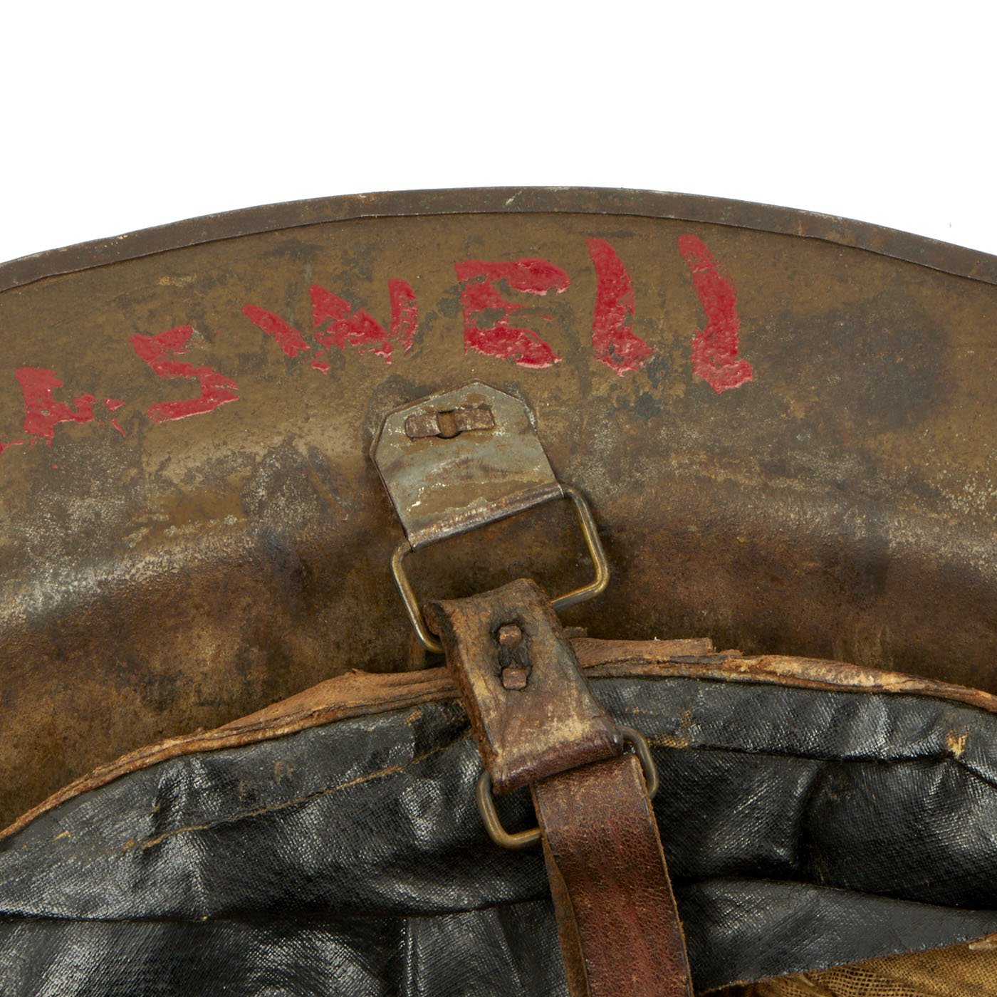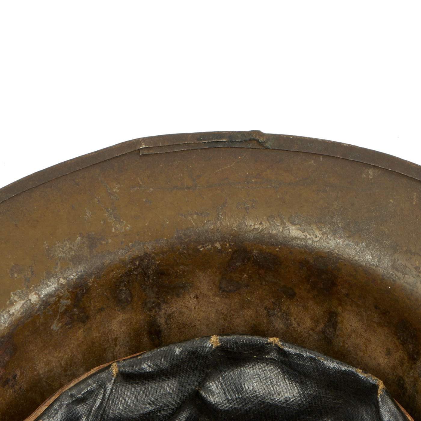 The paint is in good condition and with a nice patina from age. There are some areas of rust and fading of the paint, as well as large areas where it has chipped off, so this helmet definitely saw service. The interior of the helmet has all the original paint, with some paint loss and oxidation. It also has a complete liner with an unbroken intact chinstrap. The liner shows significant age, and the oil cloth liner has had the lacquer separate from the fabric in many areas. The underside of the rim is stamped HS / 392, indicating that the shell is one of the 400,000 British manufactured helmets supplied to the U.S. at their entrance into the war. The split pin rivets attaching the chin-strap bales further confirm this. "HS" is the marking used by Hadfield Ltd of Sheffield, the company that invented the "Hadfield Steel" that these helmets are made of.