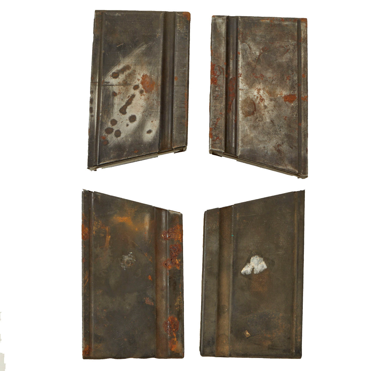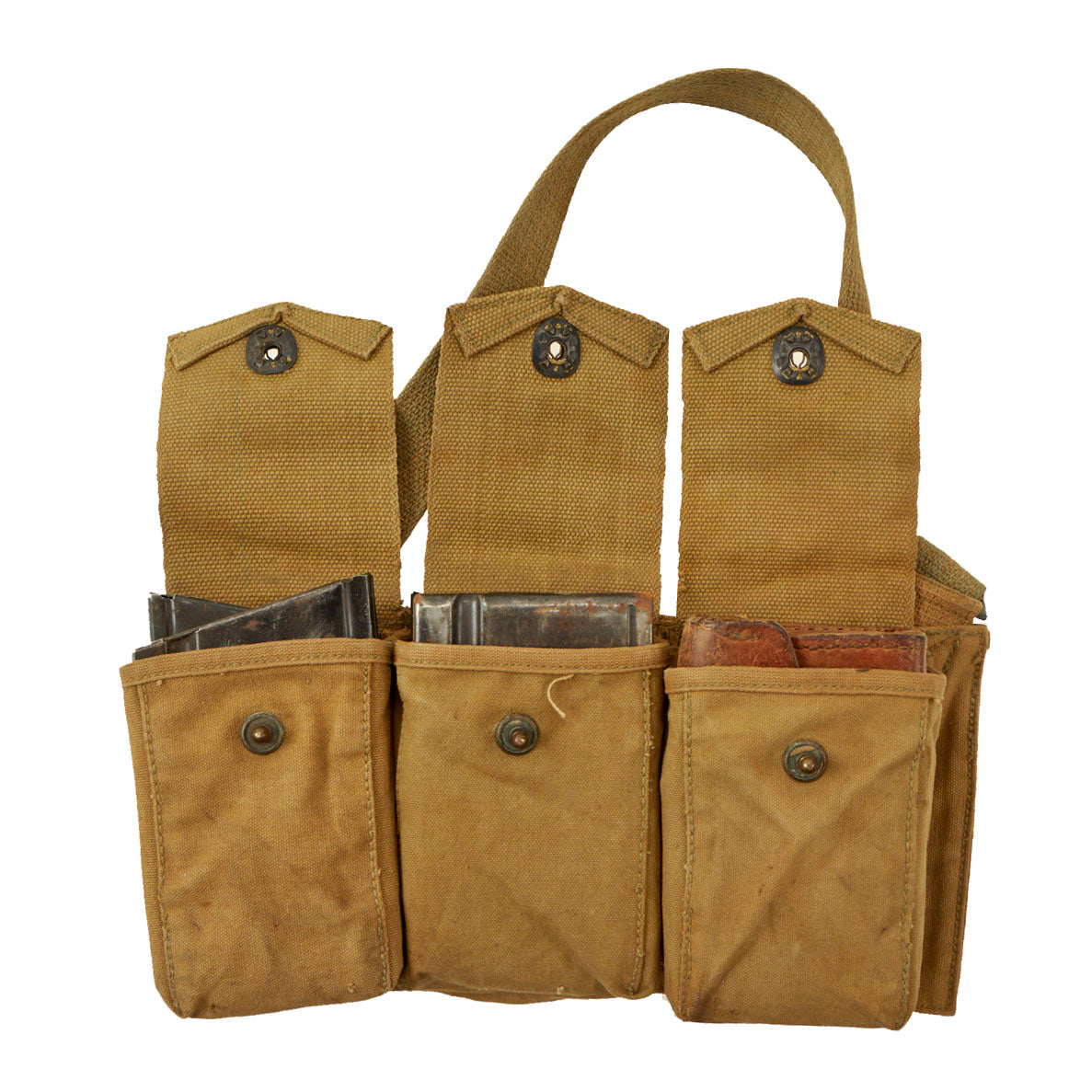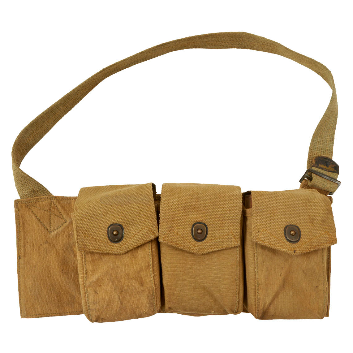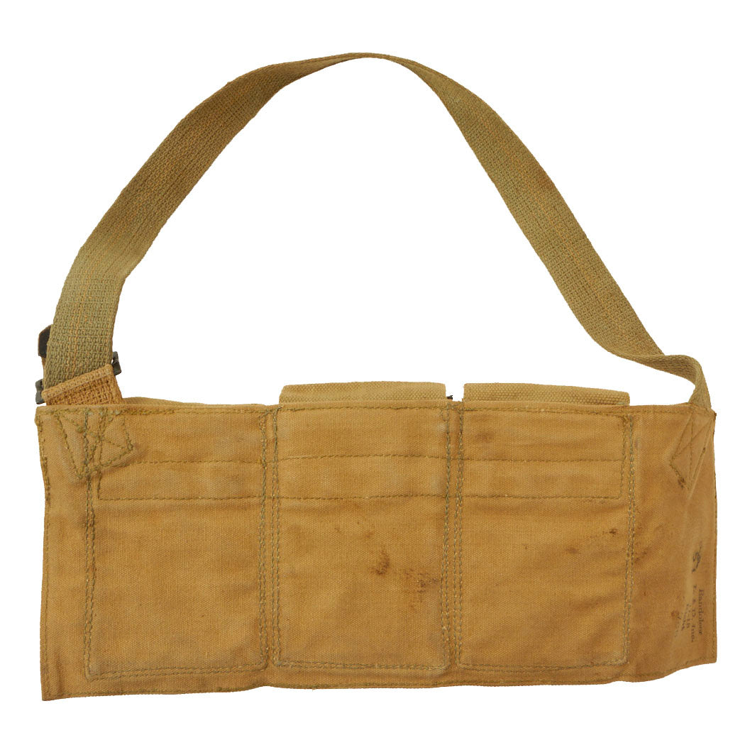 Original Items: Only One Set Available. Great condition original 1918 magazine bandolier for the Browning Automatic Rifle. This WWI pattern badloeer was issued to all BAR gunners and holds six 20 round B.A.R. magazines. Included with this belt are 4 genuine fully functional 1918 BAR 20 round magazines which are in good condition but have areas of surface rust and loss of finish. The canvas bandoleer is nicely marked: