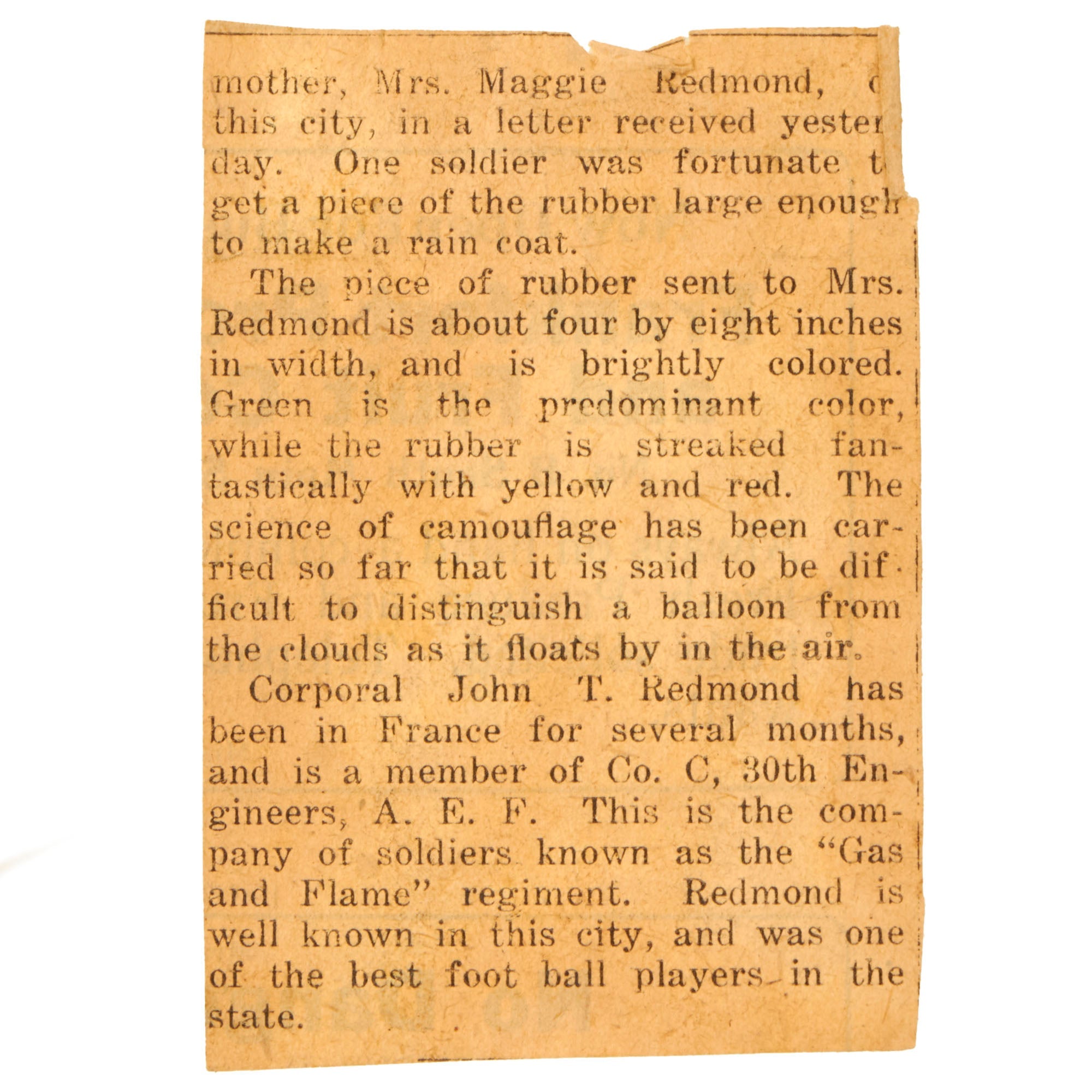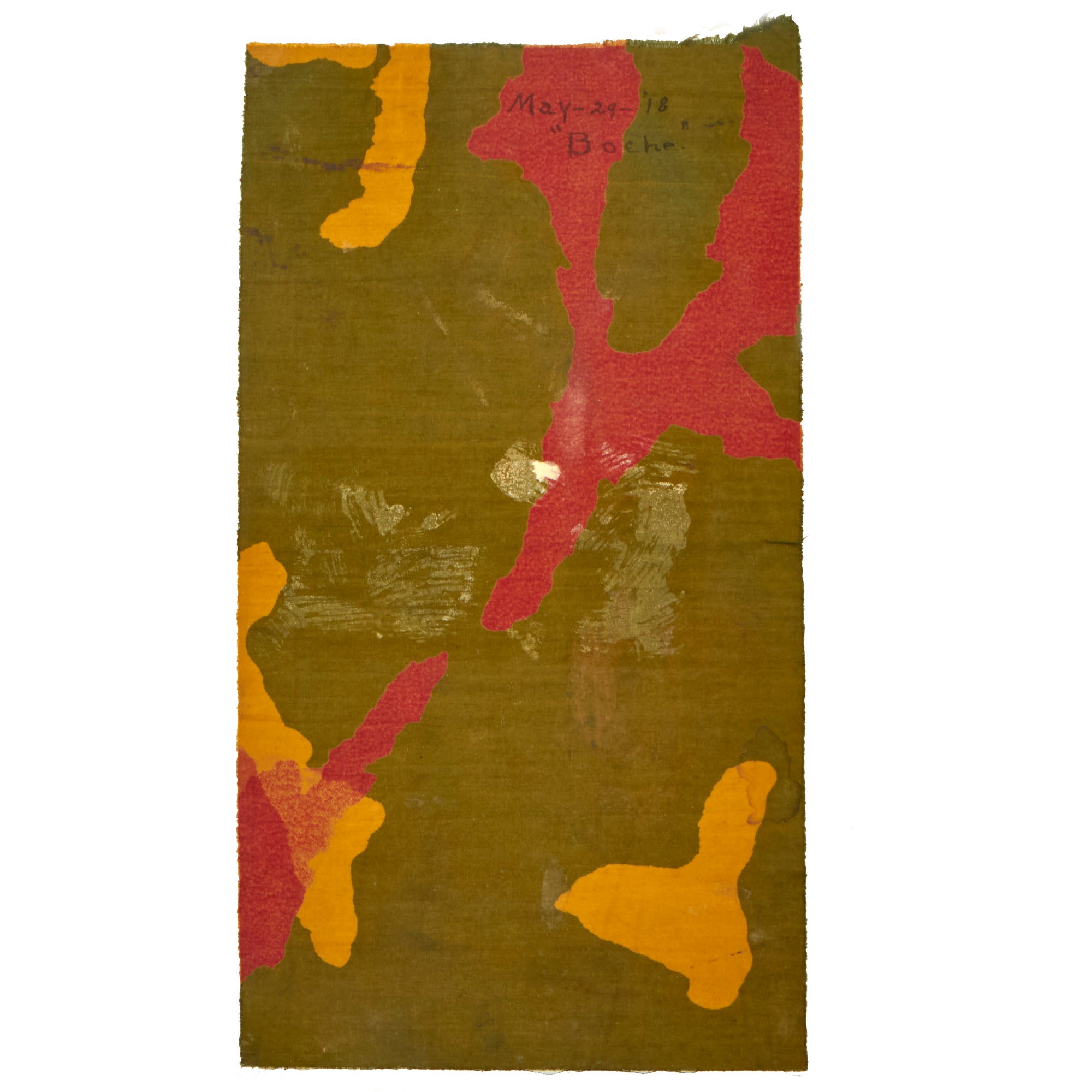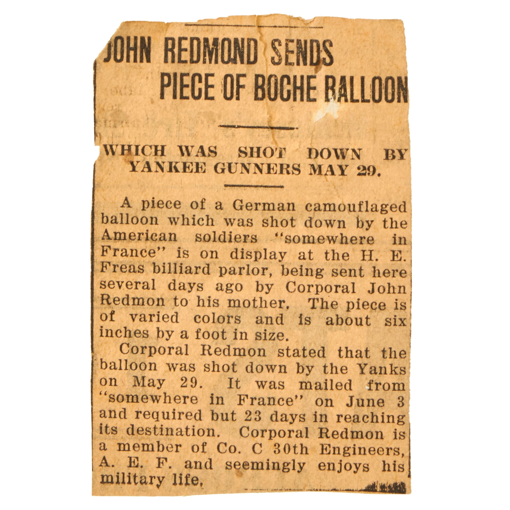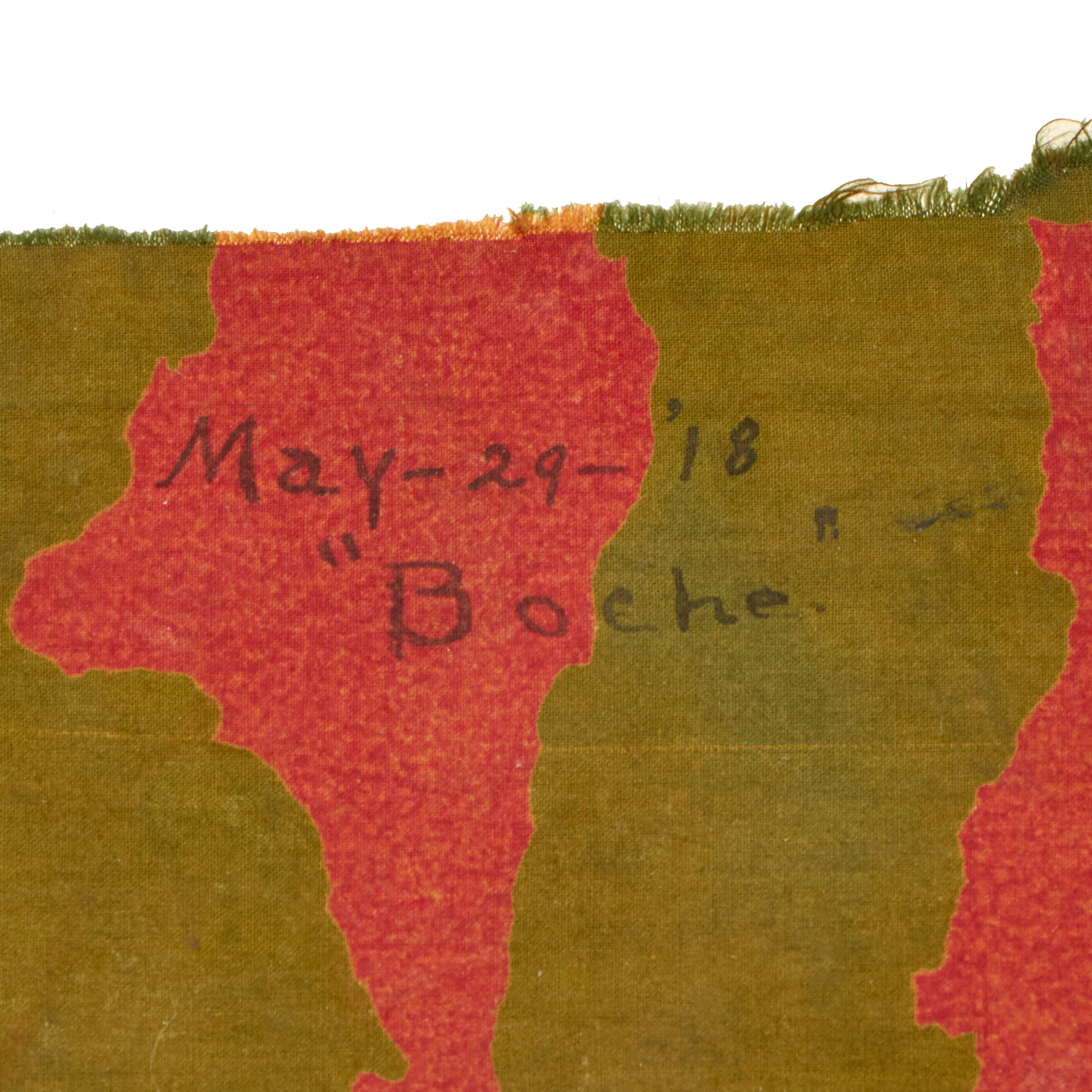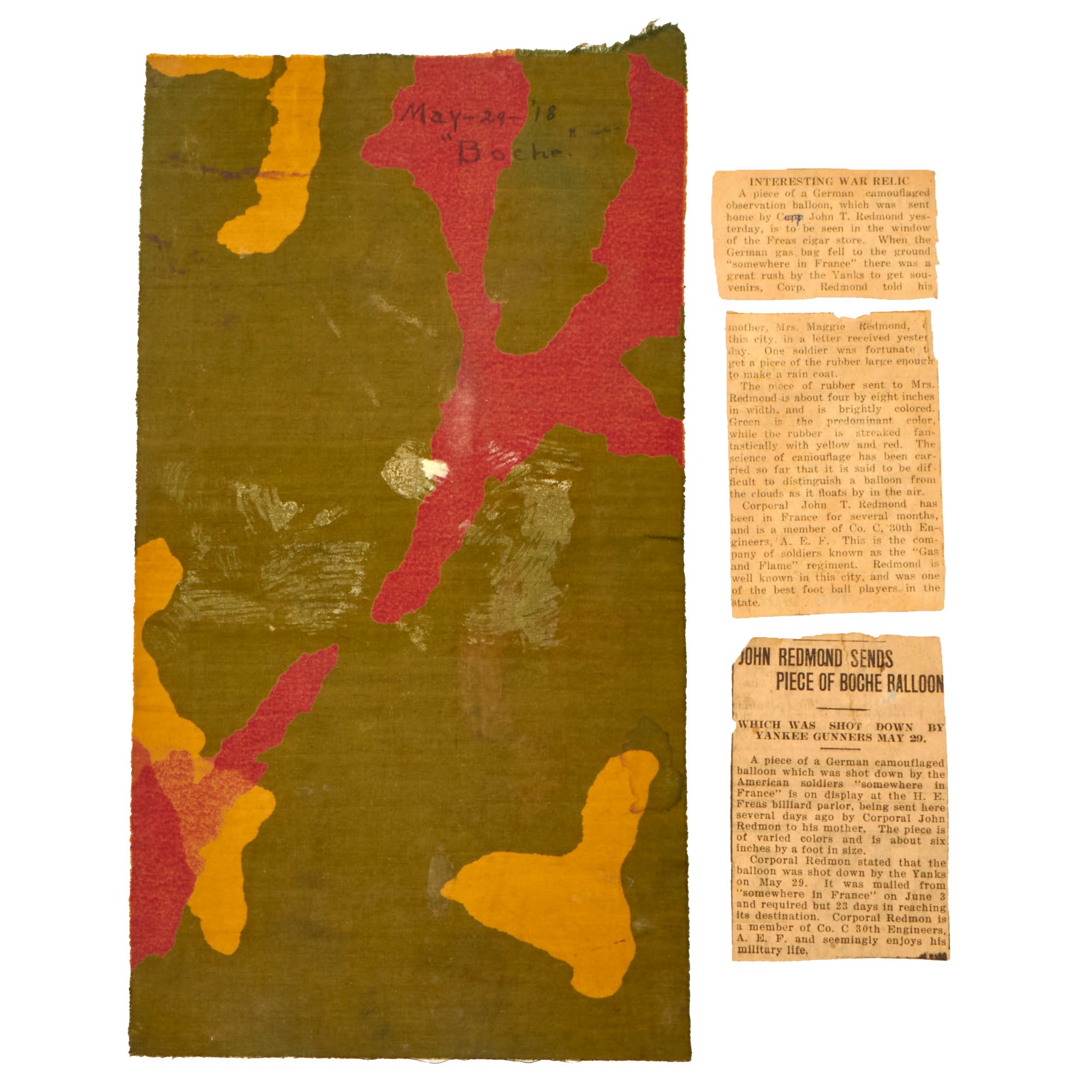 The fabric, primarily green with streaks of yellow and red, is inscribed May-29-’18 / “Boche”. With it are parts of a newspaper article written when Redmon sent the fabric back to his family. The article reads: