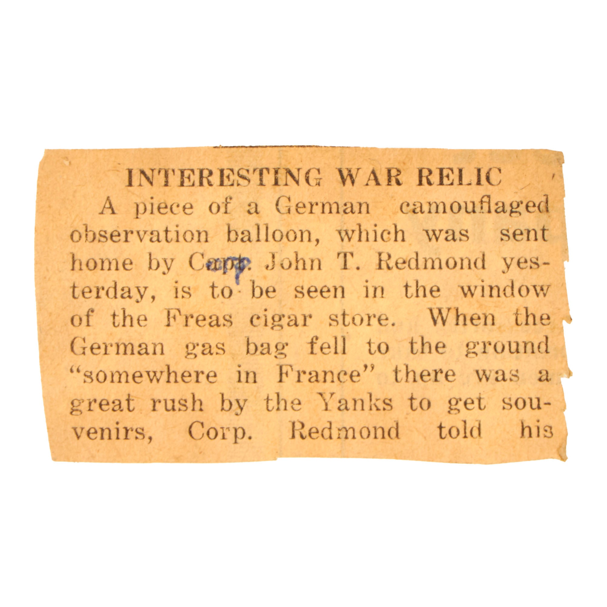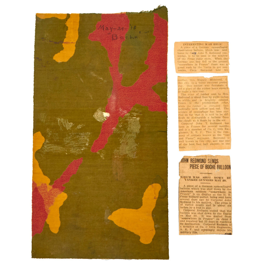 Original Item. One-of-a-Kind. It’s not often that you find an original fragment of German airplane fabric from World War I, but it’s even less often that you find fabric from an observation balloon, let alone with as amazing of provenance as this! This is a colorful 5¾ x 10½” piece of balloon fabric taken on May 29th, 1918 by Sergeant First Class John T. Redmon, Company C, 30th Engineers, later becoming the 1st Gas & Flame Regiment. The 1st G&F were the only unit in the American Expeditionary Forces to see combat, and they saw some of the most brutal fighting in the AEF.