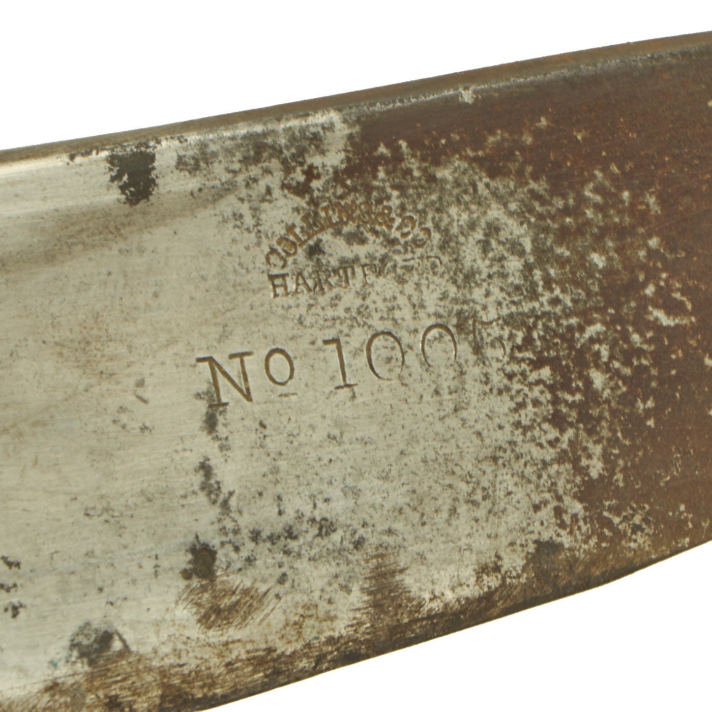 Original Item: Only One Available. This is a fantastic U.S. Army issue Spanish American War and WWI issue Collins Model No 1005 Machete, with a desirable "Green Horn" handle and embossed leather scabbard.