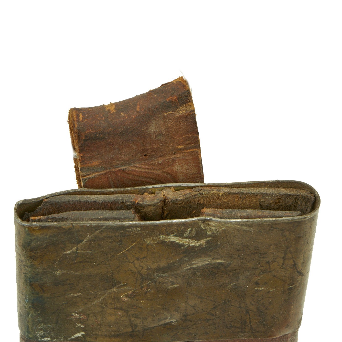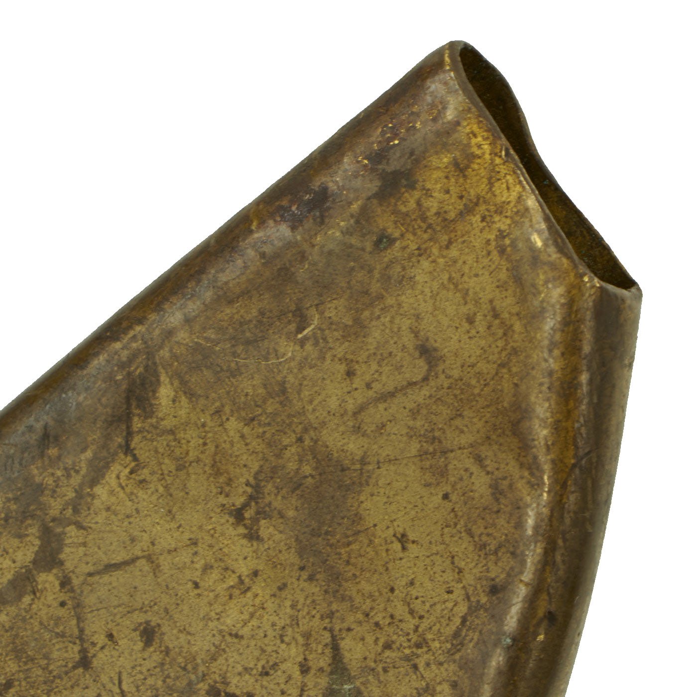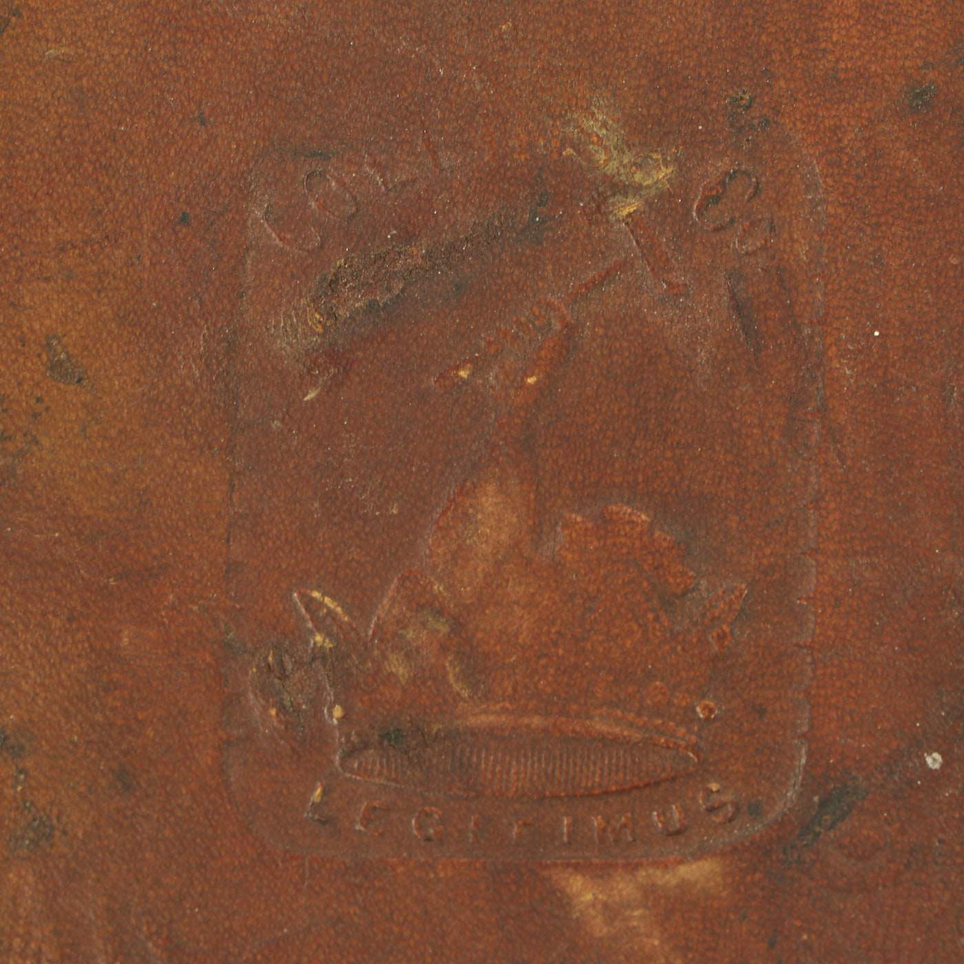 Collins made these from the Spanish American War until shortly after WWl. They were issued with smooth leather scabbards, as well as tooled leather like this example. It has the COLLINS & CO LEGITIMUS logo embossed into the leather, with brass fittings on both ends. The end of the chape is open, which is completely correct, and allows moisture and sap to drip out the bottom. The belt loop is still intact, with some aluminum wire inserted to hand it on a wall.