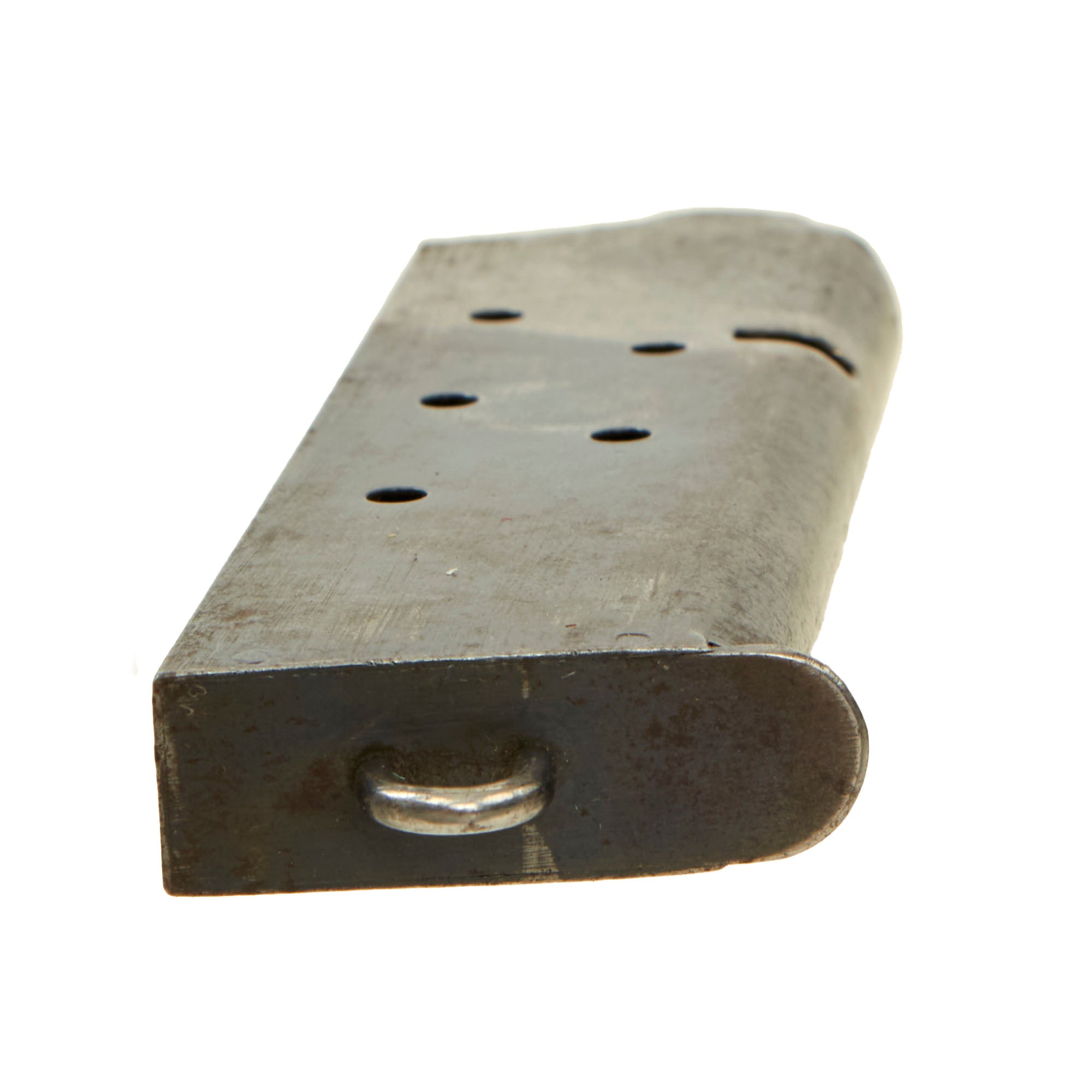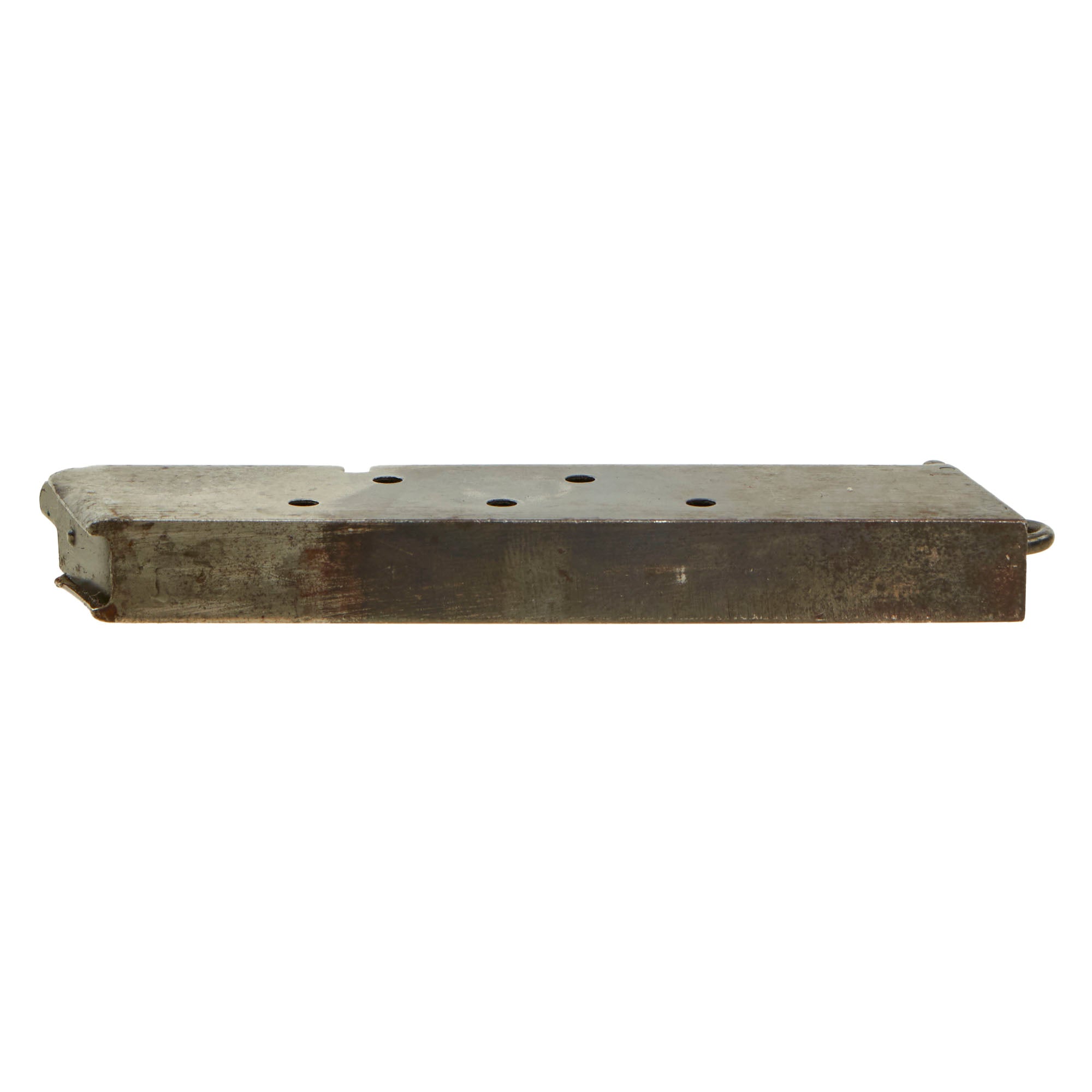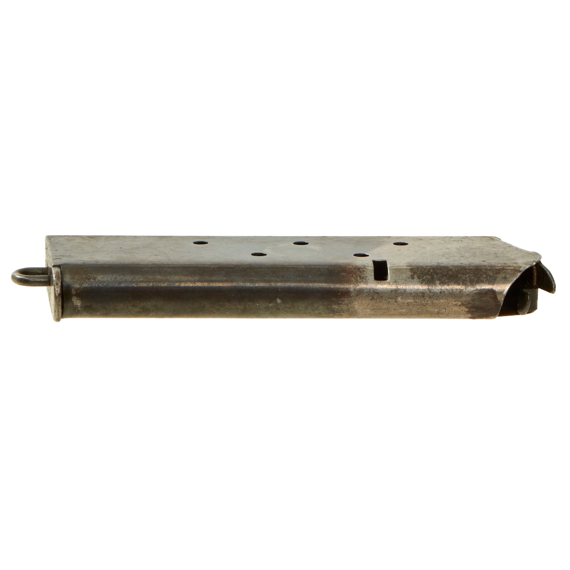 This is a very scarce two-tone magazine for the M1911 semi-automatic pistol. The two-toning of the finish and the lanyard loop on the base of the magazine dates this to the WWI era. There are no markings we can find. There is scratching to the finish.